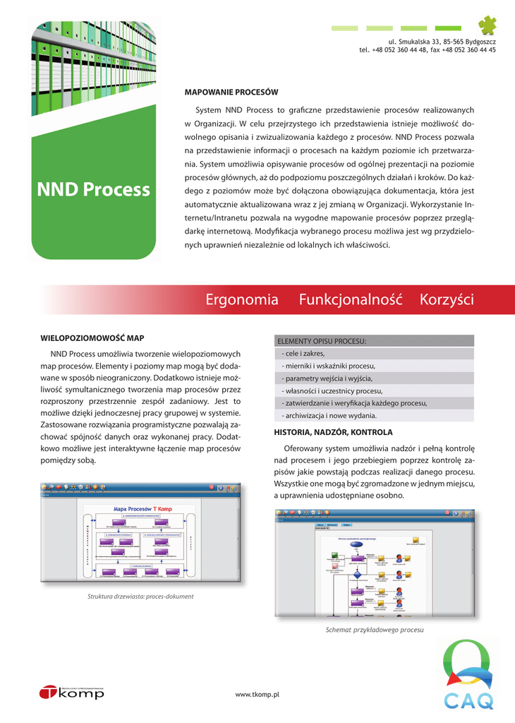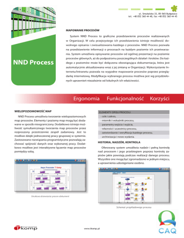 ul. Smukalska 33, 85-565 Bydgoszcz tel. +48 052 360 44 48, fax +48 052 360 44 45 MAPOWANIE PROCESÓW System NND Process to graficzne przedstawienie procesów realizowanych w Organizacji. W celu przejrzystego ich przedstawienia istnieje możliwość dowolnego opisania i zwizualizowania każdego z procesów. NND Process pozwala na przedstawienie informacji o procesach na każdym poziomie ich przetwarzania. System umożliwia opisywanie procesów od ogólnej prezentacji na poziomie NND Process procesów głównych, aż do podpoziomu poszczególnych działań i kroków. Do każdego z poziomów może być dołączona obowiązująca dokumentacja, która jest automatycznie aktualizowana wraz z jej zmianą w Organizacji. Wykorzystanie Internetu/Intranetu pozwala na wygodne mapowanie procesów poprzez przeglądarkę internetową. Modyfikacja wybranego procesu możliwa jest wg przydzielonych uprawnień niezależnie od lokalnych ich właściwości. Ergonomia WIELOPOZIOMOWOŚĆ MAP Funkcjonalność Korzyści ELEMENTY OPISU PROCESU: NND Process umożliwia tworzenie wielopoziomowych map procesów. Elementy i poziomy map mogą być dodawane w sposób nieograniczony. Dodatkowo istnieje możliwość symultanicznego tworzenia map procesów przez rozproszony przestrzennie zespół zadaniowy. Jest to możliwe dzięki jednoczesnej pracy grupowej w systemie. Zastosowane rozwiązania programistyczne pozwalają zachować spójność danych oraz wykonanej pracy. Dodatkowo możliwe jest interaktywne łączenie map procesów pomiędzy sobą. - cele i zakres, - mierniki i wskaźniki procesu, - parametry wejścia i wyjścia, - własności i uczestnicy procesu, - zatwierdzanie i weryfikacja każdego procesu, - archiwizacja i nowe wydania. HISTORIA, NADZÓR, KONTROLA Oferowany system umożliwia nadzór i pełną kontrolę nad procesem i jego przebiegiem poprzez kontrolę zapisów jakie powstają podczas realizacji danego procesu. Wszystkie one mogą być zgromadzone w jednym miejscu, a uprawnienia udostępniane osobno. Struktura drzewiasta: proces-dokument Schemat przykładowego procesu www.tkomp.pl INTUICYJNA I PRZYJAZNA PRACA System wyposażony został w przyjazny użytkownikowi interfejs. Dzięki niemu możliwe stało się intuicyjne przemieszczanie między poszczególnymi poziomami mapy procesu. W celu zachowania transparentności zachodzących procesów, na każdym etapie możliwe jest przypisanie dokumentów i zapisów danego etapu do danego procesu. Ważnym elementem jest kontrola widoku wydruku, która umożliwia drukowanie map procesów z możliwością podziału na strony A4 lub A3. INTEGRALNOŚĆ Szerokie możliwości systemu wynikają z zastosowania rozwiązań umożliwiających integrację z innymi systemami (w tym z innymi modułami systemu NND Integrum). Dzięki temu możliwa stała się integracja schematów procesów z dokumentem. Poprzez pojedyncze kliknięcie możliwe jest przejście z procesu do dokumentu i odwrotnie. Dzięki temu możliwy stał się szybki wgląd w strukturę procesów i dokumentów z nimi związanych. Wraz z naniesieniem jakichkolwiek zmian następuje automatyczna aktualizacja map procesów oraz nadzorowanych dokumentów za pomocą modułu NND 9000. Sprawia to, że procesy oparte są zawsze tylko o obowiązującą w danej Organizacji dokumentację. RAPORTOWANIE W celu zapewnienia pełnej prezentacji danych zawartych w systemie NND Process zastosowano rozbudowane narzędzie umożliwiające raportowanie danych. Dzięki temu możliwe stało się dowolne raportowanie procesu po ich atrybutach min. wg wskaźników i mierników czy też zakresów kompetencji danego procesu organizacji. Dodatkowo mapy procesów zintegrowano z elastycznym schematem drzewa organizacyjnego firmy. GŁÓWNE KORZYŚCI: - skrócenie czasu potrzebnego na stworzenie, prezentację, dystrybucję i analizę procesów, - możliwość zdalnej pracy wielu użytkowników - rysowanie map procesów przez właścicieli/ liderów procesów przy jednoczesnej zdalnej pracy z konsultantem lub liderem projektu, - ułatwienie w poruszaniu się po strukturze procesowej organizacji oraz w dotarciu do ważnych i obowiązujących informacji, - doskonałe narzędzie wspomagające ciągłe doskonalenie procesów biznesowych w każdej organizacji. Proces w trybie edycji Dane kontaktowe: Twój lokalny przedstawiciel: ul. Smukalska 33, Bydgoszcz 85-565 [email protected] Tel.: +48 (52) 360 44 48 Fax: +48 (52) 360 44 45 NIP: 953-106-55-92 REGON: 09138515 Dane kontaktowe www.tkomp.pl