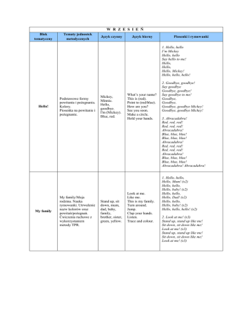 W R Z E S I E Ń Blok tematyczny Tematy jednostek metodycznych Język czynny Język bierny Piosenki i rymowanki 1. Hello, hello I’m Mickey Hello, hello Say hello to me! Hello, Hello, Hello, Mickey! Hello, hello, hello! Hello! My family Podstawowe formy powitania i pożegnania. Kolory. Piosenka na powitanie i pożegnanie. My family/Moja rodzina. Nauka rymowanki. Utrwalenie nazw kolorów oraz powitań/pożegnań. Ćwiczenia ruchowe z wykorzystaniem metody TPR. Mickey, Minnie. Hello, goodbye. I'm (Mickey). Blue, red. Stand up, sit down, mum, dad, baby, family, brother, sister, green, yellow. What’s your name? This is (red). Point to (red/blue). How are you? See you soon. Make a circle. Hold your hands. Look at me. Like me. This is my family. Turn around. Jump. Clap your hands. Listen. Trace and colour. 2. Goodbye, goodbye! Say goodbye Goodbye, goodbye! Say goodbye to me! Goodbye, Goodbye, Goodbye, goodbye Mickey! Goodbye, goodbye Mickey! 3. Abracadabra! Red, red, red! Red, red, red! Abracadabra! Blue, blue, blue! Blue, blue, blue! Abracadabra! Red, red, red! Red, red, red! Abracadabra! Blue, blue, blue! Blue, blue, blue! Abracadabra! Abracadabra! 1. Hello, hello, Hello, Mum! (x2) Hello, hello, Hello, baby! (x2) Hello, hello, Hello, Dad! (x2) Hello, hello, Hello, baby! (x2) Hello, hello, hello! (x2) 2. Look at me! (x3) Stand up, stand up like me! Sit down, sit down like me! Look at me! (x3) Stand up, stand up like me! Sit down, sit down like me! Look at me! (x3)