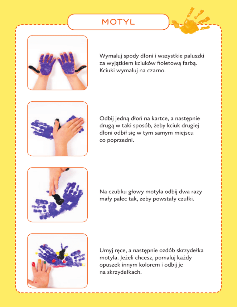 ośmiornica motyl Wymaluj spody dłoni i wszystkie paluszki za wyjątkiem kciuków fioletową farbą. Kciuki wymaluj na czarno. Odbij jedną dłoń na kartce, a następnie drugą w taki sposób, żeby kciuk drugiej dłoni odbił się w tym samym miejscu co poprzedni. Na czubku głowy motyla odbij dwa razy mały palec tak, żeby powstały czułki. Umyj ręce, a następnie ozdób skrzydełka motyla. Jeżeli chcesz, pomaluj każdy opuszek innym kolorem i odbij je na skrzydełkach. kot Pomarańczową farbą wymaluj do połowy spód dłoni, kciuk i mały palec. Rozłącz palce i odbij dłoń na kartce. Mały palec odbij cztery razy tak, żeby powstały nóżki. Opuszek środkowego palca wymaluj na pomarańczowo. Na odbitym końcu kciuka namaluj kółko i wymaluj je paluszkiem, później tym samym paluszkiem na czubku głowy domaluj uszy. Opuszek małego palca wymaluj na czarno, odbij na pomarańczowym kółku (głowie kota) tak, żeby powstały oczy. Jeżeli chcesz, zaciśnij dłoń w pięść i brzeg dłoni pomaluj na biało. Zaciśniętą dłoń odbij kilka razy na tułowiu kota. Tak powstanie niepowtarzalne umaszczenie.