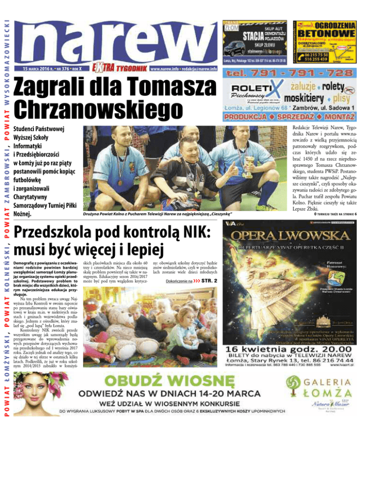P O W I AT Ł O M Ż Y Ń S K I , P O W I AT KO L N E Ń S K I , P O W I AT Z A M B R O W S K I , P O W I AT W Y S O KO M A ZO W I E C K I reklama 15 MARCA 2016 R. l NR 376 l ROK X www.narew.info [email protected] l Zagrali dla Tomasza Chrzanowskiego Studenci Państwowej Wyższej Szkoły Informatyki i Przedsiębiorczości w Łomży już po raz piąty postanowili pomóc kopiąc futbolówkę i zorganizowali Charytatywny Samorządowy Turniej Piłki Nożnej. Redakcje Telewizji Narew, Tygodnika Narew i portalu www.narew.info z wielką przyjemnością patronowały rozgrywkom, podczas których udało się zebrać 1450 zł na rzecz niepełnosprawnego Tomasza Chrzanowskiego, studenta PWSiP. Postanowiliśmy także nagrodzić „Najlepsze cieszynki”, czyli sposoby okazywania radości ze zdobytego gola. Puchar trafił zespołu Powiatu Kolno. Pięknie cieszyły się także Lepsze Żbiki. Drużyna Powiat Kolno z Pucharem Telewizji Narew za najpiękniejszą „Cieszynkę” Przedszkola pod kontrolą NIK: musi być więcej i lepiej Demografięz powiązaniuz oczekiwaniami rodziców powinien bardziej uwzględniaćsamorządŁomżyplanującorganizacjęsystemuopiekiprzedszkolnej. Podstawow y problem to brakmiejscdlawszystkichdzieci,którym najwcześniejsza edukacja przysługuje. Na ten problem zwraca uwagę Najwyższa Izba Kontroli w swoim raporcie po przeanalizowaniu stanu bazy oświatowej w kraju m.in. w niektórych miastach i gminach województwa podlaskiego. Jednym z ośrodków, który znalazł się „pod lupą” była Łomża. Kontrolerzy NIK zwrócili przede wszystkim uwagę jak samorządy będą przygotowane do wprowadzenia nowych przepisów dotyczących wychowania przedszkolnego od 1 września 2017 roku. Zaczęli jednak od analizy tego, co się działo w tej sferze w ostatnich kilku latach. Podkreślili, że już w roku szkolnym 2014/2015 zabrakło w łomżyń- skich placówkach miejsca dla około 60 trzy i czterolatków. Na nieco mniejszą skalę problem powtórzył się także w następnym. Edukacyjny sezon 2016/2017 może być pod tym względem krytycz- ny: obowiązek szkolny dotyczyć będzie znów siedmiolatków, czyli w przedszkolach zostanie wiele dzieci młodszych Dokończenie na ááá STR. 2 O TuR NIE ju TAK ŻE NA STRO NIE 6 2 / wydArZeniA www.narew.info 15 marca 2016 Łomżyńska senator Anna Maria Anders już w pracy Niedługo świętowała wyborczy sukcesw okręgułomżyńsko– suwalskim Anna Maria Anders. Głosowanie zakończyło się w niedzielę wieczorem, wyniki ogłoszone zostały w poniedziałek, a już w środę otrzymała zaświadczenie o wyborze z rąk wiceprzewodniczącegoPaństwowejKomisji Wyborczej Sylwestra Marciniaka. I „z marszu” nowa pani senator złożyła senatorskie ślubowanie i wzięłaudziałw posiedzeniutejIzby parlamentu. Anna Maria Anders wygrała wybory uzupełniające do Senatu w okręgu nr 59, który tworzą Łomża, Suwałki oraz powiaty: łomżyński, suwalski, augustowski, grajewski, kolneński, moniecki, sejneński i zambrowski zarządzone, ponieważ poprzedni senator, Bohdan Paszkowski, został wojewodą podlaskim. Reprezentantka Prawa i Sprawiedliwości pokonała Mieczysława Bagińskie- go z PSL, popieranego też przez PO i Nowoczesną. Dalsze miejsca zajęli Jerzy Ząbkiewicz z własnego komitetu wyborczego, Szczepan Barszczewski z partii KORWiN, Sławomir Gromadzki z własnego komitetu i Andrzej Chmielewski z Samoobrony. Jak informuje strona Senatu RO, wiceprzewodniczący PKW WiesławMarciniak podkreślił, że ta uroczystość ma „olbrzymie znaczenie historyczne i symboliczne”. Przypomniał także uchwałę Senatu z 2006 roku w sprawie ogłoszenia roku 2007 rokiem gen. Andersa. „Senat Rzeczypospolitej Polskiej czyni to dla uczczenia pamięci znamienitego Polaka generała Władysława Andersa – wybitnego dowódcy i polityka oraz dla uhonorowania pamięci jego żołnierzy, których wyprowadził z +imperium zła+ i wiódł zwycięskim szlakiem do ojczyzny przez Monte Cassino i Bolonię, żołnierzy, którym ojcował do końca kaj. Marszałek Senatu, Stanisław Karczewski powitał Annę Marię Anders, senatora Ziemi Łomżyńskiej swoich dni na wychodźstwie” – głosi uchwała. W uroczystości objęcia mandatu przez Annę Marię Anders wzięli udział marszałek Senatu Stanisław Karczewski, przedstawiciele Konwentu i Prezydium Senatu, a także szef Krajowego Biura Wyborczego, sekretarz PKW Beta To- Anna Maria Anders powiedziała, że to dla niej wyjątkowy dzień. „Jestem wzruszona, naprawdę wzruszona. Myślę sobie, jakby ojciec się cieszył” – powiedziała córka generała. Senacka strona podaje także oficjalną notę biograficzną Anny Marii Anders: Urodziła się 22 listopada 1950 r. Jest córką generała Władysława Andersa i Ireny Anders. Ukończyła filologię romańską na brytyjskiej uczelni University of Bristol, a także uzyskała tytuł MBA z ekonomii na amerykańskim Boston University. Wieloletnia działaczka polonijna, po śmierci matki przejęła obowiązki prezesa zarządu Fundacji im. Generała Władysława Andersa. W 2016 r. została przewodniczącą Rady Ochrony Pamięci Walk i Męczeństwa oraz pełnomocnikiem Prezesa Rady Ministrów ds. dialogu międzynarodowego w randze sekretarza stanu. Zaczyna się nabór do łomżyńskich przedszkoli PSL po wyborach: jutro może być lepiej od 15do 31marca(do godz. 15)przedszkolasamorządowew Łomżyoczekująna zgłoszeniana rokszkolny 2016/2017.o przyjęciuniedecydujekolejnośćzgłoszeń. Urząd Miejski przypomina, że: „Dziecko w wieku 6 lat (urodzone w 2010 r.) jest obowiązane odbyć roczne przygotowanie przedszkolne w oddziałach przedszkolnych w szkołach podstawowych lub w przedszkolach. Dzieci w wieku 4 lat (urodzone w 2012 r.) i 5 lat (urodzone w 2011 r.) mają prawo do realizacji wychowania przedszkolnego uczęszczając do przedszkola lub oddziału przedszkolnego w szkole podstawowej”. Zapisywaniedzieckado przedszkolapo raz pierwszy Rodzice zapisuj