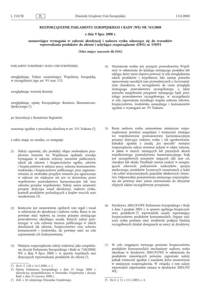 L 218/30 PL Dziennik Urzędowy Unii Europejskiej 13.8.2008 ROZPORZĄDZENIE PARLAMENTU EUROPEJSKIEGO I RADY (WE) NR 765/2008 z dnia 9 lipca 2008 r. ustanawiające wymagania w zakresie akredytacji i nadzoru rynku odnoszące się do warunków wprowadzania produktów do obrotu i uchylające rozporządzenie (EWG) nr 339/93 (Tekst mający znaczenie dla EOG) PARLAMENT EUROPEJSKI I RADA UNII EUROPEJSKIEJ, (4) Niezmiernie trudne jest przyjęcie prawodawstwa Wspólnoty w odniesieniu do każdego istniejącego produktu lub takiego, który może dopiero powstać; w celu uwzględnienia takich produktów i wypełnienia luki istnieje potrzeba opracowania szerokich ram prawodawczych o horyzontalnym charakterze, w szczególności do czasu przeglądu istniejącego prawodawstwa szczegółowego, a także potrzeba uzupełnienia przepisów istniejącego bądź przyszłego prawodawstwa szczegółowego, w szczególności w celu zapewnienia wysokiego stopnia ochrony zdrowia, bezpieczeństwa, środowiska naturalnego i konsumentów zgodnie z wymogami art. 95 Traktatu. (5) Ramy nadzoru rynku ustanowione niniejszym rozporządzeniem powinny uzupełniać i wzmacniać istniejące we wspólnotowym prawodawstwie harmonizacyjnym przepisy dotyczące nadzoru rynku i ich egzekwowanie. Jednakże zgodnie z zasadą „lex specialis” niniejsze rozporządzenie należy stosować jedynie w takim zakresie, w jakim w innych, istniejących lub przyszłych aktach wspólnotowego prawodawstwa harmonizacyjnego brak jest szczegółowych przepisów mających taki sam cel, charakter lub skutki. Przykłady można znaleźć w następujących sektorach: prekursorów narkotyków, sprzętu medycznego, produktów leczniczych stosowanych u ludzi i do celów weterynaryjnych, pojazdów silnikowych i lotnictwa. Odpowiednie postanowienia niniejszego rozporządzenia nie powinny mieć zatem zastosowania do obszarów objętych takimi szczegółowymi przepisami. (6) Dyrektywa 2001/95/WE Parlamentu Europejskiego i Rady z dnia 3 grudnia 2001 r. w sprawie ogólnego bezpieczeństwa produktów (4) wprowadziła zasady zapewniające bezpieczeństwo produktów konsumenckich. Organy nadzoru rynku powinny mieć możliwość podjęcia bardziej szczegółowych działań dostępnych na mocy tej dyrektywy. (7) W celu osiągnięcia wyższego poziomu bezpieczeństwa produktów konsumenckich mechanizmy nadzoru rynku określone w dyrektywie 2001/95/WE w odniesieniu do produktów stanowiących poważne zagrożenie należy jednak wzmocnić zgodnie z zasadami, które ustanowiono w niniejszym rozporządzeniu. W związku z tym należy wprowadzić odpowiednie zmiany w dyrektywie 2001/95/ WE. uwzględniając Traktat ustanawiający Wspólnotę Europejską, w szczególności jego art. 95 oraz 133, uwzględniając wniosek Komisji, uwzględniając opinię Europejskiego Komitetu EkonomicznoSpołecznego (1), po konsultacji z Komitetem Regionów, stanowiąc zgodnie z procedurą określoną w art. 251 Traktatu (2), a także mając na uwadze, co następuje: (1) Należy zapewnić, aby produkty objęte swobodnym przepływem towarów we Wspólnocie spełniały wysokie wymagania w zakresie ochrony interesów publicznych, takich jak zdrowie i bezpieczeństwo ogólne, zdrowie i bezpieczeństwo w miejscu pracy, ochrona konsumentów, środowiska i bezpieczeństwa publicznego, przy zagwarantowaniu, że swobodny przepływ towarów jest ograniczony w zakresie nie większym niż jest to dozwolone przez wspólnotowe prawodawstwo harmonizacyjne lub inne odnośne przepisy wspólnotowe. Należy zatem ustanowić przepisy dotyczące zasad akredytacji, nadzoru rynku, kontroli produktów pochodzących z krajów trzecich oraz oznakowania CE. (2) Konieczne jest ustanowienie ogólnych ram reguł i zasad w odniesieniu do akredytacji i nadzoru rynku. Ramy te nie powinny mieć wpływu na istotne przepisy istniejącego prawodawstwa określające zasady, których należy przestrzegać w celu ochrony interesu publicznego w takich dziedzinach jak zdrowie, bezpieczeństwo oraz ochrona konsumentów i środowiska, ale powinny mieć na celu usprawnienie ich funkcjonowania. (3) Niniejsze rozporządzenie należy traktować jako uzupełnienie decyzji Parlamentu Europejskiego i Rady nr 768/2008/ WE z dnia 9 lipca 2008 r. w sprawie wspólnych ram dotyczących wprowadzania produktów do obrotu (3). (1) Dz.U. C 120 z 16.5.2008, s. 1. (2) Opinia Parlamentu Europejskiego z dnia 21 lutego 2008 r. (dotychczas nieopublikowana w Dzienniku Urzędowym) i decyzja Rady z dnia 23 czerwca 2008 r. (3) Zob. s. 82 niniejszego Dziennika Urzędowego. (4) Dz.U. L 11 z 15.1.2002, s. 4. 13.8.2008 PL Dziennik Urzędowy Unii Europejskiej (8) Akredytacja stanowi część ogólnego systemu obejmującego ocenę zgodności i nadzór rynku, który ma służyć ocenie i zapewnianiu zgodności z mającymi zastosowanie wymaganiami. (9) Szczególna wartość akredytacji polega na tym, że stanowi ona wiarygodne potwierdzenie technicznych kompetencji jednostek, których zadaniem jest zapewnienie zgodności z mającymi zastosowanie wymaganiami. L 218/31 organizacji o zyski pieniężne lub materialne. Chociaż jednostki te nie mają na celu maksymalizacji lub dystrybucji zysków, mogą one świadczyć usługi odpłatnie lub uzyskiwać dochód. Wszelkie nadwyżki dochodów wynikające ze świadczenia tych usług mogą być wykorzystane na inwestycje w dalszy rozwój działalności krajowych jednostek akredytujących, o ile jest to zgodne z główną działalnością tych jednostek. Należy w związku z tym podkreślić, że nadrzędnym celem tych jednostek powinno pozostać udzielanie wsparcia lub aktywne zaangażowanie w działalność o celach niezarobkowych. (10) Akredytacja jest dokonywana we wszystkich państwach członkowskich, chociaż dotychczas nie była przedmiotem regulacji na poziomie Wspólnoty. Brak wspólnych reguł dla działalności w zakresie akredytacji doprowadził do powstania różnych rozwiązań i zróżnicowanych systemów w całej Wspól
