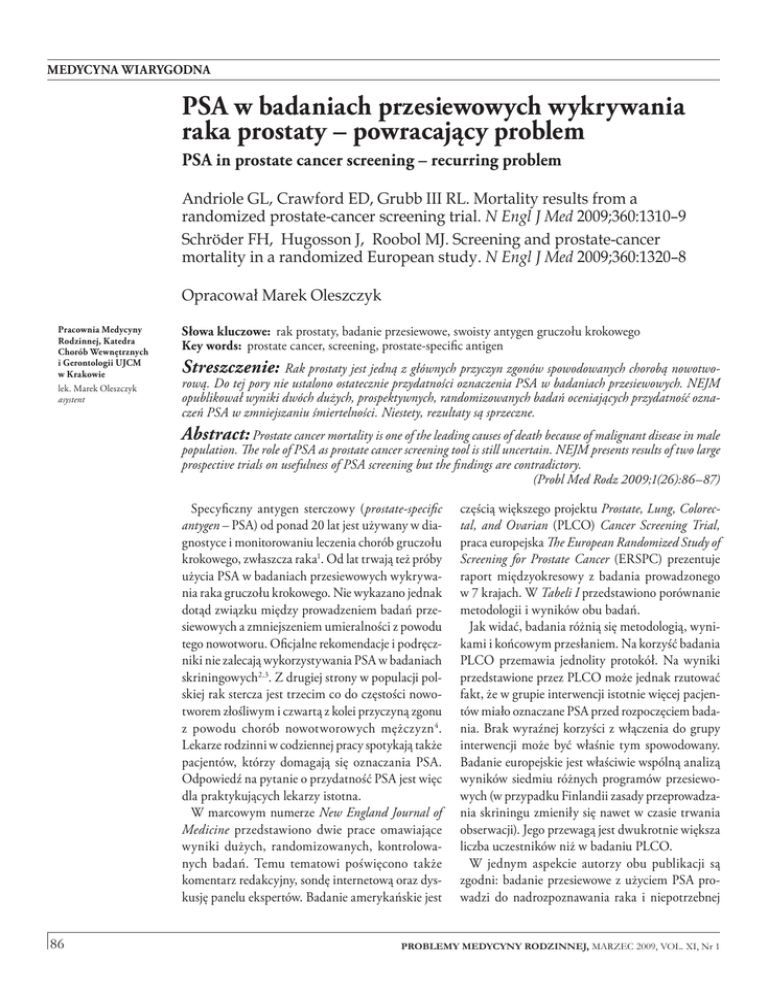 medycyna wiarygodna PSA w badaniach przesiewowych wykrywania raka prostaty – powracający problem PSA in prostate cancer screening – recurring problem Andriole GL, Crawford ED, Grubb III RL. Mortality results from a randomized prostate-cancer screening trial. N Engl J Med 2009;360:1310–9 Schröder FH, Hugosson J, Roobol MJ. Screening and prostate-cancer mortality in a randomized European study. N Engl J Med 2009;360:1320–8 Opracował Marek Oleszczyk Pracownia Medycyny Rodzinnej, Katedra Chorób Wewnętrznych i Gerontologii UJCM w Krakowie lek. Marek Oleszczyk asystent Słowa kluczowe: rak prostaty, badanie przesiewowe, swoisty antygen gruczołu krokowego Key words: prostate cancer, screening, prostate-specific antigen Streszczenie: Rak prostaty jest jedną z głównych przyczyn zgonów spowodowanych chorobą nowotwo- rową. Do tej pory nie ustalono ostatecznie przydatności oznaczenia PSA w badaniach przesiewowych. NEJM opublikował wyniki dwóch dużych, prospektywnych, randomizowanych badań oceniających przydatność oznaczeń PSA w zmniejszaniu śmiertelności. Niestety, rezultaty są sprzeczne. Abstract: Prostate cancer mortality is one of the leading causes of death because of malignant disease in male population. The role of PSA as prostate cancer screening tool is still uncertain. NEJM presents results of two large prospective trials on usefulness of PSA screening but the findings are contradictory. (Probl Med Rodz 2009;1(26):86–87) Specyficzny antygen sterczowy (prostate-specific antygen – PSA) od ponad 20 lat jest używany w dia gnostyce i monitorowaniu leczenia chorób gruczołu krokowego, zwłaszcza raka1. Od lat trwają też próby użycia PSA w badaniach przesiewowych wykrywa nia raka gruczołu krokowego. Nie wykazano jednak dotąd związku między prowadzeniem badań prze siewowych a zmniejszeniem umieralności z powodu tego nowotworu. Oficjalne rekomendacje i podręcz niki nie zalecają wykorzystywania PSA w badaniach skriningowych2,3. Z drugiej strony w populacji pol skiej rak stercza jest trzecim co do częstości nowo tworem złośliwym i czwartą z kolei przyczyną zgonu z powodu chorób nowotworowych mężczyzn4. Lekarze rodzinni w codziennej pracy spotykają także pacjentów, którzy domagają się oznaczania PSA. Odpowiedź na pytanie o przydatność PSA jest więc dla praktykujących lekarzy istotna. W marcowym numerze New England Journal of Medicine przedstawiono dwie prace omawiające wyniki dużych, randomizowanych, kontrolowa nych badań. Temu tematowi poświęcono także komentarz redakcyjny, sondę internetową oraz dys kusję panelu ekspertów. Badanie amerykańskie jest 86 częścią większego projektu Prostate, Lung, Colorectal, and Ovarian (PLCO) Cancer Screening Trial, praca europejska The European Randomized Study of Screening for Prostate Cancer (ERSPC) prezentuje raport międzyokresowy z badania prowadzonego w 7 krajach. W Tabeli I przedstawiono porównanie metodologii i wyników obu badań. Jak widać, badania różnią się metodologią, wyni kami i końcowym przesłaniem. Na korzyść badania PLCO przemawia jednolity protokół. Na wyniki przedstawione przez PLCO może jednak rzutować fakt, że w grupie interwencji istotnie więcej pacjen tów miało oznaczane PSA przed rozpoczęciem bada nia. Brak wyraźnej korzyści z włączenia do grupy interwencji może być właśnie tym spowodowany. Badanie europejskie jest właściwie wspólną analizą wyników siedmiu różnych programów przesiewo wych (w przypadku Finlandii zasady przeprowadza nia skriningu zmieniły się nawet w czasie trwania obserwacji). Jego przewagą jest dwukrotnie większa liczba uczestników niż w badaniu PLCO. W jednym aspekcie autorzy obu publikacji są zgodni: badanie przesiewowe z użyciem PSA pro wadzi do nadrozpoznawania raka i niepotrzebnej PROBLEMY MEDYCYNY RODZINNEJ, MARZEC 2009, VOL. XI, Nr 1 medycyna wiarygodna Tabela I. Porównanie badania PLCO i ERSPC PLCO ERSPC Wspólny dla 10 ośrodków Adaptacja lokalnych progra mów badań przesiewowych Główny punkt końcowy Śmiertelność z powodu raka prostaty Śmiertelność z powodu raka prostaty Wiek jako kryterium włą czenia (w latach) 55–74 55–69 (zakres wspólny dla wszystkich ośrod ków, pacjenci włączeni do analizy) 6 corocznych oznaczeń PSA i 4 badania per rectum PSA oznaczone raz na 4 lata (Szwecja – co 2 lata), badanie per rectum przeciętnie co 2 lata Standardowe postępowanie (w tym oznaczenia PSA, jeżeli tak przewidy wały procedury opieki medycznej) Brak danych 4,0 3,0 (Finlandia i Włochy 4,0) 76 693 (38 343) 162 243 (72 890) Średni okres obserwacji (w latach) 11,5 8,8 Odsetek pacjentów w grupie inter wencji, u których wykonano przy najmniej jedno oznaczenie PSA 85 82,2 Współczynnik śmiertelności w grupie inter wencji vs śmiertelność w grupie kontrol nej (na 10 000 osobolat) 2,0 vs 1,7 (NS) Iloraz częstości zgonu z powodu raka ster cza w grupie interwencji vs grupa kontrolna: 0,8 (95% CI 0,65–0,98; p=0,04) Protokół badania Interwencja Kontrola Przyjęta górna granica normy PSA (ng/mL) Liczba uczestników (liczba w grupie interwencji) Wyniki uwzględniające główny punkt końcowy terapii, która w przypadku tego nowotworu łączy się z istotnym zmniejszeniem jakości życia chorego i dużymi kosztami. Badacze z Europy obliczyli, że aby uniknąć jednego zgonu z powodu raka prostaty, trzeba leczyć 48 pacjentów. Pogłębienia wymaga wie dza w zakresie całkowitych kosztów leczenia i jako ści życia pacjentów. PROBLEMY MEDYCYNY RODZINNEJ, MARZEC 2009, VOL. XI, Nr 1 Piśmiennictwo: 1. Rao AR, Motiwala HG, Karim OM. The discovery of prostate-specific antigen. BJU Int 2008 Jan;101(1):5–10. 2. Pawlęga J. Rak stercza [w:] Medycyna rodzinna (red. Latkowski B, Lukas W). Wyd. Lekarskie PZWL: Warszawa, 2004, s. 935. 3. Kordek R, Jesionek-Kupicka I, Jeziorski A. Badania przesiewowe [w:] Onkologia – podręcznik dla lekarzy i studentów (red. Kordek R). Via Medic