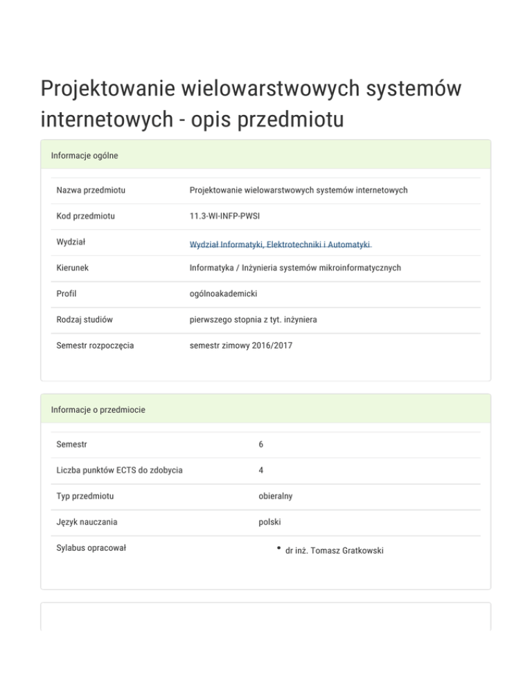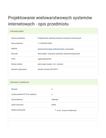 Projektowanie wielowarstwowych systemów internetowych - opis przedmiotu Informacje ogólne Nazwa przedmiotu Projektowanie wielowarstwowych systemów internetowych Kod przedmiotu 11.3-WI-INFP-PWSI Wydział Wydział Informatyki, Elektrotechniki i Automatyki Kierunek Informatyka / Inżynieria systemów mikroinformatycznych Profil ogólnoakademicki Rodzaj studiów pierwszego stopnia z tyt. inżyniera Semestr rozpoczęcia semestr zimowy 2016/2017 Informacje o przedmiocie Semestr 6 Liczba punktów ECTS do zdobycia 4 Typ przedmiotu obieralny Język nauczania polski Sylabus opracował dr inż. Tomasz Gratkowski Formy zajęć Forma zajęć Liczba godzin Liczba godzin Liczba godzin w Liczba godzin w Forma w semestrze w tygodniu semestrze tygodniu zaliczenia (stacjonarne) (stacjonarne) (niestacjonarne) (niestacjonarne) Wykład 15 1 9 ,6 Egzamin Laboratorium 15 1 9 ,6 Zaliczenie na ocenę Projekt 15 1 9 ,6 Zaliczenie na ocenę Cel przedmiotu zapoznanie studentów z podstawowymi technikami tworzenia wielowarstwowych portali internetowych zrealizowanych w technologii Java 2 Enterprise Edition lub Microsoft .Net. ukształtowanie podstawowych umiejętności w zakresie projektowania i implementowania wielowarstwowych portali internetowych zrealizowanych w technologii Java 2 Enterprise Edition lub Microsoft .Net. Wymagania wstępne Programowanie obiektowe, Język Java i technologie Web, Programowanie współbieżne i rozproszone. Zakres tematyczny Warstwa prezentacji: tworzenie aplikacji WWW. Technologie tworzenia dynamicznych stron WWW oraz bogatych aplikacji internetowych (RIA). Usługi sieciowe: Budowanie usług sieciowych w oparciu o technologię Java API for XML Web Services. Wykorzystanie technologii SOAP. Warstwa komponentów: Pojęcie kontenera. Proces wdrożenia. Komponenty sesyjne i wzbudzane komunikatem. Warstwa danych: Standard mapowania obiektowo-relacyjnego. Struktury danych na poszczególnych warstwach systemu internetowego. Dodatkowe usługi: Mechanizm bezpieczeństwa w aplikacji wielowarstwowych. Wzorce projektowe i internetowych systemach wielowarstwowych. Metody kształcenia wykład: wykład konwencjonalny/tradycyjny laboratorium: ćwiczenia laboratoryjne projekt: metoda projektu Efekty kształcenia i metody weryfikacji osiągania efektów kształcenia Opis efektu Potrafi korzystać z najnowszych narzędzi Symbole efektów K_U29 i technologii wspomagających tworzenie Metody weryfikacji bieżąca kontrola Forma zajęć Laboratorium na zajęciach internetowych wielowarstwowych systemów. Potrafi zaprojektować i utworzyć K_W20 nowoczesny internetowy system bieżąca kontrola Projekt na zajęciach wielowarstwowy. Potrafi wytłumaczyć idę stosowania K_W20 technologii komponentowych. Potrafi opisać sposób budowania systemów w oparciu o model usług. sprawdzian Wykład test K_W20 sprawdzian test Wykład Opis efektu Symbole efektów Jest świadomy potrzeby stosowania Metody weryfikacji K_W20 modeli wielowarstwowych przy Forma zajęć sprawdzian Wykład test budowaniu złożonych aplikacji. Warunki zaliczenia Wykład - warunkiem zaliczenia jest uzyskanie pozytywnej oceny z egzaminu pisemnego lub testu. Laboratorium - warunkiem zaliczenia jest uzyskanie pozytywnych ocen ze wszystkich ćwiczeń laboratoryjnych, przewidzianych do realizacji w ramach programu laboratorium. Projekt - warunkiem zaliczenia jest uzyskanie pozytywnej oceny z realizacji zadania projektowego wskazanego przez prowadzącego zajęcia na początku semestru Składowe oceny końcowej = wykład: 40% + laboratorium: 30% + projekt: 30% Obciążenie pracą Obciążenie pracą Studia Studia niestacjonarne stacjonarne (w godz.) (w godz.) Godziny kontaktowe (udział w zajęciach; konsultacjach; egzaminie, itp.) 60 60 Samodzielna praca studenta (przygotowanie do: zajęć, kolokwium, 40 40 Łącznie 100 100 Punkty ECTS Studia Studia niestacjonarne egzaminu; studiowanie literatury przygotowanie: pracy pisemnej, projektu, prezentacji, raportu, wystąpienia; itp.) stacjonarne Zajęcia z udziałem nauczyciela akademickiego 2 2 Zajęcia bez udziału nauczyciela akademickiego 2 2 Łącznie 4 4 Literatura podstawowa 1. Eric Jendrock, Jennifer Ball, Debbie Carson, Ian Evans, Scott Fordin, Kim Haase: The Java EE 5 Tutorial For Sun Java System Application Server 9.1; October 2008; 2. Deepak Alur, John Crupi, Dan Malks : core J2EE. Wzorce projektowe; Wydawnictwo Helion 2004; 3. Stephanie Bodoff, Eric Armstrong, Jennifer Ball, Debbie Bode Carson: J2EE. Vademecum profesjonalisty; Wydawnictwo Helion 2005; 4. Sameer Tyagi, Keiron McCammon, Michael Vorburger, Heiko Bobzin: Core JAVA Data Objects; Wydawnictwo Helion 2004; 5. Bryan Basham, Kathy Sierra, Bert Bates: Head First Servlets & JSP; Wydawnictwo Helion 2009; 6. William Crawford, Jonathan Kaplan: J2EE Stosowanie wzorców projektowych; Wydawnictwo Helion 2004; 7. Perry S. C.: Core C# and .NET. Helion 2006 8. The C# Station ADO.NET Tutorial: http://www.csharp-station.com/Tutorials/AdoDotNet/ 9. Moroney L.: Microsoft® Silverlight® 4 Step by Step. Microsoft Press 2010 10. Beres J., Evjen B., Rader D.: Professional Silverlight 4. Wrox Press 2010 11. Liberty J., Hurwitz D, MacDonald B.: ASP.NET 3.5 Programowanie. Helion 2010 12. Walther S.: ASP.NET 2.0 księga eksperta. Helion 2008 Literatura uzupełniająca 1. Joel Scamray, Mike Shema: Hakerzy aplikacje webowe. Sekrety zabezpieczeń aplikacji webowych; Wydawnictwo Translator s.c. 2002; 2. S.Graham, S.Simeonov, T. Boubez, D. Davis, G. Daniels: Java. Usługi WWW. Vademecum profesjonalisty; Wydawnictwo Helion 2003; 3. Alan Monnox: J2EE. Podstawy programowania aplikacji korporacyjnych; Wydawnictwo Helion 2005; 4. 101 LINQ Samples: http://msdn.microsoft.com/en-us/vcsharp/aa336746 5. Boduch A.: Wstęp do programowania w języku C#. Helion 2006 Uwagi Zmodyfikowane przez dr inż. Tomasz Gratkowski (ostatnia modyfikacja: 22-09-2016 19:38)