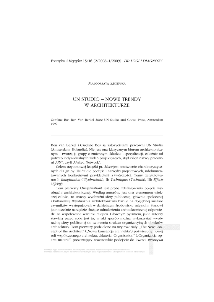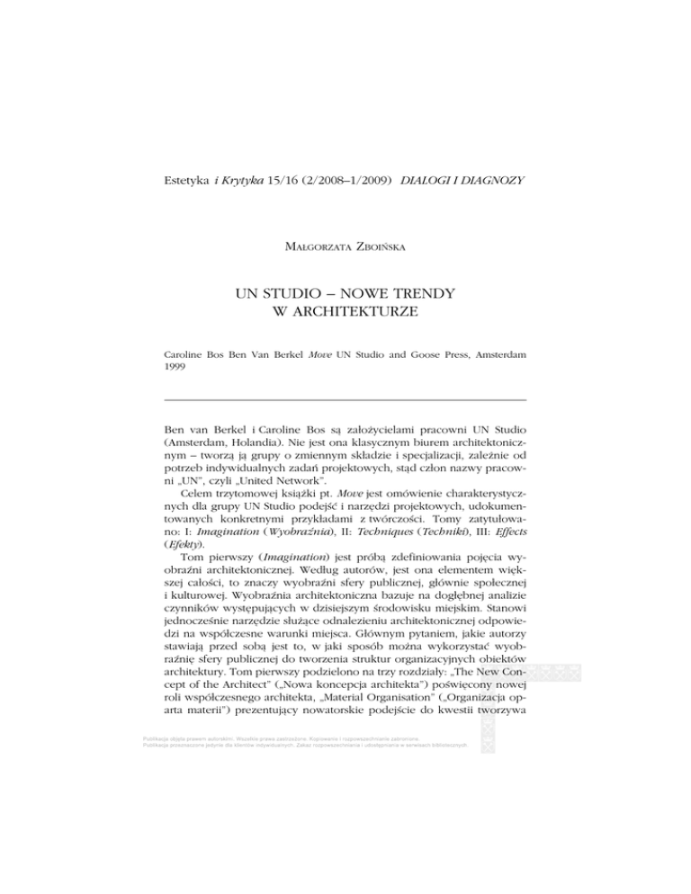 Estetyka i Krytyka 15/16 (2/2008–1/2009) DIALOGI I DIAGNOZY MAŁGORZATA ZBOIŃSKA UN STUDIO – NOWE TRENDY W ARCHITEKTURZE Caroline Bos Ben Van Berkel Move UN Studio and Goose Press, Amsterdam 1999 Ben van Berkel i Caroline Bos są założycielami pracowni UN Studio (Amsterdam, Holandia). Nie jest ona klasycznym biurem architektonicznym – tworzą ją grupy o zmiennym składzie i specjalizacji, zależnie od potrzeb indywidualnych zadań projektowych, stąd człon nazwy pracowni „UN”, czyli „United Network”. Celem trzytomowej książki pt. Move jest omówienie charakterystycznych dla grupy UN Studio podejść i narzędzi projektowych, udokumentowanych konkretnymi przykładami z twórczości. Tomy zatytułowano: I: Imagination (Wyobraźnia), II: Techniques (Techniki), III: Effects (Efekty). Tom pierwszy (Imagination) jest próbą zdefiniowania pojęcia wyobraźni architektonicznej. Według autorów, jest ona elementem większej całości, to znaczy wyobraźni sfery publicznej, głównie społecznej i kulturowej. Wyobraźnia architektoniczna bazuje na dogłębnej analizie czynników występujących w dzisiejszym środowisku miejskim. Stanowi jednocześnie narzędzie służące odnalezieniu architektonicznej odpowiedzi na współczesne warunki miejsca. Głównym pytaniem, jakie autorzy stawiają przed sobą jest to, w jaki sposób można wykorzystać wyobraźnię sfery publicznej do tworzenia struktur organizacyjnych obiektów architektury. Tom pierwszy podzielono na trzy rozdziały: „The New Concept of the Architect” („Nowa koncepcja architekta”) poświęcony nowej roli współczesnego architekta, „Material Organisation” („Organizacja oparta materii”) prezentujący nowatorskie podejście do kwestii tworzywa Publ i kacj aobj ęt apr awem aut or ski mi .Wszel ki epr awazast r zeżone.Kopi owani eir ozpowszechni ani ezabr oni one. Publ i kacj apr zeznaczonej edyni edl akl i ent ów i ndywi dual nych.Zakazr ozpowszechni ani aiudost ępni ani aw ser wi sachbi bl i ot ecznych. 356 Małgorzata Zboińska architektonicznego oraz „Inclusiveness” („Włączanie”) przedstawiający innowacyjną filozofię projektową opartą na całościowym ujęciu zróżnicowanych czynników projektowych (konstrukcji, cyrkulacji i rozmieszczenia funkcji). Tom drugi (Techniques) stanowi prezentację współczesnych technik komputerowych, projektowych oraz mediacyjnych (poszukujących porozumienia między zróżnicowanymi parametrami projektu). Stanowią one narzędzia służące przekazaniu nowych idei wytworzonych przez wyobraźnię architektoniczną jak również komunikują odniesienia architektury do współczesnych warunków miejsca. Tom podzielono na trzy rozdziały poświęcone współczesnym technikom: „Diagrams” („Diagramy”), „Hybridization” („Hybrydyzacja”), „Mediation” („Mediacja”). Tom trzeci (Effects) definiuje efekt architektoniczny jako wpływ architektury na sfery: publiczną, ekonomiczną, związaną z funkcjonowaniem obiektu w praktyce oraz „doświadczeniową” – związaną z odbiorem zmysłowym, estetycznym. Autorzy dochodzą do wniosku, że odpowiedzią na pytanie o efekt architektoniczny powinno być to, co architektura czyni, a nie to, czym architektura jest. Chodzi zatem nie o uzyskanie obiektu o określonym kształcie czy kompozycji, lecz o dążenie do uzyskania formy jako układu wzajemnych relacji wytwarzających konkretne oddziaływanie na otoczenie i użytkowników. Jednocześnie van Berkel i Bos pytają: w jaki sposób możemy wykorzystać nową sferę publiczną (opartą na mediacji między silnie zróżnicowanymi czynnikami, wpływami i interesami) do uzyskania współczesnych efektów architektonicznych? Według autorów, najbardziej wyzwalające wyobraźnię efekty, które architektura może dzisiaj osiągnąć, mają swoje źródło w nowym rozumieniu czasu i przestrzeni – nie jako elementów stałych, jednolitych, lecz jako czynników zmiennych i heterogenicznych. Tom podzielono na rozdziały poświęcone dwu różnym efektom architektonicznym bazującym na przeciwstawnych typach organizacji przestrzeni: „Orientable” (związanym z powierzchniami posiadającymi dwie różne strony możliwe do zdefiniowania matematycznie, takimi jak struktura sprężynowa czy powierzchnia Seiferta) i „Non-orientable” (związanym z powierzchniami, w których obie strony są skręcone, tworząc jedną niedefiniowalną powierzchnię, jak na przykład wstęga Möbiusa czy butelka Kleina). Analiza książki w kontekście dorobku współczesnej światowej praktyki architektonicznej prowadzi do wniosku, że proponowane przez UN Studio metody projektowe wnoszą do niego istotny wkład. Projektowanie obiektów skupia się bowiem dzisiaj na uzupełnianiu ciągłości różnorodnych systemów występujących we współczesnym ośrodku miejskim: przestrzeni publicznych ekosystemów miejskich czy urbanistycznych sieci infrastrukturalno-programowych. Powstają budynki inspirowane Publ i kacj aobj ęt apr awem aut or ski mi .Wszel ki epr awazast r zeżone.Kopi owani eir ozpowszechni ani ezabr oni one. Publ i kacj apr zeznaczonej edyni edl akl i ent ów i ndywi dual nych.Zakazr ozpowszechni ani aiudost ępni ani aw ser wi sachbi bl i ot ecznych. UN Studio – nowe trendy w architekturze 357 wpływami współczesnego kontekstu urbanistycznego: jego zmiennością, ruchem ludzi, wpływami kultury i globalizacji. Projekty UN Studio prezentowane w książce podążają za tym nurtem, gdyż ich intencją jest uzyskanie obiektu harmonizującego z krajobrazem miejskim i stanowiącego jego integralny komponent. Van Berkel i Bos, poszukując różnorodnych form dialogu obiektów z otoczeniem, odwołują się do sfery nowych pojęć, umieszczając na końcu publikacji „Słownik osobisty”, w którym definiują pojęcia wprowadzane w poszczególnych tomach i rozdziałach, takie jak na przykład: „Hybridization”, „Inclusiveness” czy „Mediation