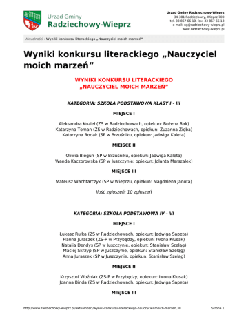 Urząd Gminy Radziechowy-Wieprz 34-381 Radziechowy, Wieprz 700 tel. 33 867 66 10, fax. 33 867 66 13 e-mail: [email protected] www.radziechowy-wieprz.pl Aktualności › Wyniki konkursu literackiego „Nauczyciel moich marzeń” Wyniki konkursu literackiego „Nauczyciel moich marzeń” WYNIKI KONKURSU LITERACKIEGO „NAUCZYCIEL MOICH MARZEŃ” KATEGORIA: SZKOŁA PODSTAWOWA KLASY I - III MIEJSCE I Aleksandra Kozieł (ZS w Radziechowach, opiekun: Bożena Rak) Katarzyna Toman (ZS w Radziechowach, opiekun: Zuzanna Zięba) Katarzyna Rodak (SP w Brzuśniku, opiekun: Jadwiga Kaleta) MIEJSCE II Oliwia Biegun (SP w Brzuśniku, opiekun: Jadwiga Kaleta) Wanda Kaczorowska (SP w Juszczynie: opiekun: Jolanta Marszałek) MIEJSCE III Mateusz Wachtarczyk (SP w Wieprzu, opiekun: Magdalena Janota) Ilość zgłoszeń: 10 zgłoszeń KATEGORIA: SZKOŁA PODSTAWOWA IV – VI MIEJSCE I Łukasz Rułka (ZS w Radziechowach, opiekun: Jadwiga Sapeta) Hanna Juraszek (ZS-P w Przybędzy, opiekun: Iwona Kłusak) Natalia Dendys (SP w Juszczynie, opiekun: Stanisław Szeląg) Maciej Skrzyp (SP w Juszczynie, opiekun: Stanisław Szeląg) Anna Juraszek (SP w Juszczynie, opiekun: Stanisław Szeląg) MIEJSCE II Krzysztof Woźniak (ZS-P w Przybędzy, opiekun: Iwona Kłusak) Joanna Binda (ZS w Radziechowach, opiekun: Jadwiga Sapeta) MIEJSCE III http://www.radziechowy-wieprz.pl/aktualnosci/wyniki-konkursu-literackiego-nauczyciel-moich-marzen,30 Strona 1 Urząd Gminy Radziechowy-Wieprz 34-381 Radziechowy, Wieprz 700 tel. 33 867 66 10, fax. 33 867 66 13 e-mail: [email protected] www.radziechowy-wieprz.pl Aktualności › Wyniki konkursu literackiego „Nauczyciel moich marzeń” Aleksandra Juraszek (SP w Juszczynie, opiekun: Stanisław Szeląg) Oliwia Konior(ZS w Radziechowach, opiekun: Jadwiga Sapeta) Natalia Hazuka (ZS w Radziechowach, opiekun: Jadwiga Sapeta) Ilość zgłoszeń: 21 KATEGORIA: GIMNAZJUM - WIERSZ MIEJSCE I Magdalena Maciejko (ZS w Radziechowach, opiekun: Maria Wolna) MIEJSCE II Joanna Jakubiec (Gimnazjum w Wieprzu, opiekun: Teresa Biela) MIEJSCE III Dominik Wachtarczyk (Gimnazjum w Wieprzu, opiekun: Teresa Biela) Kamila Pawlus (Gimnazjum w Wieprzu, opiekun: Teresa Biela) KATEGORIA: GIMNAZJUM - PROZA MIEJSCE I Magdalena Brandys (Gimnazjum w Wieprzu, opiekun: Teresa Biela) Laura Piznal (Gimnazjum w Wieprzu, opiekun: Teresa Biela) MIEJSCE II Martyna Dziergas (ZS w Radziechowach, opiekun: Jolanta Roczyna) MIEJSCE III Joanna Pytlarczyk (ZS w Radziechowach, opiekun: Maria Wolna) Ilość zgłoszeń: 15 Wszystkim zwycięzcom gratulujemy, nagrody zostaną rozdane w szkołach w dniu 18 października 2013 r. między 9.00 - 13.00. Dziękujemy za tak liczne zgłoszenia do konkursu. http://www.radziechowy-wieprz.pl/aktualnosci/wyniki-konkursu-literackiego-nauczyciel-moich-marzen,30 Strona 2 Urząd Gminy Radziechowy-Wieprz 34-381 Radziechowy, Wieprz 700 tel. 33 867 66 10, fax. 33 867 66 13 e-mail: [email protected] www.radziechowy-wieprz.pl Aktualności › Wyniki konkursu literackiego „Nauczyciel moich marzeń” W imieniu organizatorów życzymy wszystkim uczestnikom konkursu, aby wymarzony nauczyciel z Waszych prac, był to ten, którego codziennie mijacie na korytarzu waszej szkoły, ten, który wita Was z uśmiechem na lekcjach, a w szczególności by był Waszym sprawiedliwym i wymagającym przyjacielem. Nauczycielom życzymy spokojnej, lecz kreatywnej młodzieży, pełnej pomysłów, zaangażowania w życie szkoły, ale przede wszystkim życzymy uczniów, którzy z szacunkiem będą spoglądać na Was zarówno na korytarzach, w klasach, jak również za 20 lat z własnymi dziećmi spotykając Was na ulicy. Dziękujemy za Państwa zaangażowanie i uczestnictwo w konkursach organizowanych przez Gminne Centrum Kultury, Promocji, Turystyki Radziechowy – Wieprz. Z poważaniem Dyrektor GCKPT Magdalena Więzik http://www.radziechowy-wieprz.pl/aktualnosci/wyniki-konkursu-literackiego-nauczyciel-moich-marzen,30 Strona 3