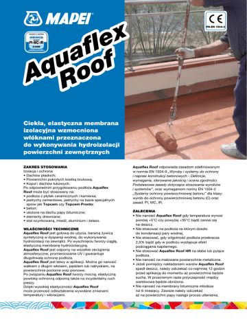 x e l f a f u o q A Ro PN-EN 1504-2 1504-3 PN-EN ZGODNY Z NORMĄ PN-EN 1504-2 (H) ZASADY PI-MC-IR SYSTEMY OCHRONY POWIERZCHNIOWEJ BETONU Ciekła, elastyczna membrana izolacyjna wzmocniona włóknami przeznaczona do wykonywania hydroizolacji powierzchni zewnętrznych ZAKRES STOSOWANIA Izolacja i ochrona • Dachów płaskich; • Powierzchni pokrytych kostką brukową. • Kopuł i dachów łukowych. Po odpowiednim przygotowaniu podłoża Aqualfex Roof może być stosowany na: • podłoża z płytek ceramicznych i kamienia; • jastrychy cementowe, jastrychy na bazie specjalnych spoiw jak Topcem czy Topcem Pronto; • beton; • ułożone na dachu papy bitumiczne; • elementy drewniane; • stal ocynkowaną, miedź, aluminium i żelazo. WŁAŚCIWOŚCI TECHNICZNE Aquaflex Roof jest gotową do użycia, barwną żywicą syntetyczną w dyspersji wodnej, do wykonywania hydroizolacji na zewnątrz. Po wyschnięciu tworzy ciągłą, elastyczną membranę hydroizolacyjną. Aquaflex Roof jest odporny na wszelkie obciążenia atmosferyczne, promieniowanie UV i gwarantuje długotrwałą ochronę podłoża. Aquaflex Roof jest łatwy w aplikacji. Można go nanosić wałkiem z długim włosiem, pędzlem lub natryskiem, na powierzchnie poziome oraz pionowe. Po związaniu Aquaflex Roof tworzy mocną, elastyczną powłokę ochronną odporną także na incydentalny ruch pieszy. Dzięki wysokiej elastyczności Aquaflex Roof może przenosić odkształcenia wywołane zmianami temperatury i wibracjami. Aquaflex Roof odpowiada zasadom zdefiniowanym w normie EN 1504-9 „Wyroby i systemy do ochrony i napraw konstrukcji betonowych - Definicje, wymagania, sterowanie jakością i ocena zgodności. Podstawowe zasady dotyczące stosowania wyrobów i systemów”, oraz wymaganiom normy EN 1504-2 „Systemy ochrony powierzchniowej betonu” dla klasy: wyrób do ochrony powierzchniowej betonu (C) oraz zasad: PI, MC, IR. ZALECENIA • Nie nanosić Aquaflex Roof gdy temperatura wynosi poniżej +5°C czy powyżej +35°C bądź zanosi się na deszcz. • Nie stosować na podłoża na którym doszło do kondensacji pary wodnej. • Nie stosować, gdy wilgotność podłoża przekracza 2,5% bądź gdy w podłożu występuje efekt podciągania kapilarnego. • Nie stosować Aquaflex Roof HR na słabe lub pylące podłoża. • Nie nanosić na malowane powierzchnie metaliczne. • Jeżeli pomiędzy nakładaniem warstw Aquaflex Roof spadł deszcz, należy odczekać co najmniej 12 godzin przed aplikacją do momentu aż powierzchnia będzie sucha. W przeciwnym razie przyczepność między warstwowa będzie obniżona. • Nie nanosić na membrany bitumiczne młodsze niż 6 miesięcy. Zawsze należy odczekać aż na powierzchni papy nastąpi proces utlenienia. x e l f a f u Aq Roo Przygotowanie podłoża przed aplikacją Aquaflex Roof Stara okładzina z terakoty, która wymaga naprawy przez aplikacją powłoki Aquaflex Roof Uszczelnianie dylatacji taśmą Mapeband przyklejoną do podłoża Aquaflex Roof WYTYCZNE STOSOWANIA Przygotowanie podłoża Każde podłoże bez względu na to czy jest stare czy nowe musi być mocne, czyste, suche i wolne od plam oleju, smarów, starych farb, rdzy, roślinności i innych substancji które mogą obniżyć przyczepność. ułożyć tkaninę polipropylenową Mapetex 50. Na podłoże nanieść obficie pierwszą warstwę Aquaflex Roof, na świeżą powłokę ostrożnie rozłożyć Mapetex 50 i delikatnie docisnąć płaską pacą lub wałkiem okolcowanym. Gdy pierwsza warstwa całkowicie zwiąże nanieść drugą warstwę Aquaflex Roof. Chronić membranę przed deszczem aż do jej całkowitego wyschnięcia. Beton oraz podłoża mineralne muszą być mocne, suche i nie podciągające wilgoci z podłoża. Wszelkie luźne elementy muszą zostać usunięte. Nierówności podłoża należy naprawić zaprawami mineralnymi np. Planitop 400 lub Adesilex P4. Powierzchnię zagruntować warstwą Aquaflex Roof rozcieńczonego wodą (10%).Wszelkie zanieczyszczenia woskami, środkami powierzchniowo czynnymi itp. muszą zostać usunięte z powierzchni ceramicznych odpowiednim detergentem lub metodą szlifowania. Szczeliny pomiędzy płytkami ceramicznymi wypełnić Adesilex P4 przed aplikacją Aquaflex Roof. Niechłonne podłoża ceramiczne zagruntować Eco Prim Grip, natomiast na inne typy podłoża stosować Aquaflex Roof jako warstwę gruntującą (rozcieńczony 10% wody). Ostrożnie oczyścić istniejące membrany bitumiczne np. wodą pod ciśnieniem, poczekać aż powierzchnia wyschnie i nanieść warstwę preparatu gruntującego Primer for Aquaflex. Podłoża metalowe należy dokładnie oczyścić i nanieść preparat gruntujący Eco Prim Grip. Przed naniesieniem Aquaflex Roof należy zwrócić szczególną uwagę na dylatacje pracujące oraz połączenie powierzchni poziomej i pionowej. Muszą one być uszczelnione np. samoprzylepną taśmą butylową Mapeband SA czy którąś z taśm Mapeband lub Mapeband PE 120 przyklejoną do podłoża Aquaflex Roof. Dylatacje konstrukcyjne należy uszczelnić taśmą Mapeband TPE wklejoną na Adesilex PG4. Do uszczelnienia odpływów zastosować odpowiedni zestaw elementów z gamy produktów Drain. ZUŻYCIE Na membranę hydroizolacyjną: co najmniej 2,0 kg/m². Na powłokę ochronną membran bitumicznych: - około 0,5 kg/m², - około 0,9 kg/m² na papach z posypką. Podano zużycie teoretyczne na gładkim podłożu, bez szwów i może być wyższe na nierównym podłożu zależnie od jego chłonności i szorstkości. Przygotowanie produktu Produkt jest dostarczany w postaci gotowej do użycia. Zaleca się dokładne przemieszanie produktu przed jego użyciem. Aplikacja produktu Aquaflex Roof należy nanosić wałkiem z długim włosiem lub natryskiem bezpowietrznym. Powłokę Aquaflex Roof należy wykonać w dwóch warstwach, uzyskując grubość 0,4 – 0,5 mm dla każdej z warstw. Z aplikacją drugiej warstwy należy odczekać aż pierwsza warstwa całkowicie wyschnie