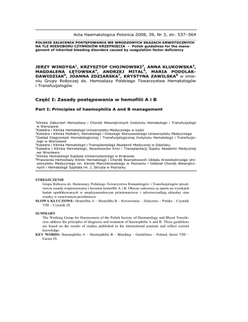 Acta Haematologica Polonica 2008, 39, Nr 3, str. 537–564 POLSKIE ZALECENIA POSTĘPOWANIA WE WRODZONYCH SKAZACH KRWOTOCZNYCH NA TLE NIEDOBORU CZYNNIKÓW KRZEPNIĘCIA – Polish guidelines for the management of inherited bleeding disorders caused by coagulation factor deficiency JERZY WINDYGA1, KRZYSZTOF CHOJNOWSKI2, ANNA KLUKOWSKA3, MAGDALENA ŁĘTOWSKA4, ANDRZEJ MITAL5, MARIA PODOLAKDAWIDZIAK6, JOANNA ZDZIARSKA7, KRYSTYNA ZAWILSKA8 w imieniu Grupy Roboczej ds. Hemostazy Polskiego Towarzystwa Hematologów i Transfuzjologów Część I: Zasady postępowania w hemofilii A i B Part I: Principles of haemophilia A and B management 1 Klinika Zaburzeń Hemostazy i Chorób Wewnętrznych Instytutu Hematologii i Transfuzjologii w Warszawie Katedra i Klinika Hematologii Uniwersytetu Medycznego w Łodzi 3 Katedra i Klinika Pediatrii, Hematologii i Onkologii Warszawskiego Uniwersytetu Medycznego 4 Zakład Diagnostyki Hematologicznej i Transfuzjologicznej Instytutu Hematologii i Transfuzjologii w Warszawie 5 Katedra i Klinika Hematologii i Transplantologii Akademii Medycznej w Gdańsku 6 Katedra i Klinika Hematologii, Nowotworów Krwi i Transplantacji Szpiku Akademii Medycznej we Wrocławiu 7 Klinika Hematologii Szpitala Uniwersyteckiego w Krakowie 8 Pracownia Hemostazy Kliniki Hematologii i Chorób Rozrostowych Układu Krwiotwórczego Uniwersytetu Medycznego im. Karola Marcinkowskiego w Poznaniu i Oddział Chorób Wewnętrznych i Hematologii Szpitala im. J. Strusia w Poznaniu 2 STRESZCZENIE Grupa Robocza ds. Hemostazy Polskiego Towarzystwa Hematologów i Transfuzjologów przedstawia zasady rozpoznawania i leczenia hemofilii A i B. Obecne zalecenia są oparte na wynikach badań opublikowanych w międzynarodowym piśmiennictwie i odzwierciedlają aktualny stan wiedzy w omawianym przedmiocie. SŁOWA KLUCZOWE: Hemofilia A – Hemofilia B – Krwawienia – Zalecenia – Polska – Czynnik VIII – Czynnik IX SUMMARY The Working Group for Haemostasis of the Polish Society of Haematology and Blood Transfusion address the principles of diagnosis and treatment of haemophilia A and B. These guidelines are based on the results of studies published in the international journals and reflect current knowledge. KEY WORDS: Haemophilia A – Haemophilia B – Bleeding – Guidelines – Poland, factor VIII – Factor IX 538 J. WINDYGA i wsp. CEL ZALECEŃ Wrodzone skazy krwotoczne są rzadko występującymi chorobami, do rozpoznania których wykorzystuje się trudno dostępne techniki laboratoryjne, a w leczeniu krwawień stosuje bardzo kosztowne leki hemostatyczne. Zamierzeniem autorów Zaleceń jest przedstawienie aktualnie obowiązujących zasad postępowania we wrodzonych skazach krwotocznych spowodowanych niedoborem czynników krzepnięcia krwi. Zalecenia zostały przygotowane w oparciu o opublikowane wyniki badań, a ich ostateczny kształt powstał podczas konferencji uzgodnieniowych z udziałem członków Grupy Roboczej ds. Hemostazy Polskiego Towarzystwa Hematologów i Transfuzjologów, które miały miejsce w 2008 r. Adresatem zaleceń są przede wszystkim lekarze sprawujący bezpośrednią opiekę nad chorymi na skazy krwotoczne. Jest to w piśmiennictwie polskim pierwsza praca, tak obszernie omawiająca zasady postępowania z chorymi na hemofilię A i B. WPROWADZENIE Przyczyną wrodzonych skaz krwotocznych osoczowych jest najczęściej niedobór lub zaburzenie funkcji pojedynczego czynnika krzepnięcia krwi. Aktywność czynników krzepnięcia wyraŜa się w jednostkach międzynarodowych (j.m.); wyjątkiem jest fibrynogen, który oznacza się w jednostkach wagowych. Za 1 j.m. danego czynnika krzepnięcia przyjmuje się jego aktywność w 1 ml prawidłowego świeŜego osocza, uzyskanego z krwi zmieszanej w stosunku 9:1 z 3,2% roztworem cytrynianu sodu. U zdrowych osób aktywność większości czynników krzepnięcia mieści się w przedziale 0,5–1,5 j.m./ml osocza (50–150% normy) (1). Definicja Hemofilia A to wrodzona skaza krwotoczna spowodowana zmniejszeniem aktywności czynnika krzepnięcia VIII (cz. VIII) w osoczu (2). Hemofilia B to wrodzona skaza krwotoczna spowodowana zmniejszeniem aktywności czynnika IX (cz. IX) w osoczu (2). ETIOLOGIA I PATOGENEZA Hemofilia A Czynnik VIII jest glikoproteiną syntetyzowaną głównie w hepatocytach, ale takŜe w nerkach, komórkach śródbłonka i tkance limfatycznej (3). Czynnik VIII jest jednym z największych (2351 aminokwasów, masa cząsteczkowa 293 000 Da) i najmniej stabilnych czynników krzepnięcia, występującym w krwiobiegu w niekowalencyjnym kompleksie z czynnikiem von Willebranda (ang. von Willebrand Factor, vWF) (3). Czynnik von Willebranda chroni cz. VIII przed przedwczesną proteolityczną degradacją i przenosi go do miejsc uszkodzenia śródbłonka naczyniowego. Czas biologicznego półtrwania cz. VIII wynosi około 12 h. Część I. Zasady postępowania w hemofilii A i B 539 Gen czynnika VIII został sklonowany w 1984 r. (4). Znajduje się on na długim ramieniu chromosomu X (Xq28) i ma wielkość 186000 par zasad (bp). Niezwykłość genu cz. VIII polega na obecności w jego intronie 22 (IVS22) dwóch dodatkowych genów F8A i F8B (5). F8A jest transkrybowany w odwrotnym kierunku do genu cz. VIII. Dwie dodatkowe kopie F8A występują poza genem cz. VIII oddalone o 400 kbp w kierunku telomeru. Funkcje F8A i F8B nie zostały dotąd poznane. Najczęściej występującą mutacją u chorych na cięŜką hemofilię A (około 45% przypadków) jest duŜa inwersja i translokacja eksonów 1–22 (wraz z intronami), w następstwie homologicznej rekombinacji zachodzącej pomiędzy genem F8A w intronie 22 i jedną z kopii F8A znajdującą się poza genem cz. VIII (6). Mutacja ta powstaje praktycznie wyłącznie w męskich komórkach rozrodczych (7). Inne mutacje odpowiedzialne za hemofilię, to mutacje punktowe (w 85% zmiany sensu, a w 15% nonsensowne), z czego około 5% to duŜe lub małe delecje i insercje, a takŜe inwersja w intronie 1 (8). Wyniki