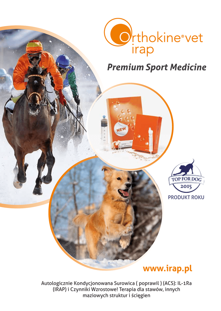 PRODUKT ROKU www.irap.pl Autologicznie Kondycjonowana Surowica ( poprawil ) (ACS): IL-1Ra (IRAP) i Czynniki Wzrostowe! Terapia dla stawów, innych maziowych struktur i ścięgien Terapia Orthokine®vet W skrócie +37°C/ 98.6°F Pobranie krwi Iniekcja do stawu Inkubacja Odwirowanie krwi -18° Wskazania • • • • • Zapalenie kości i stawów Zapalenie błony maziowej Tendinopatia Kissing Spines zwyrodnienia stawów i kregoslupa Charakterystyka • • • • • Przeciwzapalne i przeciwbólowe Surowica bez komórek bez czynników krzepnięcia Wzbogacone IL-1Ra i czynniki wzrostu Użycie mechanizmu obrony własnym ciałem Biologiczny tryb akcji pacjenta / właściciela • • • • • Znacząca redukcja bólu Zapobieganie postępującej degeneracji Długoterminowa skuteczność Doskonała tolerancja Poprawa jakości życia Terapia Orthokine®vet hamuje stany zapalne Położenie Nadmierna interleukina-1 (IL-1) Wiąże receptory IL-1 ulewne zapalenia i degeneracje tkanki. IL-1 Terapia Receptory antagonistyczne Interleukiny-1 (IL-1Ra) i czynniki wzrostu (GF) są dostarczane w wysokich ilościach. IL-1Ra IL-1 GF IL-1 Efekt IL-1Ra GF Konkurencyjne hamowanie IL-1 przez IL-1Ra. GF‘y wspierają regenerację zniszczonej tkanki. Podsumowanie Badania z oryginalnym systemem Orthokine®vet / Orthokine® Badania weterynaryjne kliniczne Element sterujący Wyniki Jöstingmeier Kortykosterydy & HA Wyższość wobec Sterydów i HAw długoterminowym efekcie Examensarbeit 2008 Uppsala, SE Österdahl HA lub Glukozaminoglycyna Nie-Respondenci wrócili do działania 17 z 20 Łokieć i Staw kolanowy, Pies Seria przypadków 2010, WSAVA Geneva, CH Hauri 12 brak 9 / 12 zredukowane kalectwo Podwieszenie więzadeł, Koń Seria przypadków 2014, AAEP SLC, USA Easter 271 brak 71% - 85% bez kalectwa przez 30 dni Tendinopatia, Koń J. Stemcell bada nia & terapia 2015, 6:126 Placebo lub nie leczone Poprawa klinicznych i ultrasonograficznych parametrów; wz mocnienie ekspresji Wskazanie Pochodzenie Staw kopytowy, Koń Praca doktorska 2008 Berlin, DE Staw kopytowy & Pęcina, Koń Autor N Geburek et al. 107 Trwające badania- weterynaryjne Wskazanie Gatunki Kraj Stan połączenia typu I Uszkodzenia ścięgien PRP Koński Niemcy Zakończone zbieranie danych Po OP zabiegi po TTA Psi USA Pierwsi pacjenci leczeni w 2014 GF-Pomiary Psi USA Zakończone zbieranie danych Badania eksperymentalne Wskazanie Dziennik Autor N Element Wyniki Urazy mięśni Mysz Int. J. of Sports Medicine 2004 WrightCarpenter - Placebo ACS poprawia regenerację mieśni Wywołane zapalenie stawów, Nadgarstek, Koń Am. J. of Veterinary Research 2007 Frisbie et al. 16 Solanka Redukcja kalectwa i Hyperplazji maziowej Ścięgno Achillesa Szczur Am. J. of Sports Medicine 2009 Majewski et al. - Placebo ACS przyspiesza i poprawia regenerację ścięgien Kliniczne badania w medycynie ludzkiej Wskazanie Pochodzenie Autor N Element sterujący Wyniki Urazy mięśni, Sportowcy Int. J. of Sports Medicine 2004 WrightCarpenter 33 Actovegin, Traumeel Krótszy czas regeneracji w grupie ACS Kompresja Korzeni Lędźwiowych Kręgosłup 2007 Becker 84 Triam 3x 5 ml, Triam 3x 10 ml Redukcja bólu w 22 tygodniu znacząco wyższa w grupie ACS Zapalenie Stawu Kolanowego Choroba zwyrodnieniowa stawów i chrząstki 2009 Baltzer 376 HA, placebo Znacząca poprawa bólu wyższa w ACS niż HA i placebo Choroba zwyrodnieniowa stawu biodrowego Orthop Rev 2013 Baltzer 119 brak Znacząca redukcja bólu Ocena Autologicznie Kondycjonowanej surowicy Osterdahl, Examensarbeit 2008:67, Uppsala, Sweden, 2008 10 kulawych koni Uszkodzenie PSGAG pęcina 10 kulawych koni Uszkodzenie HA staw pęcinowy lub kopytowy 3 x 2 mL ACS (Orthokine®vet) 3 miesiące po terapii Uszkodzenie PSGAG Uszkodzenie HA: 10/10 powrót do poprzedniego 7/10 powrót do poprzedniego poziomu wydajności poziomu wydajności Porównanie Iniekcji Dostawowej Autologicznie Kondycjonowanej Surowicy (ACS, irap) kontra Sodium Hyaluronate i Kortykosterydy w Kulawiźnie Stawu Kopytowego Przedniej Kończyny. Jöstingmeier et al., The Australian Equine Veterinarian, Vol. 29, No.3, 2010. Hufgelenkstherapie mit irap vs HA+Cortison Hufgelenkstherapie mit irap vs HA+Cortison (N27 je Gruppe) (N27 je Gruppe) 2,5 2 2 LH-Grad 2,5 1,5 1 0,5 0,5 0 0 1 Grupa 1: N27 Betamethasone 2 mL + HA 2 mL (1sza iniekcja Łączne dalsze iniekcje samo HA, przeciętnie 2.8 zabiegów) 1,5 1 0 Grupa 2: N27 ACS 3 mL (Przeciętnie 3.3 zabiegów) 0 1 2 3 2 4 3 5 4 6 ® Terapia stawu kopytowego z Orthokine vet-ACS kontra HA + Kortyzon Monate Monate Hufgelenkstherapie mit irap vs HA+Cortison (N27 je Gruppe) n=27 na grupę LH-Grad kulawizny Średni stopień LH-Grad 54 kulawych koni 3 3 pozytywny blok stawu kopytowego ® irap HA+Cort Orthokine vet-ACS irap HA+Cort HA+Cortisone 33 2,5 2,5 22 1,5 1,5 11 0,5 0,5 00 0 1 2 0 (1)2 3507 4 6 4 Miesiące Monate irap 5 HA+Cort 6 miesięcy po terapii Orthokine®vet-ACS (n=27) bez kulawizny 89% pacjentów bez kulawizny w grupie Orthokine®vet-ACS HA+Kortyzon (n=27) bez kulawizny 63% pacjentów bez kulawizny w grupie HA+Kortyzon 6 5 Jak wybierać Przypadki i używać Autologicznie Kondycjonowanej Surowicy do leczenia zapalenia więzadła podwieszającego bliższego? L. Easter: AAEP, Vol. 60, Salt Lake City, USA, 2014 271 koni 3 x 5 ml ACS, 14 dni odstępu 20 min spaceru na uwięzi aż do 5 dni po ostatniej iniekcji Stopniowe zwiększanie Ćwiczeń aż do 110 dnia Sukces= bez kalectwa przez 3,5 miesiąca od ostatniej iniekcji Wskaźniki sukcesu 1 dotknięta kończyna przednia 85% dotknięta kończyna tylna 78% 2 dotknięte kończyny przednie 82% dotknięte kończyny tylne 71% 1 2 Wskazania i reżim leczenia dla końskich stawów i innych struktur maziowych Dr. Thomas Weinberger, Equine Clinic Burg Müggenhausen Chroniczne zapalenie stawów (HA lub niepowodzenie Kolagenu) Pooperacyjne (zmiany patologiczne OCD) Ostre zapalenie struktur maziowych ilość/iniekcja: powtórzenia: ilość/iniekcja: pierwsze p.op.: powtórzenia: il