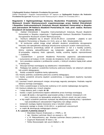 I Ogólnopolski Konkurs Studentów Przedmiotu Dyrygowanie Zakład Chóralistyki i Zespołów Instrumentalnych AP zaprasza na Ogólnopolski Konkurs dla Studentów Przedmiotu Dyrygowanie Wyższych Uczelni Niemuzycznych w dniach 14-15 kwietnia 2011 r. Regulamin I Ogólnopolskiego Konkursu Studentów Przedmiotu Dyrygowanie Wyższych Uczelni Niemuzycznych organizowanego przez Zakład Chóralistyki i Zespołów Instrumentalnych Instytutu Muzyki Akademii Pomorskiej w Słupsku pod patronatem JM Rektora Akademii Pomorskiej dr. hab. prof. nadzw. Romana Drozda14-15 kwietnia 2011r. 1) Zakład Chóralistyki i Zespołów Instrumentalnych Instytutu Muzyki Akademii Pomorskiej w Słupsku organizuje I Ogólnopolski Konkurs Studentów Przedmiotu Dyrygowanie Wyższych Uczelni Niemuzycznych; 2) Konkurs odbędzie się w dniach 14/15.04.2011r. (czwartek – piątek) w auli Akademii Pomorskiej w Słupsku (nr 414), przy ul. Boh. Westerplatte 64; 3) W konkursie udział mogą wziąć aktualni studenci przedmiotu dyrygowanie kierunku lub specjalności edukacja artystyczna wyższych uczelni niemuzycznych; 4) Organizatorzy przewidują udział 16 uczestników (1 lub 2 z każdej uczelni), którzy zostaną zakwalifikowani wg kolejności zgłoszeń do 15.03.2011r. W przypadku większej ilości zgłoszeń, każdą uczelnię będzie reprezentować 1 uczestnik; 5) Uczestnikom i jurorom Akademia Pomorska zapewnia zakwaterowanie i wyżywienie od kolacji 13.04. (środa) do śniadania 16.04. 2011r.(sobota); 6) Jury powołane zostanie z profesorów uczelni, z których studenci będą brali udział w konkursie; 7) Decyzje komisji oceniającej są ostateczne i nieodwołalne; 8) Pedagog lub opiekun uczestnika konkursu pokrywa koszty we własnym zakresie lub uczelni delegującej; 9) Każdy uczestnik wypełnia kartę zgłoszenia; 10) Koszty podróży uczestnika pokrywa uczelnia delegująca; 11) Każdy uczestnik otrzyma dyplom uczestnictwa, a nagrodzeni dyplomy laureata konkursu; 12) Laureaci trzech pierwszych miejsc otrzymają nagrody pieniężne. Podziału nagród dokona komisja oceniająca; 13) Chóry uczestniczące w konkursie wybiorą w ich ocenie najlepszego dyrygenta; 14) Konkurs składa się z trzech etapów: I etap złożony jest z części A i B każda z części punktowana będzie oddzielnie przez komisję oceniającą w części A każdy z dyrygentów poprowadzi próbę z chórem mieszanym (15 min.) złożonym ze śpiewaków amatorów, którym utwór nie jest znany w tej części uczestnik powinien wykazać się efektywną metodą pracy i sposobem nad prawidłowym odczytaniem fragmentu lub całego utworu kolejność występu będzie losowana wraz z tytułem utworu losowanie nastąpi w środę 13.04.2011r. w godzinach wieczornych w części A obowiązują następujące utwory: J. K. Lasocki Z pieśnią zeszyt I Stanisław Kazuro Krakowiak z. I PWM, s. 34 opr. Wacław Lachman Niech na zawsze s. 40 s. M. Matuszkiewicz, opr. Wacław Lachman Deszcz jesienny s. 42 Zygmunt Noskowski W lesie s. 52 Feliks Nowowiejski Jak szumi Bałtyk s. 56 1 Karol Maria Prosnak Skowronek s. 60 opr. S. Rożdżański Oj nasi jadą s. 66 J. K. Lasocki Z pieśnią zeszyt II Stanisław Kazuro Gra fal s. 16 opr. J. K. Lasocki Oj świeci miesiąc s. 22 Piotr Maszyński Mazur s. 27 opr. Tadeusz Paciorkiewicz Tańcujze, dziwcyno s. 46 opr. Tadeusz Szeligowski A wyjżyjcież pacholęta s. 70 J. K. Lasocki Z pieśnią zeszyt III J. Gall, opr. Jan Maklakiewicz Panieneczko jasnowłosa s. 2 Jan Maklakiewicz Pieśń o polskim morzu s. 27 Stanisław Moniuszko, opr. Stanisław Wiechowicz Kozak s. 38 W. Raczkowski Oj, uśnij s. 68 zespół wykonawczy: chór Kantele ze Słupska W części B uczestnicy będą pracować nad interpretacją utworu Andrzeja Koszewskiego Non sum dignus, który jest wspólny dla wszystkich i został przygotowany wcześniej przez chór zespół wykonawczy: chór Akademii Pomorskiej Juventus Cantans czas pracy z chórem 15 min. łączny czas I etapu: 30 min. W II etapie udział weźmie 8 uczestników, którzy łącznie w części A i B zdobyli największą ilość punktów Dyrygenci losują nową kolejność oraz jeden z czterech utworów, które zostaną wykonane dwukrotnie. Uczestnicy konkursu w tej części będą pracowali nad interpretacją utworu, który znany jest chórowi. Każdy dyrygent ma do dyspozycji 30 min. w II etapie obowiązują następujące pieśni: s. Jerzy Liebert, m. Marek Jasiński Muzyka poranna opr. Antoni Gref Szła dzieweczka s. Adam Mickiewicz, m. Feliks Nowowiejski Pieśń dudarza Feliks Nowowiejski Parce Domine W III etapie weźmie udział 4 uczestników, którzy ponownie losują kolejność występu wraz z jednym z czterech utworów, które znane są chórowi, a którym należy nadać odpowiednią interpretację: Romuald Twardowski Alleluja Orlando di Lasso Jubilate Deo Albert Borg Sequentia Paschalis Marcin Łukaszewski Parce Domine czas pracy z chórem 30 min., łącznie próba z wykonaniem zespół wykonawczy: chór Akademii Pomorskiej Juventus Cantans jury oceniać będzie uczestników w skali 1-25 punktów bdb ++ 25 pkt., bdb+ 24, bdb 23, bdb- 22, bdb – 21, db ++ 20, db+ 19, db 18, db- 18, db - - 16, dst ++ 15, dst + 14, dst 13, dst- 12, dst - - 11, ndst 10-1 materiał nutowy do I etapu J. K. Lasocki Z pieśnią z. I, II i III zapewne dostępny jest w każdej uczelni. Nuty do utwory A. Koszewskiego Non sum dignus oraz do II i III etapu zostaną przesłane wraz z zaproszeniem do udziału w konkursie. 2 15) na ocenę jury składać się będą następujące elementy pracy z chórem: forma ćwiczeń emisyjnych umiejętność posługiwania się kamertonem (podczas konkursu uczestnicy nie mogą posługiwać się fortepianem) znajomość tekstu muzycznego nawiązanie kontaktu z chórem intonacja, artykulacja, dynamika zainteresowanie i atrakcyjność pracy z chórem stosowanie terminologii muzycznej zrozumienie formy utworu posługiwanie się własnym głosem poprawność i technika dyrygowania skuteczność p