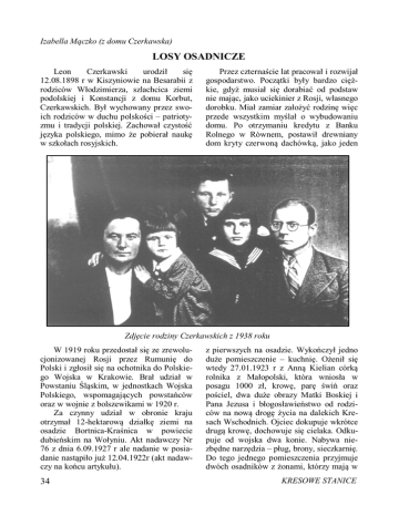 Izabella Mączko (z domu Czerkawska) LOSY OSADNICZE Leon Czerkawski urodził się 12.08.1898 r w Kiszyniowie na Besarabii z rodziców Włodzimierza, szlachcica ziemi podolskiej i Konstancji z domu Korbut, Czerkawskich. Był wychowany przez swoich rodziców w duchu polskości – patriotyzmu i tradycji polskiej. Zachował czystość języka polskiego, mimo że pobierał naukę w szkołach rosyjskich. Przez czternaście lat pracował i rozwijał gospodarstwo. Początki były bardzo ciężkie, gdyż musiał się dorabiać od podstaw nie mając, jako uciekinier z Rosji, własnego dorobku. Miał zamiar założyć rodzinę więc przede wszystkim myślał o wybudowaniu domu. Po otrzymaniu kredytu z Banku Rolnego w Równem, postawił drewniany dom kryty czerwoną dachówką, jako jeden Zdjęcie rodziny Czerkawskich z 1938 roku W 1919 roku przedostał się ze zrewolucjonizowanej Rosji przez Rumunię do Polski i zgłosił się na ochotnika do Polskiego Wojska w Krakowie. Brał udział w Powstaniu Śląskim, w jednostkach Wojska Polskiego, wspomagających powstańców oraz w wojnie z bolszewikami w 1920 r. Za czynny udział w obronie kraju otrzymał 12-hektarową działkę ziemi na osadzie Bortnica-Kraśnica w powiecie dubieńskim na Wołyniu. Akt nadawczy Nr 76 z dnia 6.09.1927 r ale nadanie w posiadanie nastąpiło już 12.04.1922r (akt nadawczy na końcu artykułu). 34 z pierwszych na osadzie. Wykończył jedno duże pomieszczenie – kuchnię. Ożenił się wtedy 27.01.1923 r z Anną Kielian córką rolnika z Małopolski, która wniosła w posagu 1000 zł, krowę, parę świń oraz pościel, dwa duże obrazy Matki Boskiej i Pana Jezusa i błogosławieństwo od rodziców na nową drogę życia na dalekich Kresach Wschodnich. Ojciec dokupuje wkrótce drugą krowę, dochowuje się cielaka. Odkupuje od wojska dwa konie. Nabywa niezbędne narzędzia – pług, brony, sieczkarnię. Do tego jednego pomieszczenia przyjmuje dwóch osadników z żonami, którzy mają w KRESOWE STANICE sąsiedztwie działki, ale nie mają jeszcze domów. 6 grudnia 1923 roku rodzi się syn pierworodny Bolesław. Z czasem buduje stajnię i stodołę, a następnie murowany chlewik z kurnikiem. Gospodarstwo się rozwija, przybywa bydła, świń i drobiu. Sąsiedzi przenoszą się do swoich domostw. Wykańcza stopniowo dom – dwa pokoje i spichrzo-spiżarnię. Następnie tynkuje dom zewnątrz i wykańcza sień i ganek. Osadnicy zakładają sady i chmielarnie, a osadniczki warzywniki i ogródki kwiatowe. Drzewa owocowe sprowadzono z poznańskiego. Nasz sad liczył ponad dwadzieścia jabłoni, kilka wiśni, trzy gruszki i morwę. Zabudowania gospodarcze od strony północnej były obsadzone czereśniami, z czego największy pożytek miały wróble i szpaki. W warzywniku, jak sama nazwa wskazuje, były warzywa. Były też szpalery malin, zagony truskawek i poziomek oraz rabarbar. Rosły krzewy porzeczek i agrestu. Piękny był ogródek kwiatowy – pełen kwiatów: floksów, piwonii, stokrotek, rezedy, pachnącej maciejki i bratków – ulubionych kwiatów mojej Matki. Pośrodku ogródka rosła rozłożysta jabłoń – tyrolka, a pod nią stała ławeczka, na której można było odpocząć w cieniu po znojnej pracy. Pod ścianą rósł krzak bzu i białej pachnącej róży. Wjazd do domu, od drogi do bramy, był obsadzony żywopłotem. Wjeżdżało się na podwórze z górki, gdyż teren był górzysty, a dom i budynki gospodarcze były usytuowane w dolince osłoniętej wzniesieniami od wiatru. Przez środek działki biegła dolina porośnięta trawą, gdzie pasło się bydło, a latem, gdy padał ulewny deszcz, płynęła woda, z której uciechę miały dzieci pluskając się w niej lub pływając balią. W 1927 roku urodziła się córka Izabella, pięć lat później drugi syn (zmarł mając dziewięć miesięcy), a następnie córka Wanda. Dzieci rosły, starszy syn poszedł do szkoły powszechnej, która mieściła się w domu jednego z osadników, a córka do pierwszej klasy czteroklasowej szkoły, która była na osadzie Iwanówka – tam było bliżej i choKRESOWE STANICE dziły do niej rówieśniczki sąsiadów. Na osadzie Bortnica-Kraśnica było około 84 osadników wojskowych. Obok Bortnicy leżały osada wojskowa Iwanówka i polska osada cywilna Bortnica, a wokół były wsie ukraińskie Pogorzelce, Buszkiewicze, Iwanówka, czeska wieś Ludgardówka oraz kolonia niemiecka Hanczarycha. Między wsią Iwanówka a Ludgardówką ciągnął się Las Iwański. Działki osadnicze były przeważnie o powierzchni 45 ha. Otrzymali je zasłużeni oficerowie. Z Bortnicy do miasta powiatowego Dubna było około 10 km. Bortnica należała do parafii rzymskokatolickiej kościoła farnego w Dubnie. Praca na roli była bardzo ciężka, gdyż brak było zmechanizowanych urządzeń. Posługiwano się pługami, kosami i bronami, później pojawiły się siewniki, grabiarki, kultywatory, a następnie kosiarki. Przeważnie uprawiało się pszenicę, żyto, owies, ziemniaki i buraki pastewne. Uprawa chmielu trwała krótko, gdyż nie była opłacalna – ceny na chmiel były wówczas bardzo niskie. Trzeba było zlikwidować chmielarnię, zostały tylko po niej pale i drut. Osadnicy zajmowali się, poza gospodarką rolną, hodowlą trzody i bydła. Powiatowy Oddział Związku Osadników w Dubnie wspomagał w miarę możliwości brać osadniczą m.in. w uzyskaniu kredytów itp. W okolicy powstały kółka rolnicze propagujące nowości w uprawie rolnej i hodowli. Organizowane były wystawy rolnicze, na których eksponowano osiągnięcia produkcyjne, nowe urządzenia, nawozy itp. Organizowano różne kursy m.in. 3dniowy kurs przeszkolenia przodowników życia i kultury wsi O.T.O i K.R. w Dubnie w dniach 10-12.I.1934 r. Na osadzie poza szkołą powszechną powstała mleczarnia, do której odstawiało się mleko i można tam było nabyć masło, a więc nie trzeba było robić go w domu. Był też sklepik. Większe zakupy robiło się w Dubni
