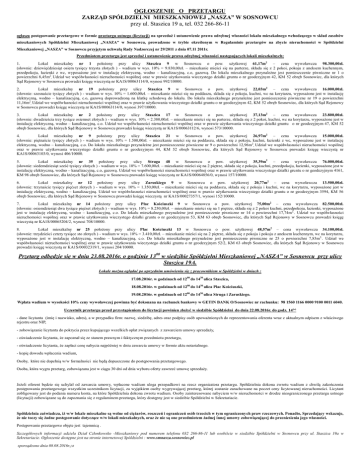 OGŁOSZENIE O PRZETARGU ZARZĄD SPÓŁDZIELNI MIESZKANIOWEJ „NASZA” W SOSNOWCU przy ul. Staszica 19 a, tel. 032 266-86-11 ogłasza postępowanie przetargowe w formie przetargu ustnego (licytacji) na sprzedaż i ustanowienie prawa odrębnej własności lokalu mieszkalnego wchodzącego w skład zasobów mieszkaniowych Spółdzielni Mieszkaniowej „NASZA” w Sosnowcu, prowadzone w trybie określonym w Regulaminie przetargów na zbycie nieruchomości w Spółdzielni Mieszkaniowej „NASZA” w Sosnowcu przyjętym uchwałą Rady Nadzorczej nr 29/2011 z dnia 07.11 2011r. Przedmiotem przetargu jest sprzedaż i ustanowienie prawa odrębnej własności następujących lokali mieszkalnych: 1. Lokal mieszkalny nr 1 położony przy ulicy Staszica 9 w Sosnowcu o pow. użytkowej 61,17m2 – cena wywoławcza 98.300,00zł. (słownie: dziewięćdziesiąt osiem tysięcy trzysta złotych ) - wadium w wys. 10% = 9.830,00zł. – mieszkanie mieści się na parterze, składa się z 2 pokoi, pokoju z aneksem kuchennym, przedpokoju, łazienki z wc, wyposażone jest w instalację elektryczną, wodno – kanalizacyjną, c.o, gazową. Do lokalu mieszkalnego przynależne jest pomieszczenie piwniczne nr 1 o powierzchni 8,45m2. Udział we współwłasności nieruchomości wspólnej oraz w prawie użytkowania wieczystego działki gruntu o nr geodezyjnym 42, KM 52 obręb Sosnowiec, dla których Sąd Rejonowy w Sosnowcu prowadzi księgę wieczystą nr KA1S/00063114/0, wynosi 992/10000. 2. Lokal mieszkalny nr 19 położony przy ulicy Staszica 9 w Sosnowcu o pow. użytkowej 22,03m2 – cena wywoławcza 16.000,00zł. (słownie: szesnaście tysięcy złotych ) - wadium w wys. 10% = 1.600,00zł. – mieszkanie mieści się na poddaszu, składa się z pokoju, kuchni, wc na korytarzu, wyposażone jest w instalację elektryczną, wodno – kanalizacyjną, c.o, gazową doprowadzoną na klatkę schodową do lokalu. Do lokalu mieszkalnego przynależne jest pomieszczenie piwniczne nr 19 o powierzchni 11,16m2. Udział we współwłasności nieruchomości wspólnej oraz w prawie użytkowania wieczystego działki gruntu o nr geodezyjnym 42, KM 52 obręb Sosnowiec, dla których Sąd Rejonowy w Sosnowcu prowadzi księgę wieczystą nr KA1S/00063114/0, wynosi 397/10000. 3. Lokal mieszkalny nr 2 położony przy ulicy Staszica 17 w Sosnowcu o pow. użytkowej 37,13m2 – cena wywoławcza 23.800,00zł. (słownie: dwadzieścia trzy tysiące osiemset złotych ) - wadium w wys. 10% = 2.380,00zł. – mieszkanie mieści się na parterze, składa się z 2 pokoi, kuchni, wc na korytarzu, wyposażone jest w instalację elektryczną, wodno – kanalizacyjną, c.o. Udział we współwłasności nieruchomości wspólnej oraz w prawie użytkowania wieczystego działki gruntu o nr geodezyjnym 47, KM 52 obręb Sosnowiec, dla których Sąd Rejonowy w Sosnowcu prowadzi księgę wieczystą nr KA1S/00063112/6, wynosi 573/10000. 4. Lokal mieszkalny nr 9 położony przy ulicy Staszica 21 w Sosnowcu o pow. użytkowej 26,97m2 – cena wywoławcza 15.000,00zł. (słownie: piętnaście tysięcy złotych ) - wadium w wys. 10% = 1.500,00zł. – mieszkanie mieści się na poddaszu, składa się z pokoju, kuchni, łazienki z wc, wyposażone jest w instalację elektryczną, wodno – kanalizacyjną, c.o. Do lokalu mieszkalnego przynależne jest pomieszczenie piwniczne nr 9 o powierzchni 12,96m2. Udział we współwłasności nieruchomości wspólnej oraz w prawie użytkowania wieczystego działki gruntu o nr geodezyjnym 44, KM 52 obręb Sosnowiec, dla których Sąd Rejonowy w Sosnowcu prowadzi księgę wieczystą nr KA1S/00063103/0, wynosi 406/10000. 5. Lokal mieszkalny nr 35 położony przy ulicy Struga 48 w Sosnowcu o pow. użytkowej 35,39m2 – cena wywoławcza 76.000,00zł. (słownie: siedemdziesiąt sześć tysięcy złotych ) - wadium w wys. 10% = 7.600,00zł. – mieszkanie mieści się na 2 piętrze, składa się z pokoju, kuchni, przedpokoju, łazienki, wyposażone jest w instalację elektryczną, wodno – kanalizacyjną, c.o, gazową. Udział we współwłasności nieruchomości wspólnej oraz w prawie użytkowania wieczystego działki gruntu o nr geodezyjnym 4161, KM 98 obręb Sosnowiec, dla których Sąd Rejonowy w Sosnowcu prowadzi księgę wieczystą nr KA1S/00064856/0, wynosi 157/10000. 6. Lokal mieszkalny nr 12 położony przy ulicy Zaruskiego 9 w Sosnowcu o pow. użytkowej 20,77m2 – cena wywoławcza 13.500,00zł. (słownie: trzynaście tysięcy pięćset złotych ) - wadium w wys. 10% = 1.350,00zł. – mieszkanie mieści się na poddaszu, składa się z pokoju i kuchni, wc na korytarzu, wyposażone jest w instalację elektryczną, wodno – kanalizacyjną. Udział we współwłasności nieruchomości wspólnej oraz w prawie użytkowania wieczystego działki gruntu o nr geodezyjnym 3594, KM 56 obręb Sosnowiec, dla których Sąd Rejonowy w Sosnowcu prowadzi księgę wieczystą nr KA1S/00027357/1, wynosi 152/10000. 7. Lokal mieszkalny nr 14 położony przy ulicy Plac Kościuszki 9 w Sosnowcu o pow. użytkowej 75,00m2 – cena wywoławcza 82.500,00zł. (słownie: osiemdziesiąt dwa tysiące pięćset złotych ) - wadium w wys. 10% = 8.250,00zł. – mieszkanie mieści się na 1 piętrze, składa się z 2 pokoi kuchni, przedpokoju, łazienki, wyposażone jest w instalację elektryczną, wodno – kanalizacyjną, c.o. Do lokalu mieszkalnego przynależne jest pomieszczenie piwniczne nr 14 o powierzchni 17,74m 2.. Udział we współwłasności nieruchomości wspólnej oraz w prawie użytkowania wieczystego działki gruntu o nr geodezyjnym 53, KM 63 obręb Sosnowiec, dla których Sąd Rejonowy w Sosnowcu prowadzi księgę wieczystą nr KA1S/00065204/2, wynosi 708/10000. 8. Lokal mieszkalny nr 25 położony przy ulicy Plac Kościuszki 13 w Sosnowcu o pow. użytkowej 48,57m2 – cena wywoławcza 34.100,00zł. (słownie: trzydzieści cztery tysiące sto złotych ) - wadium w wys. 10% = 3.410,00zł. – mieszkanie mieści się na 2 piętrze, składa si