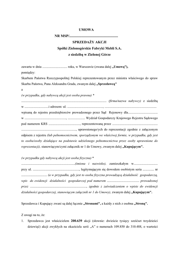 UMOWA NR MSP/...................................................... SPRZEDAŻY AKCJI Spółki Zielonogórskie Fabryki Mebli S.A. z siedzibą w Zielonej Górze zawarta w dniu .............................. roku, w Warszawie (zwana dalej „Umową”), pomiędzy: Skarbem Państwa Rzeczypospolitej Polskiej reprezentowanym przez ministra właściwego do spraw Skarbu Państwa, Pana Aleksandra Grada, zwanym dalej „Sprzedawcą" a (w przypadku, gdy nabywcą akcji jest osoba prawna) * ....................................................................................................... (firma/nazwa nabywcy) z siedzibą w .............................i adresem: ul. ..........................................., ............................................................... wpisaną do rejestru przedsiębiorców prowadzonego przez Sąd Rejonowy dla.................................... w .................................................., ..................... Wydział Gospodarczy Krajowego Rejestru Sądowego pod numerem KRS ......................................, reprezentowaną przez ....................................................... .................................................................., uprawnionego/ych do reprezentacji zgodnie z załączonym odpisem z rejestru (lub pełnomocnictwem, sporządzonym we właściwej formie, w przypadku, gdy jest to osoba/osoby działające na podstawie udzielonego pełnomocnictwa przez osoby uprawnione do reprezentacji), stanowiącym/cymi załącznik nr 1 do Umowy, zwanym dalej „Kupującym". (w przypadku gdy nabywcą akcji jest osoba fizyczna) * .................................................................(imiona i nazwisko), zamieszkałym w............................. przy ul. ........................................................, legitymującym się dowodem osobistym seria .............. nr ............................... (a w przypadku, gdy jest to osoba fizyczna prowadzącą działalność gospodarczą, wpis do ewidencji działalności gospodarczej pod numerem ....................................... prowadzonej przez ...................................................................., zgodnie z zaświadczeniem o wpisie do ewidencji działalności gospodarczej, stanowiącym załącznik nr 1 do Umowy), zwanym dalej „Kupującym". Sprzedawca i Kupujący zwani są dalej łącznie „Stronami", a każdy z nich z osobna „Stroną". Z uwagi na to, że: 1. Sprzedawca jest właścicielem 200.639 akcji (słownie: dwieście tysięcy sześćset trzydzieści dziewięć) akcji zwykłych na okaziciela serii „A” o numerach 109.850 do 310.488, o wartości nominalnej 2,81 (słownie: dwa złote osiemdziesiąt jeden groszy) złote każda, stanowiących 3,76% kapitału zakładowego spółki pod firmą Zielonogórskie Fabryki Mebli S.A. z siedzibą w Zielonej Górze, wpisanej do rejestru przedsiębiorców prowadzonego przez Sąd Rejonowy w Zielonej Górze, VIII Wydział Gospodarczy Krajowego Rejestru Sądowego, pod numerem KRS 0000078402, zwanej dalej „Spółką". Odpis z rejestru przedsiębiorców Spółki stanowi załącznik nr 2 do Umowy. 2. Sprzedawca oświadcza, że sprzedawane przez niego Akcje są wolne od jakichkolwiek ograniczeń w zbywaniu lub innych obciążeń oraz nie są przedmiotem roszczeń jakichkolwiek osób trzecich. 3. Kupujący zaoferował najwyższą cenę w aukcji nr .............., której przedmiotem było 200.639 (słownie: dwieście tysięcy sześćset trzydzieści dziewięć) akcji zwykłych na okaziciela serii „A”, o numerach od 109.850 do 310.488 stanowiących 3,76% kapitału zakładowego, zwanych dalej „Akcjami” Skarbu Państwa w Spółce pod firmą Zielonogórskie Fabryki Mebli S.A. z siedzibą w Zielonej Górze, przeprowadzoną zgodnie z obowiązującymi przepisami prawa. Strony zgodnie postanawiają co następuje: §1 1. Sprzedawca sprzedaje, a Kupujący kupuje Akcje. 2. Cena sprzedaży jednej Akcji wynosi ................................ (słownie: ........................ ) złotych, zwaną dalej „Cena Jednej Akcji” 3. Całkowita cena sprzedaży Akcji wynosi ....................................... (słownie: ......................... ..................................................................) złotych i jest równa iloczynowi „Ceny Jednej Akcji” i liczby nabywanych Akcji przez Kupującego. §2 1. Sprzedawca potwierdza, że Kupujący dokonał zapłaty kwoty określonej w § 1 ust. 3 Umowy, pomniejszonej o wysokość wpłaconego wadium w kwocie ..................................... (słownie:.............. ......................................................) złotych przelewem na rachunek Ministerstwa Skarbu Państwa w Narodowym Banku Polskim O/O w Warszawie numer 03 1010 1010 0025 1213 3920 0000 2. Sprzedawca niniejszym potwierdza otrzymanie kwoty stanowiącej całkowitą cenę sprzedaży Akcji. §3 1. Przeniesienie Akcji na rzecz Kupującego nastąpi po podpisaniu niniejszej Umowy i złożeniu przez Sprzedawcę dyspozycji przeniesienia 200.639 akcji zwykłych na okaziciela serii A o wartości nominalnej 2,81 zł o numerach od 109.850 do 310.488 znajdujących się w depozycie papierów wartościowych (zwanym dalej „Depozytem”) prowadzonym przez Dom Maklerski BZ WBK S.A. z siedzibą w Poznaniu przy ul. Wolności 15 (zwanym dalej „Depozytariuszem”). Przeniesienie na Kupującego Akcji (wydanie Kupującemu) znajdujących się w Depozycie prowadzonym przez Depozytariusza, nastąpi na podstawie dyspozycji stanowiącej załącznik nr 3 do niniejszej Umowy. Dyspozycja przeniesienia Akcji, o której mowa powyżej stanowi skuteczne zawiadomienie, o którym mowa w art. 350 KC. 2. Sprzedawca oświadcza, że złożenie Dyspozycji o której mowa w ust. 1 do Depozytariusza nastąpi niezwłocznie po podpisaniu umowy. §4 1. Kupujący oświadcza, że zawarcie Umowy przez Kupującego nie narusza przepisów prawa polskiego, ani postanowień jakiegokolwiek zezwolenia, upoważnienia lub zwolnienia w