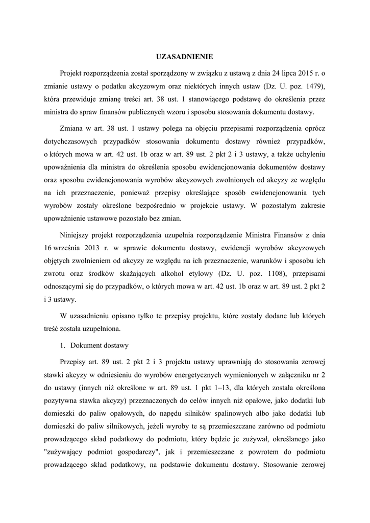 UZASADNIENIE Projekt rozporządzenia został sporządzony w związku z ustawą z dnia 24 lipca 2015 r. o zmianie ustawy o podatku akcyzowym oraz niektórych innych ustaw (Dz. U. poz. 1479), która przewiduje zmianę treści art. 38 ust. 1 stanowiącego podstawę do określenia przez ministra do spraw finansów publicznych wzoru i sposobu stosowania dokumentu dostawy. Zmiana w art. 38 ust. 1 ustawy polega na objęciu przepisami rozporządzenia oprócz dotychczasowych przypadków stosowania dokumentu dostawy również przypadków, o których mowa w art. 42 ust. 1b oraz w art. 89 ust. 2 pkt 2 i 3 ustawy, a także uchyleniu upoważnienia dla ministra do określenia sposobu ewidencjonowania dokumentów dostawy oraz sposobu ewidencjonowania wyrobów akcyzowych zwolnionych od akcyzy ze względu na ich przeznaczenie, ponieważ przepisy określające sposób ewidencjonowania tych wyrobów zostały określone bezpośrednio w projekcie ustawy. W pozostałym zakresie upoważnienie ustawowe pozostało bez zmian. Niniejszy projekt rozporządzenia uzupełnia rozporządzenie Ministra Finansów z dnia 16 września 2013 r. w sprawie dokumentu dostawy, ewidencji wyrobów akcyzowych objętych zwolnieniem od akcyzy ze względu na ich przeznaczenie, warunków i sposobu ich zwrotu oraz środków skażających alkohol etylowy (Dz. U. poz. 1108), przepisami odnoszącymi się do przypadków, o których mowa w art. 42 ust. 1b oraz w art. 89 ust. 2 pkt 2 i 3 ustawy. W uzasadnieniu opisano tylko te przepisy projektu, które zostały dodane lub których treść została uzupełniona. 1. Dokument dostawy Przepisy art. 89 ust. 2 pkt 2 i 3 projektu ustawy uprawniają do stosowania zerowej stawki akcyzy w odniesieniu do wyrobów energetycznych wymienionych w załączniku nr 2 do ustawy (innych niż określone w art. 89 ust. 1 pkt 1–13, dla których została określona pozytywna stawka akcyzy) przeznaczonych do celów innych niż opałowe, jako dodatki lub domieszki do paliw opałowych, do napędu silników spalinowych albo jako dodatki lub domieszki do paliw silnikowych, jeżeli wyroby te są przemieszczane zarówno od podmiotu prowadzącego skład podatkowy do podmiotu, który będzie je zużywał, określanego jako "zużywający podmiot gospodarczy", jak i przemieszczane z powrotem do podmiotu prowadzącego skład podatkowy, na podstawie dokumentu dostawy. Stosowanie zerowej –2– stawki akcyzy dotyczy także ww. wyrobów, jeżeli są one przemieszczane na terytorium kraju poza procedurą zawieszenia poboru akcyzy na podstawie dokumentu dostawy do składu podatkowego, w przypadku ich niedostarczenia do zużywającego podmiotu gospodarczego, a także jeżeli wyroby te nabyte wewnątrzwspólnotowo przez zarejestrowanego odbiorcę są dostarczane przez niego do zużywającego podmiotu gospodarczego poza procedurą zawieszenia poboru akcyzy na podstawie dokumentu dostawy. W związku z powyższym, w § 2 ust. 1 pkt 1 projektu rozporządzenia, określającym przypadki, w których dokument dostawy jest wystawiany przez podmiot prowadzący skład podatkowy, dodano lit. c i d stanowiące, iż podmiot prowadzący skład podatkowy będzie wystawiał dokument dostawy w przypadku: - przemieszczania na terytorium kraju poza procedurą zawieszenia poboru akcyzy wyrobów opodatkowanych zerową stawką akcyzy z jego składu podatkowego do podmiotu, który zużywa je w ramach prowadzonej działalności gospodarczej do celów uprawniających do zastosowania zerowej stawki akcyzy, - przemieszczania wyrobów opodatkowanych zerową stawką akcyzy do składu podatkowego od zużywającego podmiotu gospodarczego. W § 2 ust. 1 pkt 3 projektu rozporządzenia doprecyzowano natomiast w jakich przypadkach dokument dostawy jest wystawiany przez zarejestrowanego odbiorcę. Dotychczasową jednostkę redakcyjną podzielono na dwa fragmenty (punkty), uwzględniając w dodanym pkt 2 przypadek wystawiania dokumentu dostawy przez zarejestrowanego odbiorcę dostarczającego nabyte wewnątrzwspólnotowo wyroby opodatkowane zerową stawką akcyzy do zużywającego podmiotu gospodarczego na terytorium kraju poza procedurą zawieszenia poboru akcyzy. W konsekwencji zmian dokonanych w § 2 ust. 1, przepisem § 2 ust. 2 określającym w dotychczasowym brzmieniu m.in. ilość egzemplarzy dokumentu dostawy wystawianych przez zarejestrowanego odbiorcę oraz podmiot prowadzący skład podatkowy, z którego wyroby akcyzowe zwolnione od akcyzy ze względu na przeznaczenie są przemieszczane do podmiotu odbierającego oraz ich przeznaczenie, objęto również ww. wyroby akcyzowe wyroby opodatkowane zerową stawką akcyzy. Ponieważ obrót wyrobami zwolnionymi od akcyzy ze względu na ich przeznaczenie i wyrobami opodatkowanymi zerową stawką akcyzy odbywa się na podobnych zasadach, zastosowano w powyższym przypadku identyczną regulację dla obu grup wyrobów. –3– Analogiczne rozwiązanie zastosowano w § 2 ust. 3 i 4 regulującymi ilość, przeznaczenie i sposób postępowania z egzemplarzami dokumentu dostawy w przypadku przemieszczania ww. wyrobów akcyzowych (zwolnionych od akcyzy i opodatkowanych zerową stawką akcyzy) od ich odbiorcy z powrotem do podmiotu prowadzącego skład podatkowego, dzieląc jednocześnie treść ust. 3 na pkt 1 i 2, ze względu na konieczność pozostawienia w pkt 2 dotychczasowej regulacji w odniesieniu do podmiotu pośredniczącego. W § 2 ust. 5 uzupełniono przepis zgodnie, z którym w przypadku przemieszczania wyrobów opodatkowanych zerową stawką akcyzy, w przypadku niedostarczenia ich do zużywającego podmiotu gospodarczego podmiot prowadzący skład podatkowy odnotowuje na drugim egzemplarzu dokumentu dostawy ilość wyrobów opodatkowanych zerową stawką akcyzy niedostarczonych do ich odbiorcy, przyczynę niedostarczenia oraz datę powrotnego wprowadzenia do składu podatkowego tych wyrobów, a następnie dołącza ten egzemplarz do dwóch pozostałych egzemplarzy dokumentu dostawy, analogicznie jak ma to miejsce 