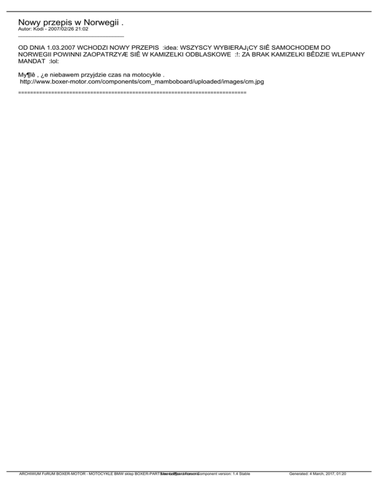 Nowy przepis w Norwegii . Autor: Kodi - 2007/02/26 21:02 _____________________________________ OD DNIA 1.03.2007 WCHODZI NOWY PRZEPIS :idea: WSZYSCY WYBIERAJ¡CY SIÊ SAMOCHODEM DO NORWEGII POWINNI ZAOPATRZYÆ SIÊ W KAMIZELKI ODBLASKOWE :!: ZA BRAK KAMIZELKI BÊDZIE WLEPIANY MANDAT :lol: My¶lê , ¿e niebawem przyjdzie czas na motocykle . http://www.boxer-motor.com/components/com_mamboboard/uploaded/images/cm.jpg ============================================================================ ARCHIWUM FoRUM BOXER-MOTOR - MOTOCYKLE BMW sklep BOXER-PARTS.eu MamboBoard czê¶ci i akcesoria Forum Component version: 1.4 Stable Generated: 4 March, 2017, 01:20
