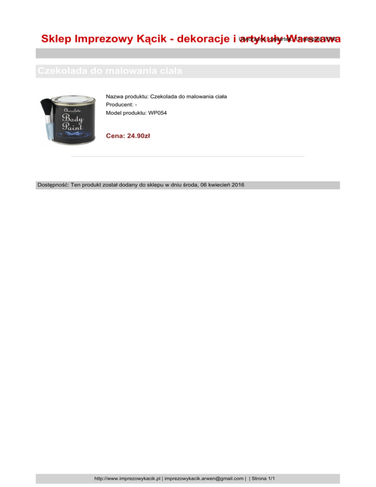 czwartek, 11 sierpień 2016 Sklep Imprezowy Kącik - dekoracje i Utworzono: artykuły Warszawa Czekolada do malowania ciała Nazwa produktu: Czekolada do malowania ciała Producent: Model produktu: WP054 Cena: 24.90zł Dostępność: Ten produkt został dodany do sklepu w dniu środa, 06 kwiecień 2016 http://www.imprezowykacik.pl | [email protected] | | Strona 1/1