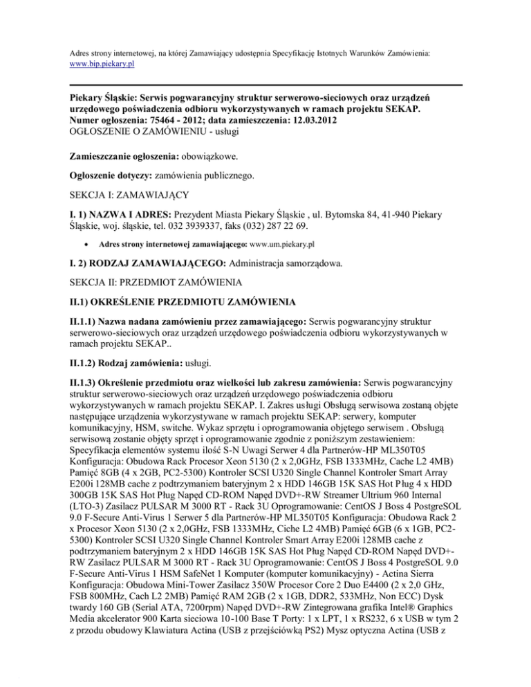 Adres strony internetowej, na której Zamawiający udostępnia Specyfikację Istotnych Warunków Zamówienia: www.bip.piekary.pl Piekary Śląskie: Serwis pogwarancyjny struktur serwerowo-sieciowych oraz urządzeń urzędowego poświadczenia odbioru wykorzystywanych w ramach projektu SEKAP. Numer ogłoszenia: 75464 - 2012; data zamieszczenia: 12.03.2012 OGŁOSZENIE O ZAMÓWIENIU - usługi Zamieszczanie ogłoszenia: obowiązkowe. Ogłoszenie dotyczy: zamówienia publicznego. SEKCJA I: ZAMAWIAJĄCY I. 1) NAZWA I ADRES: Prezydent Miasta Piekary Śląskie , ul. Bytomska 84, 41-940 Piekary Śląskie, woj. śląskie, tel. 032 3939337, faks (032) 287 22 69. • Adres strony internetowej zamawiającego: www.um.piekary.pl I. 2) RODZAJ ZAMAWIAJĄCEGO: Administracja samorządowa. SEKCJA II: PRZEDMIOT ZAMÓWIENIA II.1) OKREŚLENIE PRZEDMIOTU ZAMÓWIENIA II.1.1) Nazwa nadana zamówieniu przez zamawiającego: Serwis pogwarancyjny struktur serwerowo-sieciowych oraz urządzeń urzędowego poświadczenia odbioru wykorzystywanych w ramach projektu SEKAP.. II.1.2) Rodzaj zamówienia: usługi. II.1.3) Określenie przedmiotu oraz wielkości lub zakresu zamówienia: Serwis pogwarancyjny struktur serwerowo-sieciowych oraz urządzeń urzędowego poświadczenia odbioru wykorzystywanych w ramach projektu SEKAP. I. Zakres usługi Obsługą serwisowa zostaną objęte następujące urządzenia wykorzystywane w ramach projektu SEKAP: serwery, komputer komunikacyjny, HSM, switche. Wykaz sprzętu i oprogramowania objętego serwisem . Obsługą serwisową zostanie objęty sprzęt i oprogramowanie zgodnie z poniższym zestawieniem: Specyfikacja elementów systemu ilość S-N Uwagi Serwer 4 dla Partnerów-HP ML350T05 Konfiguracja: Obudowa Rack Procesor Xeon 5130 (2 x 2,0GHz, FSB 1333MHz, Cache L2 4MB) Pamięć 8GB (4 x 2GB, PC2-5300) Kontroler SCSI U320 Single Channel Kontroler Smart Array E200i 128MB cache z podtrzymaniem bateryjnym 2 x HDD 146GB 15K SAS Hot Pług 4 x HDD 300GB 15K SAS Hot Pług Napęd CD-ROM Napęd DVD+-RW Streamer Ultrium 960 Internal (LTO-3) Zasilacz PULSAR M 3000 RT - Rack 3U Oprogramowanie: CentOS J Boss 4 PostgreSOL 9.0 F-Secure Anti-Virus 1 Serwer 5 dla Partnerów-HP ML350T05 Konfiguracja: Obudowa Rack 2 x Procesor Xeon 5130 (2 x 2,0GHz, FSB 1333MHz, Ciche L2 4MB) Pamięć 6GB (6 x 1GB, PC25300) Kontroler SCSI U320 Single Channel Kontroler Smart Array E200i 128MB cache z podtrzymaniem bateryjnym 2 x HDD 146GB 15K SAS Hot Pług Napęd CD-ROM Napęd DVD+RW Zasilacz PULSAR M 3000 RT - Rack 3U Oprogramowanie: CentOS J Boss 4 PostgreSOL 9.0 F-Secure Anti-Virus 1 HSM SafeNet 1 Komputer (komputer komunikacyjny) - Actina Sierra Konfiguracja: Obudowa Mini-Tower Zasilacz 350W Procesor Core 2 Duo E4400 (2 x 2,0 GHz, FSB 800MHz, Cach L2 2MB) Pamięć RAM 2GB (2 x 1GB, DDR2, 533MHz, Non ECC) Dysk twardy 160 GB (Serial ATA, 7200rpm) Napęd DVD+-RW Zintegrowana grafika Intel® Graphics Media akcelerator 900 Karta sieciowa 10-100 Base T Porty: 1 x LPT, 1 x RS232, 6 x USB w tym 2 z przodu obudowy Klawiatura Actina (USB z przejściówką PS2) Mysz optyczna Actina (USB z przejściówką PS2, 2 klawisze, scroll) Monitor LG L1753S (17, LCD) UPSCAMCOGUARD800AP Oprogramowanie: Linux Fedora Core 7 PL J Boss 4 PosgreSOL 8.2 1 Switch 1 3C17300 - 3COM SuperStack 3 Switch 4226T (24 x 10-100, 2 x10-100-1000) 2 Czasy naprawy: TYP SPRZĘTU Awaria krytyczna Awaria niekrytyczna Usterka Problem trudny technicznie serwery, macierze dyskowe, streamery instalowane u Zamawiającego: Serwer 12 godzin 3 dni 7 dni 14 dni urządzenia zapewniające łączność i transmisję danych: Switch 3 godziny 3 dni 7 dni 14 dni pozostałe urządzenia: Komputer komunikacyjny HSM 12 godzin 3 dni 7 dni 14 dni Uwagi: 1. Podane czasy naprawy obowiązują tylko w przypadku napraw wynikłych przy prawidłowej eksploatacji systemu. W przeciwnym wypadku Wykonawca dołoży starań aby wykonać ją w podanych terminach, jednakże nie będzie ponosił konsekwencji w przypadku przekroczenia tych terminów. Jednakże dowiedzenie wystąpienia nieprawidłowości w eksploatacji systemu leży po stronie Wykonawcy i wymaga przedstawienia pisemnego stanowiska. 2. Podane czasy napraw mogą ulec wydłużeniu w przypadku niespełnienia przez Zamawiającego warunków określonych w innych dokumentach i procedurach, a mających wpływ na realizację serwisu przez Wykonawcę. 3. Podane czasy mogą ulec wydłużeniu w przypadku akceptacji Użytkownika (w tym również w przypadku rezygnacji Użytkownika z instalacji sprzętu zastępczego na czas naprawy uszkodzonego). Lokalizacja sprzętu: Urząd Miasta 41-940 Piekary Śląskie ul. Bytomska 84. Jeżeli w wyniku realizacji umowy sprzęt lub oprogramowanie ulegną zmianom (ulepszeniom, modyfikacjom) Wykonawca przedstawi zakres tych zmian w postaci odpowiednio zmodyfikowanej specyfikacji (protokołu zmian). Od tego momentu zmodyfikowany w ten sposób sprzęt lub oprogramowanie stanowią przedmiot umowy. Wykonawca zobowiązuje się do świadczenia usług zgodnie z zapisami umowy będącej załącznikiem do niniejszej specyfikacji. Wykonawca winien mieć doświadczenie w realizacji umów związanych z wdrożeniem bądź serwisem urządzeń HSM oraz współpracować z Śląskim Centrum Społeczeństwa Informacyjnego w zakresie modernizacji i rozwoju projektu SEKAP na czas trwania usługi. II. Szczegóły oferty cenowej: Oferta cenowa powinna obejmować wszelkie koszty związane z serwisem, w tym: utrzymania gotowości serwisowej i udostępnienia systemu zgłoszeń, utrzymania rezerwy serwisowej sprzętu, zużytych do naprawy części zamiennych (uszkodzone dyski i inne nośniki danych pozostają u zamawiającego usługę), robocizny związanej z wykonywaniem napraw, przeglądów kwartalnych sprzętu, dojazdów. Zamawiający, wymaga aby Wykonawca realizujący Zamówienie współpracował (np. na podstawie porozumienia, umowy, dwustronnego oświadczenia itp. ) z firmą obsługującą wdrożone w ramach SEKAP oprogramowanie ( LTC sp. 