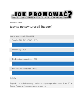 Przemysław Zieliński Jacy są polscy turyści? [Raport] Jacy są polscy turyści? (n=1001) Turyści ALL INCLUSIVE - 11% 11 Odkrywcy - 19% 19 Rodzinni wczasowicze - 25% 25 Poszukiwacze relaksu - 45% 45 Źródło: Raport z badania krajowego rynku turystycznego Warszawa, lipiec 2014 Twoja Ocena: 4.5 ( ilość osób oddających głos: 19) Na pytanie dotyczące: Jacy są polscy turyści? można odpowiedzieć w dwojaki sposób. Po pierwsze w sposób jak najbardziej intuicyjny, sugerujący to, że nie potrafimy się na przykład dobrze zachować w samolocie lub w hotelach zagranicznych. A drugie spostrzeżenia pochodzą z przeprowadzonych badań przez Polską Organizację Turystyczną. Organizacja ta jednak skupiła się przede wszystkim na tym, skąd nasi rodacy w związku z turystyką czerpią wiedzę, a także czym się inspirują. Badania, które były przeprowadzane w czerwcu, a także w lipcu 2014 roku, dotyczyły dokładniej segmentacji turystów krajowych. Przeprowadzenia tych badań podjęła się spółka PBS. Do statystyk wzięto pod uwagę przede wszystkim osoby młode, które przekroczyły jednak już 20 rok życia. Ponadto w ciągu ostatnich dwóch lat wybierali się oni na wyprawy turystyczne przynajmniej trzy razy. Ich średnie dochody netto nie były niższe niż 1500 złotych. Przebadano aż 1001 różnych osób. Te kryteria uściślono jeszcze do innych kwestii, chociażby takich jak dwie różne lokalizacje swoich wojaży, a także przynajmniej jeden pobyt w Polsce. Zebrane dane pochodzą z tak zwanego CAWI, czyli Komputer Assited Web Interview, czyli tak zwanych badań za pomocą ankiet internetowych. Jacy są polscy turyści? Bardzo się ze sobą różnią pod względem rozumienia uprawiania turystyki. Wiele osób wykazało odmienne oczekiwania, a także formy aktywności, które ich najbardziej interesują. Na podstawie opisów turystów, można było usystematyzować aż cztery różne podziały pod względem różnych podejść do turystyki. Jacy są polscy turyści? Do nich zaliczają się: Turyści Odkrywcy Turyści all inclusive Rodzinni wczasowicze Poszukiwacze relaksu Te grupy zostały stworzone również w oparciu o odpowiedzi na pytania o idealnym wypoczynku. Na przykład Odkrywcy wolą spędzać czas w nieznanych dotąd miejscach, lub przynajmniej niekomercyjnych pod względem rozwiniętej turystyki. Dla nich również liczy się na pierwszym miejscu aktywne spędzanie wolnego czasu. Natomiast turyści, którzy decydują się na wybór ofert typu all inclusive, zdecydowanie wolą pozostać w jednym miejscu i całą swoją uwagę skupić na relaksowaniu się. Dlatego też chętniej korzystają ze zorganizowanych wycieczek, podczas których nie muszą się o nic martwić. Choć pytanie „dlaczego wypoczywamy” wydaje się być retoryczne, to jednak również padło podczas badań. Tak naprawdę najwięcej odpowiedzi nie była żadnym zaskoczeniem. Rzeczywiście prawie 70 procent ankietowanych czuje potrzebę wypoczynku, odetchnięcia od codziennych obowiązków i pracy, a także by naładować baterie na kolejne dni. Rodzinni wczasowicze za swój priorytet uznali chęć spędzenia wolnego czasu z najbliższymi. Najciekawsze odpowiedzi padły oczywiście ze strony Odkrywców, którzy stwierdzali, że chcą przeżyć jakąś przygodę życia, zmierzyć się z nowymi wyzwaniami, lub kontynuować swoją pasję. Turyści z segmentu All Inclusive stawiają na jakość, by przeżyć najlepsze wakacje, a także poprawić swój stan zdrowia. Jeśli jesteśmy zainteresowani tym, skąd najczęściej czerpiemy inspiracje, dotyczące naszych wyjazdów, to najwięcej z nas poszukuje ich w Internecie.Tylko 13 procent mniej osób zadeklarowało, że inspirują się opowieściami bądź opiniami innych osób, które dobrze znają. Jacy są polscy turyści? Skąd czerpie Pan(i) pomysły na wyjazdy turystyczne? [OGÓŁEM] Czy w dane miejsce udajemy się „w ciemno”? Po przewodniki turystyczne najczęściej sięgają Odkrywcy. Natomiast po informacje z biura podróży oraz gazet turystycznych, sięgają turyści All Inclusive. Polacy uznają, że warto zwiedzać Polskę, chociaż system informacji turystycznej jest jeszcze do poprawienia. Kuleje u nas również według ankietowanych, promocja naszych walorów turystycznych, czy też są zbyt wysokie ceny, zdecydowanie przewyższające jakość oferowanej usługi. Jeśli zagraniczni turyści mieliby do nas przyjeżdżać, to co takiego mamy charakterystycznego, co pozwoliłoby nas „korzystnie zaszufladkować” w świecie turystyki? Według ankietowanych mógłby to być Kraków, bądź Mazury. Zobacz również inne ciekawe wpisy: 1. Czym jest Content Marketing? 2. Podróże samochodem w 2015 roku 3. Skąd czerpie Pan(i) pomysły na wyjazdy turystyczne? [ODKRYWCY] 4. Zakochani w podróży 5. Jak zmienić fanpage, aby mogli oceniać go Twoi klienci/turyści? Jacy są polscy turyści – blog.perspektywa.it