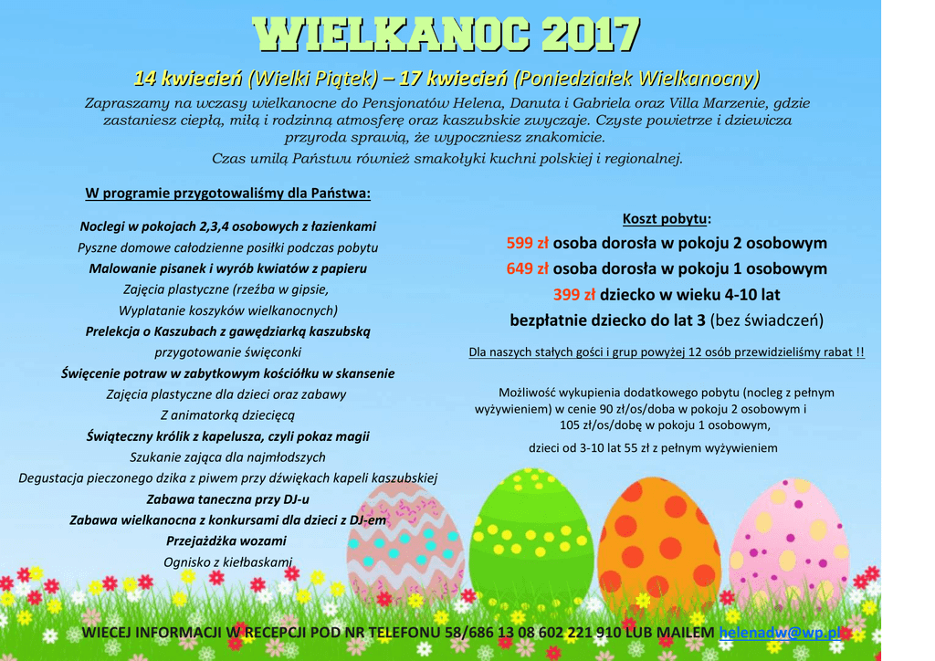 WIELKANOC 2017 14 kwiecień (Wielki Piątek) – 17 kwiecień (Poniedziałek Wielkanocny) Zapraszamy na wczasy wielkanocne do Pensjonatów Helena, Danuta i Gabriela oraz Villa Marzenie, gdzie zastaniesz ciepłą, miłą i rodzinną atmosferę oraz kaszubskie zwyczaje. Czyste powietrze i dziewicza przyroda sprawią, że wypoczniesz znakomicie. Czas umilą Państwu również smakołyki kuchni polskiej i regionalnej. W programie przygotowaliśmy dla Państwa: Noclegi w pokojach 2,3,4 osobowych z łazienkami Pyszne domowe całodzienne posiłki podczas pobytu Malowanie pisanek i wyrób kwiatów z papieru Zajęcia plastyczne (rzeźba w gipsie, Wyplatanie koszyków wielkanocnych) Prelekcja o Kaszubach z gawędziarką kaszubską przygotowanie święconki Święcenie potraw w zabytkowym kościółku w skansenie Zajęcia plastyczne dla dzieci oraz zabawy Z animatorką dziecięcą Świąteczny królik z kapelusza, czyli pokaz magii Szukanie zająca dla najmłodszych Degustacja pieczonego dzika z piwem przy dźwiękach kapeli kaszubskiej Zabawa taneczna przy DJ-u Zabawa wielkanocna z konkursami dla dzieci z DJ-em Przejażdżka wozami Ognisko z kiełbaskami Koszt pobytu: 599 zł osoba dorosła w pokoju 2 osobowym 649 zł osoba dorosła w pokoju 1 osobowym 399 zł dziecko w wieku 4-10 lat bezpłatnie dziecko do lat 3 (bez świadczeń) Dla naszych stałych gości i grup powyżej 12 osób przewidzieliśmy rabat !! Możliwość wykupienia dodatkowego pobytu (nocleg z pełnym wyżywieniem) w cenie 90 zł/os/doba w pokoju 2 osobowym i 105 zł/os/dobę w pokoju 1 osobowym, dzieci od 3-10 lat 55 zł z pełnym wyżywieniem WIECEJ INFORMACJI W RECEPCJI POD NR TELEFONU 58/686 13 08 602 221 910 LUB MAILEM [email protected]