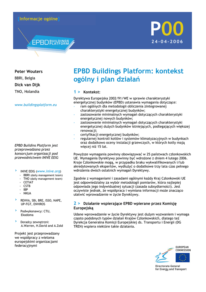 [Informacje ogólne] P00 24-04-2006 Peter Wouters BBRI, Belgia Dick van Dijk TNO, Holandia www.buildingsplatform.eu EPBD Buildins Platform jest przeprowadzana przez konsorcjum organizacji pod przewodnictwem INIVE EEIG › › › › INIVE EEIG (www.inive.org) › BBRI (daily management team) › TNO (daily management team) › CETIAT › CSTB › IBP › NKUA REHVA, SBi, BRE, ISSO, NAPE, UP-FGT, ENVIROS Podwykonawcy: CTU, Ekodoma Doradcy zewnętrzni: A.Warren, H.David and A.Zold EPBD Buildings Platform: kontekst ogólny i plan działań 1 > Kontekst: Dyrektywa Europejska 2002/91/WE w sprawie charakterystyki energetycznej budynków (EPBD) ustanawia wymagania dotyczące: › ram ogólnych dla metodologii obliczenia zintegrowanej charakterystyki energetycznej budynków; › zastosowanie minimalnych wymagań dotyczących charakterystyki energetycznej nowych budynków; › zastosowanie minimalnych wymagań dotyczących charakterystyki energetycznej dużych budynków istniejących, podlegających większej renowacji; › certyfikacji energetycznej budynków; › regularnej kontroli kotłów i systemów klimatyzacyjnych w budynkach oraz dodatkowo oceny instalacji grzewczych, w których kotły mają więcej niż 15 lat. Powyższe wymagania powinny obowiązywać w 25 państwach członkowskich UE. Wymagania Dyrektywy powinny być wdrożone z dniem 4 lutego 2006. Kraje Członkowskie mogą, w przypadku braku wykwalifikowanych i/lub akredytowanych ekspertów, wydłużyć o dodatkowe trzy lata czas pełnego wdrożenia dwóch ostatnich wymagań Dyrektywy. Zgodnie z wymaganiami i zasadami ogólnymi każdy Kraj Członkowski UE jest odpowiedzialny za wybór metodologii pomiarów, która najlepiej odpowiada jego indywidualnej sytuacji (zasada subsydiarności). Jest oczywiste jednak, że współpraca i wymiana informacji może znacząco ułatwić wprowadzenie w życie Dyrektywy. 2 > Działanie wspierające EPBD wpierane przez Komisję Europejską Udane wprowadzenie w życie Dyrektywy jest dużym wyzwaniem i wymaga często podobnych typów działań Krajów Członkowskich, dlatego też Dyrekcja Generalna Komisji Europejskiej ds. Transportu i Energii (DG TREN) wspiera niektóre takie działania. Projekt jest przeprowadzany we współpracy z wieloma europejskimi organizacjami federacyjnymi EPBD Buildings Platform > P00 PL 1 Działania wspierające EPBD Przewidziane produktysparcie: ›› ›› ›› › › › EPBD Concerted Action Strony WWW Zadanie CEN mające na celu Comiesięczny biuletyn przygotowanie standardów informacyjny związanych z EPBD Wybór baz danych Związane z EPBD projekty uwzględniające publikacje, SAVE standardy, narzędzia, wydarzenia itd. Program ManagEnergy i Kampania Europa Około 50 ulotek Zrównoważona Energetycznie informacyjnych o EPBD uwzględniających szerokie EPBD Buildings Platform spektrum tematów, takich jak stan wdrażania Dyrektywy w danym państwie, CEN, projekty SAVE, najważniejsze informacje o komferencjach związanych z EPBD, działania europejskie itd. › Helpdesk z listą FAQ ›www.epbd-ca.org Aktywna współpraca z ManagEnergy, Kampania Europa Zrównoważona Energetycznie oraz inne akcje europejskie i wiodące konferencje europejskie ›www.cenorm.be Aktywne wsparcie Krajów Członkowskich i partnerów poprzez helpdesk oraz akcje docelowe › Specjalne raporty przygotowywane na prośbę Komisji Europejskiej Baza danych http://europa.eu.int/comm/e Wdrażanie Dyrektywy jest nergy/intelligent/projects/sav tematem wielu warsztatów, e_en.htm › konferencji, szkoleń i innych, zarówno na poziomie regionalnym i państwowym, jak i europejskim. Baza danych wydarzeń bieżących udostępni informacje dotyczące takich wydarzeń › W Bazie danych publikacji będą znajdować się www.managEnergy.net informacje o istotnych publikacjach dotyczących Dyrektywy. Każda publikacji będzie miała skrócony opis. Publikacje, które nie będą podlegać prawu autorskiemu, będą dostępne w całości w formacie PDF › Baza danych norm i standardów będzie zawierała www.sustenergy.org informacje o najważniejszych standardach CEN związanych z EPBD Concerted Action EPBD Concerted Action (styczeń 2005 – czerwiec 2007) stawia sobie za cel przede wszystkim ułatwienie wymiany informacji między decydentami politycznymi zaangażowanymi we wprowadzanie Dyrektywy w życie w Krajach Członkowskich UE. Ogólne cele EPBD Concerted Action to: › poprawa i uporządkowanie wymiany informacji i doświadczeń związanych z wprowadzaniem Dyrektywy w życie w poszczególnych krajach członkowskich oraz promocja dobrych rozwiązań praktycznych związanych z wdrażaniem wymagań Dyrektywy › stworzenie korzystnych warunków dla podwyższenia stopnia zbieżności krajowych procedur administracyjnych dotyczących EPBD. › uzupełnianie pracy Komitetu Zarządzania Popytem na Energię i związanej z nim grupy, powołanej specjalnie do zajmowania się normami CEN i zadaniami związanymi z wydawaniem świadectw energetycznych budynków. W trakcie tego projektu przewidzianych jest osiem dwudniowych spotkań, na których przedstawiciele wszystkich Krajów Członkowskich (około 80 do 100 osób) będzie wymieniało między sobą informacje dotyczące różnych kwestii związanych z EPBD. Zadania dla CEN w sprawie norm dotyczących EPBD Po konsultacji z ekspertami Krajów Członkowskich, grupami interesu oraz CEN, Komisja Europejska zdecydowała, że istnieje duża potrzeba ustanowienia norm wspierających EPBD. Dla CEN wyznaczono zadanie (Mandat 343) polegające na utworzeniu zestawu norm, który bazuje na liście 31 tematów uwzględniających procedury obliczeń, pomiarów i inspekcji, w tym metody, na poziomie składników budynków i systemów. Celem jest utworzenie, w stosunkowo krótkim czasie (2004-2006), jasnego i spójnego systemu norm, które będą podstawą dla procedur formalnych w Krajach Członkowskich. Najszybciej mogą skorzystać z tego szczególnie te kraje, które m