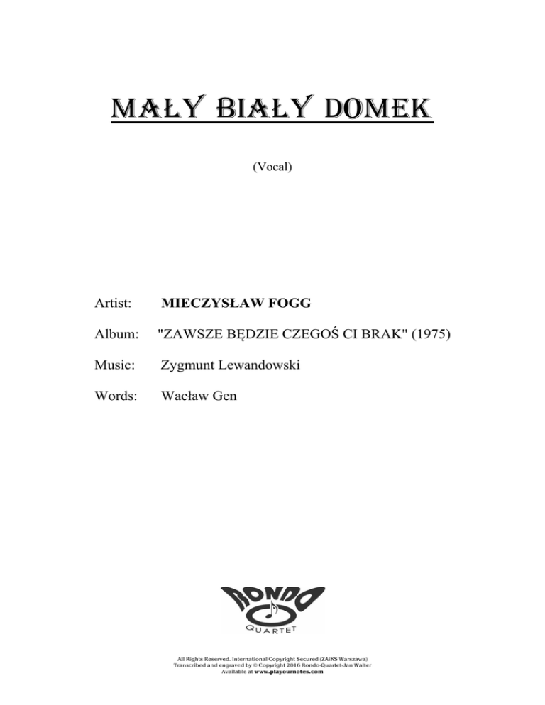 MAŁY BIAŁY DOMEK (Vocal) Artist: MIECZYSŁAW FOGG Album: "ZAWSZE BĘDZIE CZEGOŚ CI BRAK" (1975) Music: Zygmunt Lewandowski Words: Wacław Gen All Rights Reserved. International Copyright Secured (ZAiKS Warszawa) Transcribed and engraved by © Copyright 2016 Rondo-Quartet-Jan Walter Available at www.playournotes.com MAŁY BIAŁY DOMEK 1 VOCAL from "ZAWSZE BĘDZIE CZEGOŚ CI BRAK" (1975) Music by Zygmunt Lewandowski Words by Wacław Gen MIECZYSŁAW FOGG e»¡¡º 1 ## 2 V 4 nnb 8 ∑ A 10 Vb œ. W LET - 14 Vb œ œ JA - KIŚ 18 Vb œ. œ œ œ #œ NIĄ NOC SIE - DZĘ œ œ. ŻAL W SER œ œ SMUT - NĄ DZIŚ œ. PIOSN - - j œ ‰ œ SAM, œ œ j œ #œ KĘ GRAM WKO - ŁO œ. CU MAM, ‰ œ œ #œ CI - SZA MI JA - KOŚ œ. œ œ œ #œ œ TĘS - KNO - TA V ŹLE. BU - DZI œ Œ SIĘ, n## Vb 26 œ Œ œ TAK I œ PA - NU - JE. œ #œ œ . 22 B œ ## # V # 30 R.Q. All Rights Reserved. International Copyright Secured (ZAiKS Warszawa) Transcribed and engraved by © Copyright 2016 Rondo-Quartet-Jan Walter Available at www.playournotes.com J.W.