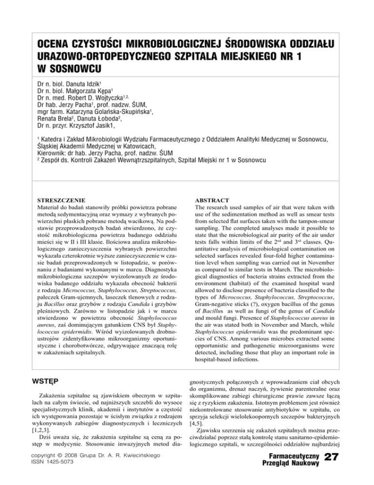 /#%.!#:934/g#)-)+2/")/,/')#:.%*g2/$/7)3+!/$$:)!|5 52!:/7//24/0%$9#:.%'/3:0)4!,!-)%*3+)%'/.2 73/3./7#5 $RNBIOL$ANUTA)DZIK $RNBIOL-AGORZATA+ÃPA $RNMED2OBERT$7OJTYCZKA $RHAB*ERZY0ACHAPROFNADZWg5- MGRFARM+ATARZYNA'OLAÊSKA3KUPIÊSKA 2ENATA"RELA$ANUTA|OBODA $RNPRZYR+RZYSZTOF*ASIK +ATEDRAI:AKAD-IKROBIOLOGII7YDZIAU&ARMACEUTYCZNEGOZ/DDZIAEM!NALITYKI-EDYCZNEJW3OSNOWCU gLSKIEJ!KADEMII-EDYCZNEJW+ATOWICACH +IEROWNIKDRHAB*ERZY0ACHAPROFNADZWg5 :ESPÌDS+ONTROLI:AKAEÊ7EWNTRZSZPITALNYCH3ZPITAL-IEJSKINRW3OSNOWCU STRESZCZENIE Materiał do badań stanowiły próbki powietrza pobrane metodą sedymentacyjną oraz wymazy z wybranych powierzchni płaskich pobrane metodą wacikową. Na podstawie przeprowadzonych badań stwierdzono, że czystość mikrobiologiczna powietrza badanego oddziału mieści się w II i III klasie. Ilościowa analiza mikrobiologicznego zanieczyszczenia wybranych powierzchni wykazała czterokrotnie wyższe zanieczyszczenie w czasie badań przeprowadzonych w listopadzie, w porównaniu z badaniami wykonanymi w marcu. Diagnostyka mikrobiologiczna szczepów wyizolowanych ze środowiska badanego oddziału wykazała obecność bakterii z rodzaju Micrococcus, Staphylococcus, Streptococcus, pałeczek Gram-ujemnych, laseczek tlenowych z rodzaju Bacillus oraz grzybów z rodzaju Candida i grzybów pleśniowych. Zarówno w listopadzie jak i w marcu stwierdzono w powietrzu obecność Staphylococcus aureus, zaś dominującym gatunkiem CNS był Staphylococcus epidermidis. Wśród wyizolowanych drobnoustrojów zidentyfikowano mikroorganizmy oportunistyczne i chorobotwórcze, odgrywające znaczącą rolę w zakażeniach szpitalnych. ' "Õ Zakażenia szpitalne są zjawiskiem obecnym w szpitalach na całym świecie, od najniższych szczebli do wysoce specjalistycznych klinik, akademii i instytutów a częstość ich występowania pozostaje w ścisłym związku z rodzajem wykonywanych zabiegów diagnostycznych i leczniczych [1,2,3]. Dziś uważa się, że zakażenia szpitalne są ceną za postęp w medycynie. Stosowanie inwazyjnych metod diaCOPYRIGHT'RUPA$R!2+WIECIÊSKIEGO )33. ABSTRACT The research used samples of air that were taken with use of the sedimentation method as well as smear tests from selected flat surfaces taken with the tampon-smear sampling. The completed analyses made it possible to state that the microbiological air purity of the air under tests falls within limits of the 2nd and 3rd classes. Quantitative analysis of microbiological contamination on selected surfaces revealed four-fold higher contamination level when sampling was carried out in November as compared to similar tests in March. The microbiological diagnostics of bacteria strains extracted from the environment (habitat) of the examined hospital ward allowed to disclose presence of bacteria classified to the types of Micrococcus, Staphylococcus, Streptococcus, Gram-negative sticks (?), oxygen bacillus of the genus of Bacillus as well as fungi of the genus of Candida and mould fungi. Presence of Staphylococcus aureus in the air was stated both in November and March, while Staphylococcus epidermidis was the predominant species of CNS. Among various microbes extracted some opportunistic and pathogenetic microorganisms were detected, including those that play an important role in hospital-based infections. gnostycznych połączonych z wprowadzaniem ciał obcych do organizmu, drenaż naczyń, żywienie parenteralne oraz skomplikowane zabiegi chirurgiczne prawie zawsze łączą się z ryzykiem zakażenia. Istotnym problemem jest również niekontrolowane stosowanie antybiotyków w szpitalu, co sprzyja selekcji wielolekoopornych szczepów bakteryjnych [4,5]. Zjawisku szerzenia się zakażeń szpitalnych można przeciwdziałać poprzez stałą kontrolę stanu sanitarno-epidemiologicznego szpitali, w szczególności oddziałów najbardziej &ARMACEUTYCZNY 0RZEGLD.AUKOWY `¤°°U narażonych na ich występowanie. Do oddziałów takich coraz częściej zaliczane są oddziały urazowo–ortopedyczne. Inwazyjne metody leczenia chorób układu kostnego spowodowały nie tylko zwiększenie skuteczności leczenia, ale także wzrost ryzyka zakażenia szpitalnego. Badania przeprowadzone w ponad 4,5 tys. szpitali Unii Europejskiej wykazały, że przy średniej częstości zakażeń szpitalnych w 1994 r. kształtującej się na poziomie 4,4%, zakażenia na oddziałach ortopedycznych stanowiły prawie 3,6% i tendencja ta nadal się utrzymuje. Badania przeprowadzone w 1998 roku przez Polskie Towarzystwo Zakażeń Szpitalnych wykazały, że odsetek zakażeń szpitalnych na oddziałach urazowo-ortopedycznych był porównywalny z zakażeniami na oddziałach chirurgii naczyniowej (2,41%) oraz torakochirurgii (2,03%) i wynosił 2,11%. Dla porównania największy odsetek zakażeń zanotowano wówczas na oddziałach neurochirurgicznych (4,56%) i urologicznych (2,95%), natomiast oddziałami o małej liczbie zakażeń były oddziały okulistyczne i otolaryngologiczne (poniżej 1%). Oddziały urazowo-ortopedyczne znalazły się w pierwszej piątce oddziałów o najwyższym procencie zakażeń szpitalnych. Ważnym problemem, który należy tutaj zasygnalizować jest przedłużający się czas hospitalizacji chorego, który w przypadku pacjentów leczonych na oddziałach urazowo-ortopedycznych może ulec wydłużeniu nawet o 20 dni [6,7,8]. "#" Badania przeprowadzono dwukrotnie: w listopadzie i marcu. Materiałem do badań były próbki powietrza (nr 1 do 19) pobrane w kilku miejscach wybranych do badania pomieszczeń (korytarza, pokoju zabiegowego, dyżurki pielęgniarek, kuchni, łazienki męskiej i damskiej, sal chorych nr 4, 6 i 9) oraz wymazy pobrane z 22 powierzchni (pr. 20-41) (nocne stoliki, łóżka, umywalki w wybranych salach chorych, stolik do przygotowania leków, opatrunkowy, łóżko zabiegowe i umywalkę w pokoju zabiegowym, blat i stół do przygotowania i wózek do rozwożenia posiłków oraz zlew w kuchni, klamki w ubikacji męskiej i damskie