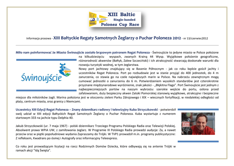 Informacja prasowa - XIII Bałtyckie Regaty Samotnych Żeglarzy o Puchar Poloneza 2012 - nr 13/czerwiec2012 Miło nam poinformować że Miasto Świnoujście zostało brązowym patronem Regat Poloneza - Świnoujście to jedyne miasto w Polsce położone na kilkudziesięciu wyspach, zwanych Krainą 44 Wysp. Wyjątkowe położenie geograficzne, różnorodność akwenów (Bałtyk, Zalew Szczeciński) i ich atrakcyjność stwarzają doskonałe warunki dla rozwoju turystyki wodnej, w tym żeglarstwa. Nowy port jachtowy znajdujący się w Basenie Północnym - jak co roku będzie gościł jachty i uczestników Regat Poloneza. Port po rozbudowie jest w stanie przyjąć do 400 jednostek, do 4 m zanurzenia, co stawia go na czele największych marin w Polsce. Na nabrzeżu zewnętrznym mogą cumować jednostki o zanurzeniu do 6 m. Potwierdzeniem wysokich standardów jest czterokrotnie przyznane międzynarodowe wyróżnienie, znak jakości - „Błękitna Flaga”. Port Świnoujście jest jednym z najbezpieczniejszych portów na naszym wybrzeżu: szerokie wejście do portu, osłona przed zafalowaniem, duży bezpieczny akwen Zatoki Pomorskiej stanowią wyjątkowe, atrakcyjne i bezpieczne miejsce dla miłośników żagli. Marina położona jest w otoczeniu zieleni Parku Zdrojowego i XIX – wiecznych fortyfikacji, w niedalekiej odległości od plaży, centrum miasta, oraz granicy z Niemcami. Uczestnicy XIII Edycji Regat Poloneza – Znany dziennikarz radiowy i telewizyjny Kuba Strzyczkowski - potwierdził swój udział w XIII edycji Bałtyckich Regat Samotnych Żeglarzy o Puchar Poloneza. Kuba wystartuje z numerem startowym 333 na jachcie typu Delphia 40. Jakub Strzyczkowski (ur. 7 maja 1967) - polski dziennikarz Trzeciego Programu Polskiego Radia oraz Telewizji Polskiej. Absolwent prawa WPiA UW, z zamiłowania żeglarz. W Programie III Polskiego Radia prowadzi audycje: Za, a nawet przeciw oraz w piątki popołudniowe wydania Zapraszamy do Trójki. W TVP1 prowadził m.in. programy publicystyczne: Z refleksem, Kwadrans po ósmej i Autografy oraz informacyjny Teleexpress. Co roku jest prowadzącym licytacji na rzecz Rodzinnych Domów Dziecka, które odbywają się na antenie Trójki w ramach akcji "Idą Święta". Wystąpił w filmach: Ekstradycja 2 (1996) w roli dziennikarza na konferencji prasowej Halskiego (odc. 9; nie wystąpił w czołówce) oraz Trzy szalone zera (1999) jako Pantisek. Nagrody i odznaczenia: W 2003 został odznaczony Srebrnym Krzyżem Zasługi. W 2008 otrzymał Złoty Mikrofon, a w 2011 Nagrodę im. Krzysztofa Dzierżawskiego. W 2008 otrzymał tytuł Mistrza Mowy Polskiej Vox Populi 32 uczestników dopełniło już wszystkich formalności związanych ze zgłoszeniem i jednocześnie potwierdziło swój udział. Jako ostatni potwierdzili udział: Wiesław Krupski na jachcie Fourwinds – warto wspomnieć, że Wiesław jest znanym żeglarzem regatowym, startował na swoim jachcie w wielu renomowanych regatach zagranicznych i oczywiście w wielu krajowych, potwierdził również swój udział Witold Czarnecki na jachcie Szybka. Zapraszamy kolejnych chętnych - szczegółowe info na stronie :) Zgłoszenia przyjmujemy do 01.07.2012 Po tej dacie będzie się można zgłaszać jedynie na listę rezerwową – uczestnicy z listy rezerwowej wejdą do wyścigu w wypadku rezygnacji jednego z uczestników który zgłosił się w podstawowym terminie czyli do 1 lipca2012 r Organizator: Jacht Full Service Krzysztof Krygier tel. 601 233 434, [email protected]