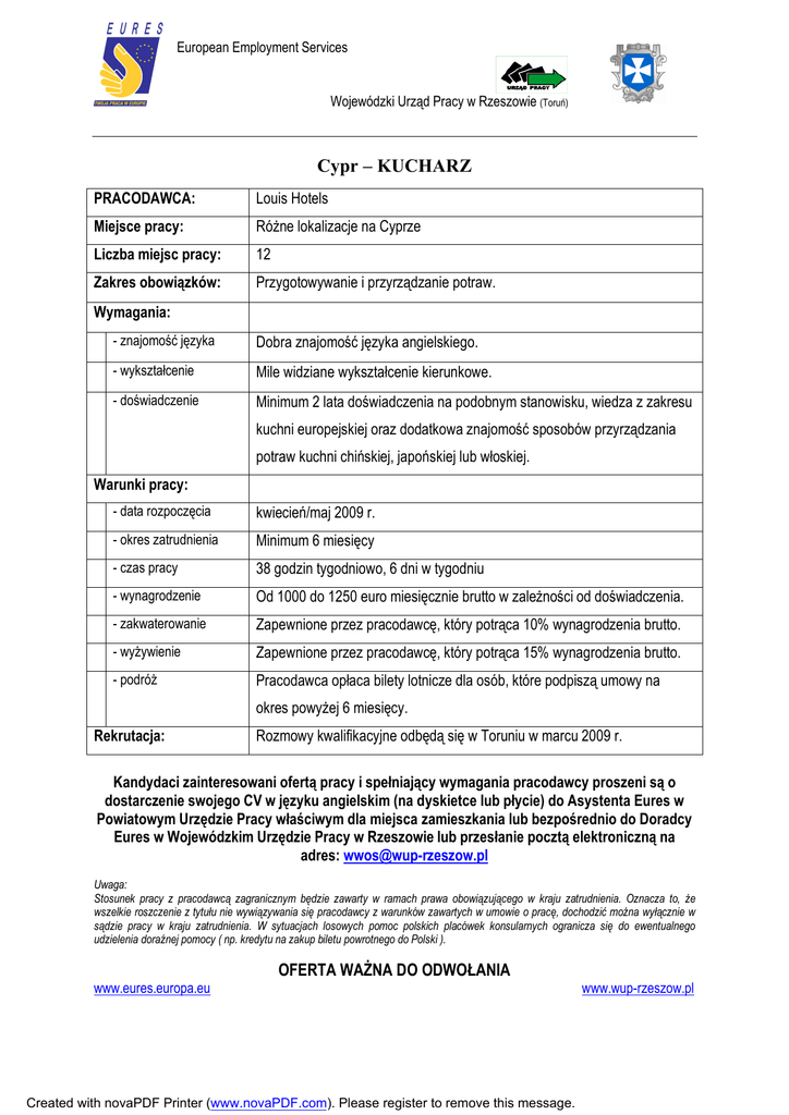 European Employment Services Wojewódzki Urząd Pracy w Rzeszowie (Toruń) Cypr – KUCHARZ PRACODAWCA: Louis Hotels Miejsce pracy: Różne lokalizacje na Cyprze Liczba miejsc pracy: 12 Zakres obowiązków: Przygotowywanie i przyrządzanie potraw. Wymagania: - znajomość języka Dobra znajomość języka angielskiego. - wykształcenie Mile widziane wykształcenie kierunkowe. - doświadczenie Minimum 2 lata doświadczenia na podobnym stanowisku, wiedza z zakresu kuchni europejskiej oraz dodatkowa znajomość sposobów przyrządzania potraw kuchni chińskiej, japońskiej lub włoskiej. Warunki pracy: - data rozpoczęcia kwiecień/maj 2009 r. - okres zatrudnienia Minimum 6 miesięcy - czas pracy 38 godzin tygodniowo, 6 dni w tygodniu - wynagrodzenie Od 1000 do 1250 euro miesięcznie brutto w zależności od doświadczenia. - zakwaterowanie Zapewnione przez pracodawcę, który potrąca 10% wynagrodzenia brutto. - wyżywienie Zapewnione przez pracodawcę, który potrąca 15% wynagrodzenia brutto. - podróż Pracodawca opłaca bilety lotnicze dla osób, które podpiszą umowy na okres powyżej 6 miesięcy. Rekrutacja: Rozmowy kwalifikacyjne odbędą się w Toruniu w marcu 2009 r. Kandydaci zainteresowani ofertą pracy i spełniający wymagania pracodawcy proszeni są o dostarczenie swojego CV w języku angielskim (na dyskietce lub płycie) do Asystenta Eures w Powiatowym Urzędzie Pracy właściwym dla miejsca zamieszkania lub bezpośrednio do Doradcy Eures w Wojewódzkim Urzędzie Pracy w Rzeszowie lub przesłanie pocztą elektroniczną na adres: [email protected] Uwaga: Stosunek pracy z pracodawcą zagranicznym będzie zawarty w ramach prawa obowiązującego w kraju zatrudnienia. Oznacza to, że wszelkie roszczenie z tytułu nie wywiązywania się pracodawcy z warunków zawartych w umowie o pracę, dochodzić można wyłącznie w sądzie pracy w kraju zatrudnienia. W sytuacjach losowych pomoc polskich placówek konsularnych ogranicza się do ewentualnego udzielenia doraźnej pomocy ( np. kredytu na zakup biletu powrotnego do Polski ). OFERTA WAŻNA DO ODWOŁANIA www.eures.europa.eu Created with novaPDF Printer (www.novaPDF.com). Please register to remove this message. www.wup-rzeszow.pl