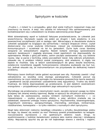 nadzieja.pl - Jacek Matter - Spirytyzm w kościele Spirytyzm w kościele „Trudno (...) mówić tu o przypadku, gdyż zbyt wiele trafnych rozpoznań mają owi znachorzy na koncie. A więc: kto udziela im informacji? Kto zainteresowany jest kontaktowaniem się z człowiekiem na drodze zabronionej przez Boga?” Wiek dziewiętnasty wpoił w ludzkość fałszywe przeświadczenie, że człowiek jest wszechmocny. Wynalazki sypały się jeden po drugim i było wiadomo, iż era powszechnej szczęśliwości jest w zasięgu ręki. Wkraczający w dwudzieste stulecie człowiek spoglądał na ścigające się samochody i rosnące drapacze chmur, czytał dostarczane mu coraz szybciej informacje, cieszył się mnóstwem artykułów konsumpcyjnych i oczekiwał na lot ku gwiazdom. Życie było coraz bardziej związane ze wskazówkami zegarka. Nawet kolejne wstrząsy spowodowane wojnami światowymi i zagładą atomową miast japońskich nie doprowadziły do opamiętania. Minęło z górą pół wieku, zanim zaczęto zastanawiać się, czy istotnie nauka, idąc w parze z techniką, zdoła uszczęśliwić świat. Gdy odkryto antybiotyki, zdawało się, iż problem infekcji został rozwiązany, dziś wiadomo, iż nigdy nie będzie to możliwe. Gdy w latach sześćdziesiątych do głosu doszła biochemia, ostateczne rozwikłanie zagadki funkcjonowania człowieka wydawało się być tuż, tuż. Jednak okazało się, że instrumentarium nie przystawało do delikatnej materii problemu. Późniejszy boom biofizyki także gdzieś wyczerpał swe siły. Pozostały zawód i chęć odnalezienia za wszelką cenę starego paradygmatu. Człowiek poczuł się osamotniony (w czym istotnie pomogła mu lansowana powszechnie teoria ewolucji) i gwałtownie zaczął poszukiwać uzasadnienia swej egzystencji. Trudno się dziwić frustracji, do której doprowadzało go przekonanie, iż jest dalekim siostrzeńcem orangutana — przypadkowym produktem jego seksualnych wyczynów. Wyrzekając się przekonania o nieomylności nauki, zaczęto zwracać uwagę na różne przejawy tak zwanej wiedzy tajemnej. Będąc w opozycji do oficjalnych autorytetów, była łatwa do zastosowania, owiana nimbem rozmaitych misteriów i — co najważniejsze — szybko przynosiła efekty, a więc wkrótce znalazła się na piedestale, starannie unikając miana spirytyzmu. Psychotronika, bioenergoterapia, magnetyzm zwierzęcy, parapsychologia, channeling, astrologia, reinkarnacja, różdżkarstwo, homeopatia — to tylko niektóre z rozmaitych ofert spirytyzmu. Skąd taka skłonność rzekomo światłego człowieka u schyłku dwudziestego wieku do tego, by dawać się wodzić za nos? Pierwszy powód przedstawiłem na wstępie: rozczarowanie wyniesione z nie spełnionych obietnic nauki. Drugi, to wyeliminowanie z ludzkiej świadomości szatana jako realnie obecnej i działającej istoty. Najczęściej spycha się go do roli bajkowego stwora z sierścią i rogami, strona 1 / 7 nadzieja.pl - Jacek Matter - Spirytyzm w kościele straszącego co większych gamoniów, za to ustępującego przed niebywałym intelektem przeciętnego Maćka. Co bardziej oświeconym podsuwa się ideę, w myśl której szatan jest tylko personifikacją własnych skłonności do zła, a więc elementem pozbawionym osobowości, kreowanym jedynie przez własny umysł. Obie wersje są na tyle niegroźne, że nie warto się nimi zajmować, a tym bardziej obawiać szatana. W ten sposób odwieczny wróg człowieka osiągnął znaczny sukces, udając, że tak naprawdę nie istnieje. Rzecz zdumiewająca: o ile społeczeństwa tak zwanej kultury zachodniej jako tako jeszcze wierzą w istnienie Boga, to wiara w obecność szatana staje się kuriozalna. Tym samym Bóg jawi się winnym powstania zła. Bo jeśli szatana nie ma, to skąd się ono wzięło? Upiekł więc diabeł dwie pieczenie na jednym ogniu: z jednej strony obarczył Boga odpowiedzialnością za powstanie i obecność zła, z drugiej — zapewnił sobie możliwość skuteczniejszego działania przez rozmaite formy spirytyzmu, bowiem człowiek przeświadczony o tym, że szatan nie istnieje jest równie pewny swych kontaktów z duchami zmarłych ludzi, jak swych własnych butów1. Trzecim elementem jest widowiskowość działań i mniejsza lub większa skuteczność stosowanych środków, zwłaszcza w zakresie terapii, i temu problemowi chciałbym poświęcić nieco uwagi. PRZEDMIOTY DZIAŁAJĄCE LECZNICZO Żal mi chrześcijan zakładających na ręce bransoletki z kolorowymi kamykami mającymi działać korzystnie na wątrobę, serce i tym podobne. Żal mi kupujących drewienka lecznicze (zamknięte w małych naczynkach wyglądają jak resztki z ogniska), piramidki i inne cudactwa. Wystarczy kilka przekonywająco wypowiedzianych słów, by rozbudzona nadzieja szeroką ręką otworzyła portfel. Nikt nie docieka prawdziwości zapewnień, nie domaga się przedstawienia publikacji instytutów naukowych, potwierdzających skuteczność środka. Gdyby jednak cała rzecz sprowadzała się li tylko do zwykłego oszustwa — można by jeszcze przymknąć oko, ale przecież w ślad za owymi tajemniczymi promieniowaniami, rzekomą koncentracją energii kosmicznej i innymi, szumnie brzmiącymi określeniami idą konsekwencje w postaci zaufania, jakim obdarowuje się daną metodę. A jeśli jeszcze zdarzy się, iż przejściowo lub trwale (czy to wskutek nadziei wyzwalającej pozytywne procesy w organizmie, czy też w wyniku naturalnego przebiegu schorzenia) uzyska się ustąpienie dolegliwości — wówczas metoda zostaje bezsprzecznie zaakceptowana, polecana innym, a w ślad za tym rośnie zainteresowanie podobnymi działaniami. Pojawia się lektura spirytystyczna, otwierająca szerzej furtkę do silniejszych oddziaływań szatana na człowieka. ROŚLINY DZIAŁAJĄCE LECZNICZO Nie zamierzam wrzucić ziołolecznictwa do worka praktyk spirytystycznych. Chciałbym jedynie ostrzec przed rozmaitymi szarlatanami stosującymi bezkrytycznie tę 