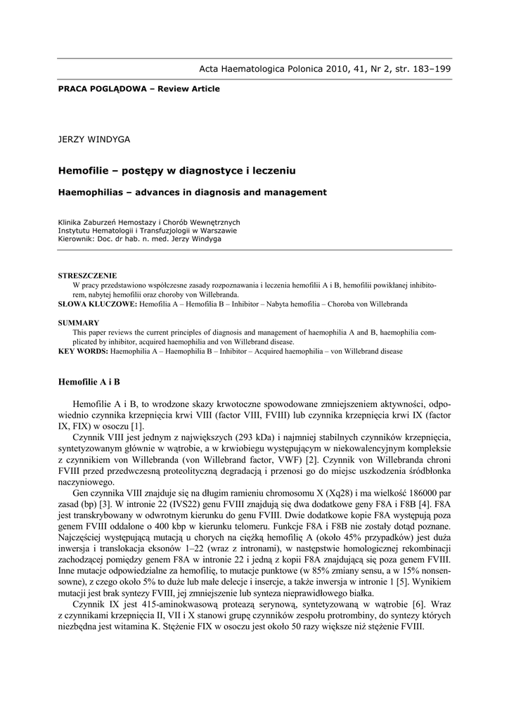 Acta Haematologica Polonica 2010, 41, Nr 2, str. 183–199 PRACA POGLĄDOWA – Review Article JERZY WINDYGA Hemofilie – postępy w diagnostyce i leczeniu Haemophilias – advances in diagnosis and management Klinika Zaburzeń Hemostazy i Chorób Wewnętrznych Instytutu Hematologii i Transfuzjologii w Warszawie Kierownik: Doc. dr hab. n. med. Jerzy Windyga STRESZCZENIE W pracy przedstawiono współczesne zasady rozpoznawania i leczenia hemofilii A i B, hemofilii powikłanej inhibitorem, nabytej hemofilii oraz choroby von Willebranda. SŁOWA KLUCZOWE: Hemofilia A – Hemofilia B – Inhibitor – Nabyta hemofilia – Choroba von Willebranda SUMMARY This paper reviews the current principles of diagnosis and management of haemophilia A and B, haemophilia complicated by inhibitor, acquired haemophilia and von Willebrand disease. KEY WORDS: Haemophilia A – Haemophilia B – Inhibitor – Acquired haemophilia – von Willebrand disease Hemofilie A i B Hemofilie A i B, to wrodzone skazy krwotoczne spowodowane zmniejszeniem aktywności, odpowiednio czynnika krzepnięcia krwi VIII (factor VIII, FVIII) lub czynnika krzepnięcia krwi IX (factor IX, FIX) w osoczu [1]. Czynnik VIII jest jednym z największych (293 kDa) i najmniej stabilnych czynników krzepnięcia, syntetyzowanym głównie w wątrobie, a w krwiobiegu występującym w niekowalencyjnym kompleksie z czynnikiem von Willebranda (von Willebrand factor, VWF) [2]. Czynnik von Willebranda chroni FVIII przed przedwczesną proteolityczną degradacją i przenosi go do miejsc uszkodzenia śródbłonka naczyniowego. Gen czynnika VIII znajduje się na długim ramieniu chromosomu X (Xq28) i ma wielkość 186000 par zasad (bp) [3]. W intronie 22 (IVS22) genu FVIII znajdują się dwa dodatkowe geny F8A i F8B [4]. F8A jest transkrybowany w odwrotnym kierunku do genu FVIII. Dwie dodatkowe kopie F8A występują poza genem FVIII oddalone o 400 kbp w kierunku telomeru. Funkcje F8A i F8B nie zostały dotąd poznane. Najczęściej występującą mutacją u chorych na cięŜką hemofilię A (około 45% przypadków) jest duŜa inwersja i translokacja eksonów 1–22 (wraz z intronami), w następstwie homologicznej rekombinacji zachodzącej pomiędzy genem F8A w intronie 22 i jedną z kopii F8A znajdującą się poza genem FVIII. Inne mutacje odpowiedzialne za hemofilię, to mutacje punktowe (w 85% zmiany sensu, a w 15% nonsensowne), z czego około 5% to duŜe lub małe delecje i insercje, a takŜe inwersja w intronie 1 [5]. Wynikiem mutacji jest brak syntezy FVIII, jej zmniejszenie lub synteza nieprawidłowego białka. Czynnik IX jest 415-aminokwasową proteazą serynową, syntetyzowaną w wątrobie [6]. Wraz z czynnikami krzepnięcia II, VII i X stanowi grupę czynników zespołu protrombiny, do syntezy których niezbędna jest witamina K. StęŜenie FIX w osoczu jest około 50 razy większe niŜ stęŜenie FVIII. J. WINDYGA 184 Gen czynnika IX znajduje się na długim ramieniu chromosomu X (Xq27), centromerycznie w stosunku do genu FVIII i ma wielkość 34000 bp [7]. Opisano ponad 2100 mutacji we wszystkich regionach genu FIX odpowiedzialnych za wystąpienie hemofilii B, z których najczęstsze, to mutacje punktowe, a w dalszej kolejności mutacje tzw. miejsc splicingowych, przesunięcia ramki odczytu oraz duŜe delecje/rearanŜacje. Podobnie jak w przypadku hemofilii A, wynikiem mutacji w genie FIX jest brak syntezy FIX, jej zmniejszenie lub synteza nieprawidłowego białka. Tak jak wszystkie cechy zaleŜne od genów sprzęŜonych z płcią, hemofilia A i B pojawia się głównie u męŜczyzn, zaś kobieta przekazująca cechę jest jej nosicielką. PoniewaŜ aktywność FVIII lub FIX w osoczu nosicielek wynosi zazwyczaj około 50% wartości prawidłowej i jest wystarczająca dla prawidłowego funkcjonowania wtórnej hemostazy, nosicielki rzadko wykazują skłonność do nadmiernych krwawień [8]. Skłonność taka moŜe jednak wystąpić u kobiet dotkniętych skrajną lyonizacją (nieprawidłową inaktywacją chromosomu X pochodzącego od jednego z rodziców), z zespołem Turnera (XO) oraz u córek urodzonych ze związku chorego na hemofilię z nosicielką hemofilii, gdyŜ w tych przypadkach aktywność niedoborowego czynnika krzepnięcia moŜe być bardzo mała, a nawet nieoznaczalna. Hemofilię A wykrywa się u 1 na 5 000, a hemofilię B – u 1 na 30 000 męskich noworodków. Częstość występowania hemofilii A i B w Polsce została oszacowana na 1:12 300 mieszkańców [9]. U około 30–50% chorych mutacja występuje spontanicznie, a wywiad rodzinny jest ujemny. Hemostaza pierwotna, czyli skurcz mięśniówki naczyniowej oraz adhezja, aktywacja i agregacja płytek krwi u chorych na hemofilię przebiegają prawidłowo. JednakŜe płytkowy czop hemostatyczny nie jest dostatecznie wzmocniony włóknikiem, gdyŜ w następstwie niedoboru czynników VIII lub IX nie jest wytwarzana dostateczna ilość trombiny przekształcającej fibrynogen w fibrynę. Skrzep o słabej strukturze ulega łatwo rozpadowi, co objawia się skłonnością do nadmiernych krwawień. Hemofilia A i B nie róŜnią się od siebie przebiegiem klinicznym, dlatego ich rozpoznanie opiera się na pomiarze aktywności niedoborowego czynnika krzepnięcia w osoczu [1]. Nasilenie krwawień zaleŜy od stopnia niedoboru FVIII lub FIX. WyróŜnia się 3 postacie kaŜdej z hemofilii: cięŜką, umiarkowaną i łagodną (Tabela 1). NajwaŜniejszym objawem cięŜkiej hemofilii są samoistne wylewy krwi do stawów. Zazwyczaj zaczynają się one pojawiać w 2–3 roku Ŝycia i najczęściej umiejscawiają się w stawach kolanowych, łokciowych i skokowo-goleniowych. Powtarzające się krwawienia do stawów są przyczyną ich postępującego zwyrodnienia. Krwawienia mogą takŜe umiejscawiać się w mięśniach, w dnie jamy ustnej i tylnej ścianie gardła oraz jamach ciała. Do najgroźniejszych objawów hemofilii naleŜą krwawienia śródczaszkowe i z przewodu pokarmowego. Dość częsty jest ta