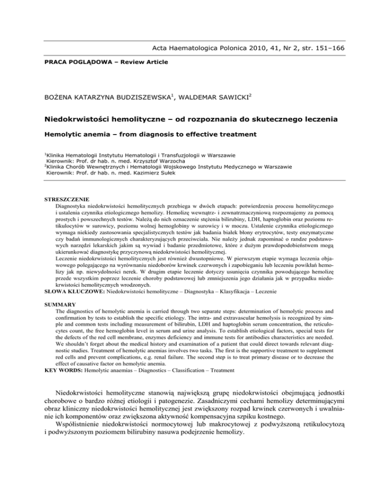 Acta Haematologica Polonica 2010, 41, Nr 2, str. 151–166 PRACA POGLĄDOWA – Review Article BOśENA KATARZYNA BUDZISZEWSKA1, WALDEMAR SAWICKI2 Niedokrwistości hemolityczne – od rozpoznania do skutecznego leczenia Hemolytic anemia – from diagnosis to effective treatment 1 Klinika Hematologii Instytutu Hematologii i Transfuzjologii w Warszawie Kierownik: Prof. dr hab. n. med. Krzysztof Warzocha 2 Klinika Chorób Wewnętrznych i Hematologii Wojskowego Instytutu Medycznego w Warszawie Kierownik: Prof. dr hab. n. med. Kazimierz Sułek STRESZCZENIE Diagnostyka niedokrwistości hemolitycznych przebiega w dwóch etapach: potwierdzenia procesu hemolitycznego i ustalenia czynnika etiologicznego hemolizy. Hemolizę wewnątrz- i zewnatrznaczyniową rozpoznajemy za pomocą prostych i powszechnych testów. NaleŜą do nich oznaczenie stęŜenia bilirubiny, LDH, haptoglobin oraz poziomu retikulocytów w surowicy, poziomu wolnej hemoglobiny w surowicy i w moczu. Ustalenie czynnika etiologicznego wymaga niekiedy zastosowania specjalistycznych testów jak badania białek błony erytrocytów, testy enzymatyczne czy badań immunologicznych charakteryzujących przeciwciała. Nie naleŜy jednak zapominać o randze podstawowych narzędzi lekarskich jakim są wywiad i badanie przedmiotowe, które z duŜym prawdopodobieństwem mogą ukierunkować diagnostykę przyczynową niedokrwistości hemolitycznej. Leczenie niedokrwistości hemolitycznych jest równieŜ dwustopniowe. W pierwszym etapie wymaga leczenia objawowego polegającego na wyrównaniu niedoborów krwinek czerwonych i zapobieganiu lub leczeniu powikłań hemolizy jak np. niewydolności nerek. W drugim etapie leczenie dotyczy usunięcia czynnika powodującego hemolizę przede wszystkim poprzez leczenie choroby podstawowej lub zmniejszenia jego działania jak w przypadku niedokrwistości hemolitycznych wrodzonych. SŁOWA KLUCZOWE: Niedokrwistości hemolityczne – Diagnostyka – Klasyfikacja – Leczenie SUMMARY The diagnostics of hemolytic anemia is carried through two separate steps: determination of hemolytic process and confirmation by tests to establish the specific etiology. The intra- and extravascular hemolysis is recognized by simple and common tests including measurement of bilirubin, LDH and haptoglobin serum concentration, the reticulocytes count, the free hemoglobin level in serum and urine analysis. To establish etiological factors, special tests for the defects of the red cell membrane, enzymes deficiency and immune tests for antibodies characteristics are needed. We shouldn’t forget about the medical history and examination of a patient that could direct towards relevant diagnostic studies. Treatment of hemolytic anemias involves two tasks. The first is the supportive treatment to supplement red cells and prevent complications, e.g. renal failure. The second step is to treat primary disease or to decrease the effect of causative factor on hemolytic anemia. KEY WORDS: Hemolytic anaemias – Diagnostics – Classification – Treatment Niedokrwistości hemolityczne stanowią największą grupę niedokrwistości obejmującą jednostki chorobowe o bardzo róŜnej etiologii i patogenezie. Zasadniczymi cechami hemolizy determinującymi obraz kliniczny niedokrwistości hemolitycznej jest zwiększony rozpad krwinek czerwonych i uwalnianie ich komponentów oraz zwiększona aktywność kompensacyjna szpiku kostnego. Współistnienie niedokrwistości normocytowej lub makrocytowej z podwyŜszoną retikulocytozą i podwyŜszonym poziomem bilirubiny nasuwa podejrzenie hemolizy. 152 B.K. BUDZISZEWSKA, W. SAWICKI Wstępna ocena chorego powinna obejmować 4 zasadnicze punkty 1.Wywiad i badanie kliniczne ukierunkowane na potencjalne przyczyny niedokrwistości hemolitycznej. W wywiadzie naleŜy zwrócić uwagę na występowanie długotrwających lub nawracających niedokrwistości, Ŝółtaczki lub splenektomii u członków rodziny w celu wykluczenia wrodzonego charakteru schorzenia. Początek niedokrwistości moŜe być nagły z gorączką, wymiotami, bólami krzyŜa, nóg lub brzucha, zmianą koloru moczu zwłaszcza po nocnym spaniu, po ekspozycji na zimno czy długotrwałym wysiłku fizycznym (marszu). Szczegółowo naleŜy zebrać wywiad pod kątem przyjmowanych leków, przebytych infekcji i ekspozycji na czynniki chemiczne jak równieŜ mechaniczne np. protezy naczyniowe. NaleŜy zwrócić uwagę na objawy mogące sugerować choroby wątroby, tkanki łącznej zwłaszcza SLE jak równieŜ chłoniaki, przewlekłą białaczkę limfocytową lub inne nowotwory. Objawami przewlekłej hemolizy mogą być: niewielkiego stopnia Ŝółtaczka, splenomegalia (masywna tylko w β-talasemii), kamica dróg i/lub pęcherzyka Ŝółciowego, owrzodzenia podudzi, objawy niedoboru kwasu foliowego. 2. Rozmaz krwi obwodowej zwłaszcza rozmaz krwinek czerwonych jest niedocenianym choć bardzo wartościowym badaniem. MoŜe być źródłem cennych informacji zwłaszcza w niedokrwistościach z defektami błony komórkowej erytrocytów. Występowanie sferocytów lub owalocytów moŜe ukierunkować dalszą diagnostykę. Obecność ziarnistości zasadochłonnych w krwinkach czerwonych jest spotykana głównie w β-talasemii. Hipochromiczne krwinki związane z hemolizą występują w talasemiach, hemoglobinopatiach i przewlekłych stanach hemolitycznych z utratą Ŝelaza. Krwinki tarczowate są obecne w talasemiach, w chorobach wątroby i po splenektomii, krwinki.sierpowate w niedokrwistości sierpowatokrwinkowej. Największe znaczenie ma badanie rozmazu krwi obwodowej w niedokrwistościach tzw mechanicznych zwłaszcza mikroangiopatycznych, w których stwierdzenie fragmentów krwinek czerwonych (schistiocytów) jest jednym z waŜniejszych kryteriów diagnostycznych [1]. Rozmaz krwi obwodowej pozwala teŜ szybko potwierdzić przewlekłą białaczkę limfocytową lub mononukleozę jako przyczynę niedokrwistości hemolitycznej. 3. Wskaźniki hemolizy wewnątrznaczyniowej (w