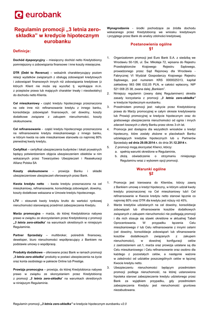 Regulamin promocji „3 letnia zeroskładka” w kredycie hipotecznym eurobanku Wynagrodzenie - środki pochodzące ze źródła dochodu wskazanego przez Kredytobiorcę we wniosku kredytowym i przyjętego przez Bank do analizy zdolności kredytowej. Postanowienia ogólne §1 Definicje: Dochód dyspozycyjny – miesięczny dochód netto Kredytobiorcy pomniejszony o zobowiązania finansowe i inne koszty miesięczne. DTR (Debt to Revenue) – wskaźnik charakteryzujący poziom relacji wydatków związanych z obsługą zobowiązań kredytowych i zobowiązań finansowych innych niż zobowiązania kredytowe (z których Klient nie może się wycofać tj. wynikające m.in. z przepisów prawa lub mających charakter trwały i nieodwołalny) do dochodu netto Klienta. Cel mieszkaniowy - część kredytu hipotecznego przeznaczona na cele inne niż: refinansowanie kredytu z innego banku, konsolidacja zobowiązań finansowych, cel dowolny, koszty dodatkowe związane z zakupem nieruchomości, koszty okołoumowne. Cel refinansowanie - część kredytu hipotecznego przeznaczona na refinansowanie kredytu mieszkaniowego z innego banku, w którym kwota na cele mieszkaniowe stanowiła co najmniej 80% pierwotnej kwoty kredytu. Certyfikat – certyfikat ubezpieczenia budynków i lokali prywatnych będący potwierdzeniem objęcia ubezpieczeniem obiektów w nim wskazanych przez Towarzystwo Ubezpieczeń i Reasekuracji Allianz Polska SA Koszty okołoumowne prowizja Banku i ubezpieczeniowe ubezpieczeń oferowanych przez Bank. 1. 2. 3. 4. 5. Organizatorem promocji jest Euro Bank S.A. z siedzibą we Wrocławiu 50-126, ul. Św. Mikołaja 72, wpisana do Rejestru Przedsiębiorców Krajowego Rejestru Sądowego, prowadzonego przez Sąd Rejonowy dla Wrocławia Fabrycznej VI Wydział Gospodarczy Krajowego Rejestru Sądowego, pod numerem KRS 0000025313, kapitał zakładowy 563 096 032,05 PLN, w całości wpłacony, NIP 521 008 25 38, zwana dalej „Bankiem”. Niniejszy regulamin (zwany dalej Regulaminem) określa zasady korzystania z promocji „3 letnia zero-składka” w kredycie hipotecznym eurobanku. Przedmiotem promocji jest: nabycie przez Kredytobiorcę prawa do Marży promocyjnej w całym okresie kredytowania lub Prowizji promocyjnej w kredycie hipotecznym oraz do gratisowego ubezpieczenia nieruchomości od ognia i innych zdarzeń losowych z oferty Banku przez okres 3-ch lat. Promocja jest dostępna dla wszystkich wniosków o kredyt hipoteczny, które zostały złożone w placówkach Banku udzielających kredytów hipotecznych lub u Partnerów Sprzedaży od dnia 29.09.2014 r. do dnia 31.12.2014 r. Z promocji mogą skorzystać Klienci, którzy: a. spełnią warunki określone w Regulaminie, b. złożą oświadczenie o otrzymaniu niniejszego Regulaminu wraz z wyborem opcji promocji. Warunki ogólne §2 składki Kwota kredytu netto - kwota kredytu przeznaczona na cel mieszkaniowy, refinansowanie, konsolidację zobowiązań, dowolny, koszty dodatkowe wskazana w Umowie kredytu hipotecznego. LTV – stosunek kwoty kredytu brutto do wartości rynkowej nieruchomości stanowiącej przedmiot zabezpieczenia Kredytu. 1. 2. Marża promocyjna – marża, do której Kredytobiorca nabywa prawo w związku ze skorzystaniem przez Kredytobiorcę z promocji „3 letnia zero-składka” na warunkach określonych w niniejszym Regulaminie. Partner Sprzedaży – multibroker, pośrednik finansowy, deweloper, biuro nieruchomości współpracujący z Bankiem na podstawie umowy o współpracę. Produkty dodatkowe – oferowane przez Bank w ramach promocji „3 letnia zero-składka” produkty w postaci ubezpieczenia na życie oraz konta osobistego w pakiecie Online lub Prestige. Prowizja promocyjna – prowizja, do której Kredytobiorca nabywa prawo w związku ze skorzystaniem przez Kredytobiorcę z promocji „3 letnia zero-składka” na warunkach określonych w niniejszym Regulaminie. 3. Promocja jest kierowana do Klientów, którzy zawrą z Bankiem umowę o kredyt hipoteczny, w którym udział kwoty kredytu przeznaczonej na Cel mieszkaniowy lub/i Cel refinansowanie w Kwocie kredytu netto stanowi łącznie co najmniej 80% oraz DTR dla kredytu jest niższy niż 45%. Marże kredytów udzielanych na cel dowolny, konsolidacje zobowiązań lub sfinansowanie kosztów dodatkowych związanych z zakupem nieruchomości nie podlegają promocji i dla nich stosuje się stawki określone w aktualnej Tabeli Oprocentowania. W przypadku łączenia Celu mieszkaniowego i/ lub Celu refinansowanie z innymi celami (cel dowolny, konsolidacje zobowiązań lub sfinansowanie kosztów dodatkowych związanych z zakupem nieruchomości), w dowolnej konfiguracji celów z zastrzeżeniem ust.1, marża oraz prowizja ustalane są dla Celu mieszkaniowego i Celu refinansowanie oraz osobno dla każdego z pozostałych celów, a następnie ważone w zależności od udziałów poszczególnych celów w łącznej Kwocie kredytu netto. Ubezpieczeniu nieruchomości będącym przedmiotem promocji podlega nieruchomość, na której ustanowiona hipoteka stanowi zabezpieczenie kredytu udzielonego przez Bank za wyjątkiem przypadku, gdy przedmiotem zabezpieczenia Kredytu jest nieruchomość gruntowa niezabudowana. Regulamin promocji „3 letnia zero-składka” w kredycie hipotecznym eurobanku v2.0 4. 5. 6. 7. 8. 9. Ubezpieczeniem podlegającym promocji jest znajdujące się w ofercie Banku grupowe ubezpieczenie od ognia i innych zdarzeń losowych w Towarzystwie Ubezpieczeń i Reasekuracji Allianz Polska SA, którego warunki ubezpieczenia są załącznikiem do niniejszego Regulaminu. Ubezpieczeniem mogą być objęte nieruchomości określone w warunkach ubezpieczenia. Okres 3-ch lat ubezpieczenia gratis wyznaczany jest w następujący sposób: • dla nieruchomości z rynku wtórnego stanowiących przedmiot zabezpieczenia wierzytelności Banku – rozpoczyna się od dnia uruchomienia kredytu lub jego pierwszej transzy • dla nieruchomości z rynku pierwotnego stanowiących przedmiot zabez