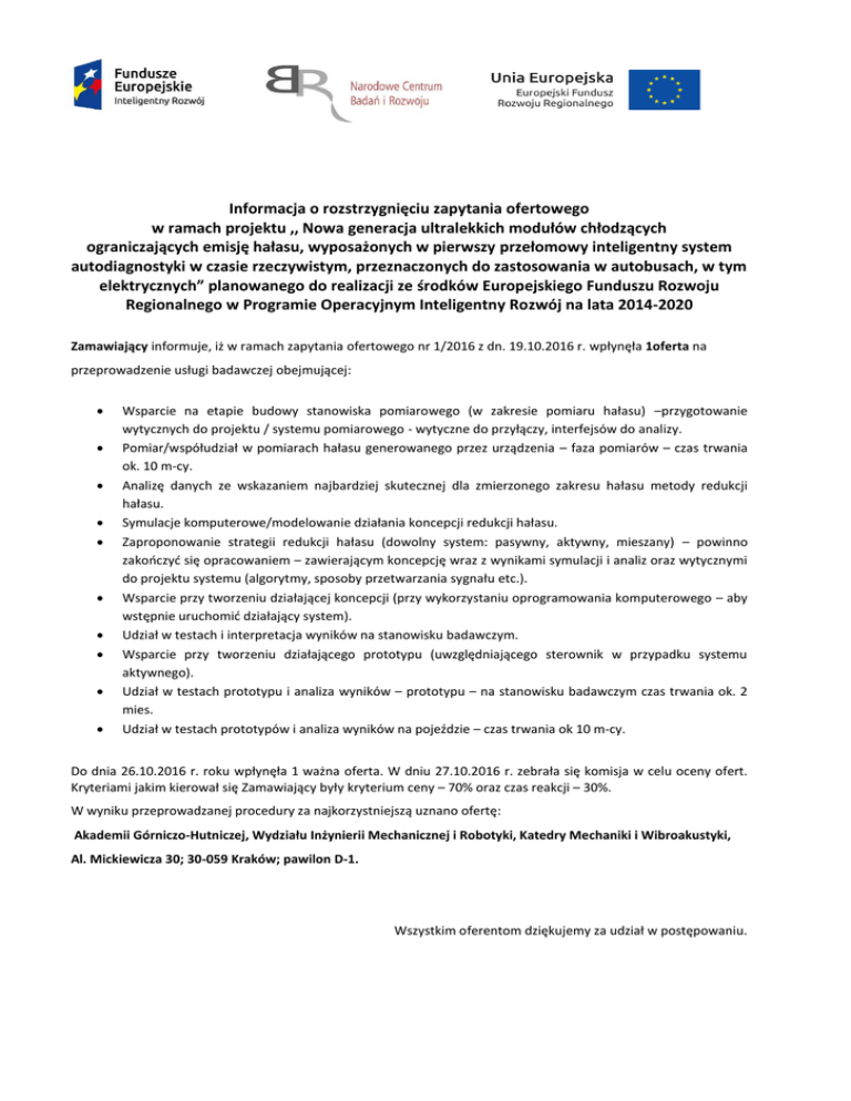 Informacja o rozstrzygnięciu zapytania ofertowego w ramach projektu ,, Nowa generacja ultralekkich modułów chłodzących ograniczających emisję hałasu, wyposażonych w pierwszy przełomowy inteligentny system autodiagnostyki w czasie rzeczywistym, przeznaczonych do zastosowania w autobusach, w tym elektrycznych” planowanego do realizacji ze środków Europejskiego Funduszu Rozwoju Regionalnego w Programie Operacyjnym Inteligentny Rozwój na lata 2014-2020 Zamawiający informuje, iż w ramach zapytania ofertowego nr 1/2016 z dn. 19.10.2016 r. wpłynęła 1oferta na przeprowadzenie usługi badawczej obejmującej: Wsparcie na etapie budowy stanowiska pomiarowego (w zakresie pomiaru hałasu) –przygotowanie wytycznych do projektu / systemu pomiarowego - wytyczne do przyłączy, interfejsów do analizy. Pomiar/współudział w pomiarach hałasu generowanego przez urządzenia – faza pomiarów – czas trwania ok. 10 m-cy. Analizę danych ze wskazaniem najbardziej skutecznej dla zmierzonego zakresu hałasu metody redukcji hałasu. Symulacje komputerowe/modelowanie działania koncepcji redukcji hałasu. Zaproponowanie strategii redukcji hałasu (dowolny system: pasywny, aktywny, mieszany) – powinno zakończyć się opracowaniem – zawierającym koncepcję wraz z wynikami symulacji i analiz oraz wytycznymi do projektu systemu (algorytmy, sposoby przetwarzania sygnału etc.). Wsparcie przy tworzeniu działającej koncepcji (przy wykorzystaniu oprogramowania komputerowego – aby wstępnie uruchomić działający system). Udział w testach i interpretacja wyników na stanowisku badawczym. Wsparcie przy tworzeniu działającego prototypu (uwzględniającego sterownik w przypadku systemu aktywnego). Udział w testach prototypu i analiza wyników – prototypu – na stanowisku badawczym czas trwania ok. 2 mies. Udział w testach prototypów i analiza wyników na pojeździe – czas trwania ok 10 m-cy. Do dnia 26.10.2016 r. roku wpłynęła 1 ważna oferta. W dniu 27.10.2016 r. zebrała się komisja w celu oceny ofert. Kryteriami jakim kierował się Zamawiający były kryterium ceny – 70% oraz czas reakcji – 30%. W wyniku przeprowadzanej procedury za najkorzystniejszą uznano ofertę: Akademii Górniczo-Hutniczej, Wydziału Inżynierii Mechanicznej i Robotyki, Katedry Mechaniki i Wibroakustyki, Al. Mickiewicza 30; 30-059 Kraków; pawilon D-1. Wszystkim oferentom dziękujemy za udział w postępowaniu.