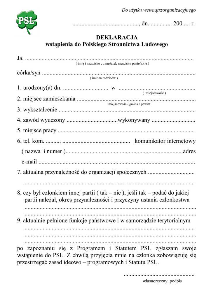 Do użytku wewnątrzorganizacyjnego ............................................, dn. .............. 200..... r. DEKLARACJA wstąpienia do Polskiego Stronnictwa Ludowego Ja, ................................................................................................................ ( imię i nazwisko , u mężatek nazwisko panieńskie ) córka/syn ...................................................................................................... ( imiona rodziców ) 1. urodzony(a) dn. .............................. w ................................................... ( miejscowość ) 2. miejsce zamieszkania ............................................................................... miejscowość / gmina / powiat 3. wykształcenie ........................................................................................... 4. zawód wyuczony ..................................wykonywany ............................. 5. miejsce pracy ........................................................................................... 6. tel. kom. .......... ............................................. komunikator internetowy ( nazwa i numer )............................................................................. adres e-mail ........................................................................................................ 7. aktualna przynależność do organizacji społecznych ............................... .................................................................................................................. 8. czy był członkiem innej partii ( tak – nie ), jeśli tak – podać do jakiej partii należał, okres przynależności i przyczyny ustania członkostwa .................................................................................................................. .................................................................................................................. 9. aktualnie pełnione funkcje państwowe i w samorządzie terytorialnym .................................................................................................................. ................................................................................................................... ................................................................................................................... po zapoznaniu się z Programem i Statutem PSL zgłaszam swoje wstąpienie do PSL. Z chwilą przyjęcia mnie na członka zobowiązuję się przestrzegać zasad ideowo – programowych i Statutu PSL. ............................................... własnoręczny podpis Pozytywnie opiniujemy ww. kandydata na członka PSL : 1. ........................................................... ( imię i nazwisko ) ................................................... ( własnoręczny podpis ) adres ........................................................................................................... 2. ........................................................... ( imię i nazwisko ) .................................................. ( własnoręczny podpis ) adres .......................................................................................................... Uchwałą z dn. ........................ 200 ...... r. koła / zarządu gminnego / zarządu powiatowego PSL * w ................................................ ...................................................................................................................... miejscowość / gmina /powiat / województwo Pan(i) ............................................................................................................ został(a) przyjęty(a) na członka Polskiego Stronnictwa Ludowego. Sekretarz ...................................... Prezes ...................................... Uchwała koła została zarejestrowana przez ZG PSL w ............................ .......................................................... w dniu ................................ 200 .... r. ( gmina ) Sekretarz ZG PSL ( pieczęć ) ................................ Numer wydanej legitymacji członkowskiej PSL ---------------------------* niewłaściwe skreślić