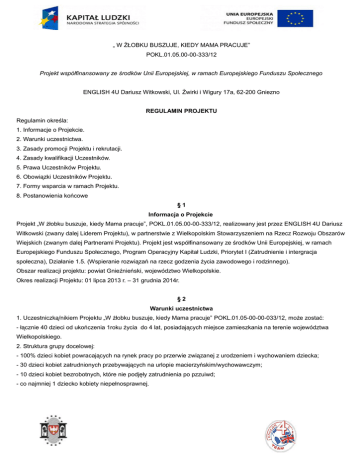 „ W ŻŁOBKU BUSZUJE, KIEDY MAMA PRACUJE” POKL.01.05.00-00-333/12 Projekt współfinansowany ze środków Unii Europejskiej, w ramach Europejskiego Funduszu Społecznego ENGLISH 4U Dariusz Witkowski, Ul. Żwirki i Wigury 17a, 62-200 Gniezno REGULAMIN PROJEKTU Regulamin określa: 1. Informacje o Projekcie. 2. Warunki uczestnictwa. 3. Zasady promocji Projektu i rekrutacji. 4. Zasady kwalifikacji Uczestników. 5. Prawa Uczestników Projektu. 6. Obowiązki Uczestników Projektu. 7. Formy wsparcia w ramach Projektu. 8. Postanowienia końcowe §1 Informacja o Projekcie Projekt „W żłobku buszuje, kiedy Mama pracuje”, POKL.01.05.00-00-333/12, realizowany jest przez ENGLISH 4U Dariusz Witkowski (zwany dalej Liderem Projektu), w partnerstwie z Wielkopolskim Stowarzyszeniem na Rzecz Rozwoju Obszarów Wiejskich (zwanym dalej Partnerami Projektu). Projekt jest współfinansowany ze środków Unii Europejskiej, w ramach Europejskiego Funduszu Społecznego, Program Operacyjny Kapitał Ludzki, Priorytet I (Zatrudnienie i intergracja społeczna), Działanie 1.5. (Wspieranie rozwiązań na rzecz godzenia życia zawodowego i rodzinnego). Obszar realizacji projektu: powiat Gnieźnieński, województwo Wielkopolskie. Okres realizacji Projektu: 01 lipca 2013 r. – 31 grudnia 2014r. §2 Warunki uczestnictwa 1. Uczestniczką/nikiem Projektu „W żłobku buszuje, kiedy Mama pracuje” POKL.01.05-00-00-033/12, może zostać: - łącznie 40 dzieci od ukończenia 1roku życia do 4 lat, posiadających miejsce zamieszkania na terenie województwa Wielkopolskiego. 2. Struktura grupy docelowej: - 100% dzieci kobiet powracających na rynek pracy po przerwie związanej z urodzeniem i wychowaniem dziecka; - 30 dzieci kobiet zatrudnionych przebywających na urlopie macierzyńskim/wychowawczym; - 10 dzieci kobiet bezrobotnych, które nie podjęły zatrudnienia po pzzuiwd; - co najmniej 1 dziecko kobiety niepełnosprawnej. „ W ŻŁOBKU BUSZUJE, KIEDY MAMA PRACUJE” POKL.01.05.00-00-333/12 Projekt współfinansowany ze środków Unii Europejskiej, w ramach Europejskiego Funduszu Społecznego Warunkiem uczestnictwa w Projekcie „ W żłobku buszuje, kiedy mama pracuje”, POKL.01.05.00-00-333/12, po spełnieniu warunków określonych w § 2 pkt 1 i 2 niniejszego Regulaminu, jest wypełnienie formularza zgłoszeniowego i przesłanie pocztą e-mail, tradycyjną lub złożenie w biurze Projektu, w siedzibie ENGLISH 4U, Ul. Żwirki i Wigury 17a, 62-200 Gniezno.Formularz winien być kompletnie wypełniony, w sposób czytelny i zgodny ze stanem faktycznym. Formularz zgłoszeniowy dostępny jest na stronie internetowej www.prymusgniezno.pl/zlobek, oraz w biurze Projektu. Można go też otrzymać drogą pocztową. §3 Zasady promocji Projektu i rekrutacji Uczestników Sposoby promocji Projektu: - ogłoszenia prasowe, - strona internetowa Projektu www.prymusgniezno.pl/zlobek - ogłoszenia radiowe - reklama w lokalnej TV - marketing bezpośredni (spotkania z rodzicami dzieci 1-4lat). Zgłoszenia na listę podstawową będą przyjmowane do momentu uzyskania wymaganej liczby Uczestników, spełniających kryteria grupy docelowej (§ 2, pkt 1 i 2). Zgłoszenia, które wpłyną po uzyskaniu określonej liczby Uczestników, będą rejestrowane na liście rezerwowej. Przebieg rekrutacji: Rekrutacja prowadzona będzie zgodnie z zasadą bezstronności, jawności, przejrzystości, równości szans. Poprzedzona akcją informacyjno-promocyjną: obejmująca ogłoszenia w lokalnych gazetach, radio, TV, ogłoszenia na stronie projektu oraz min. 2 spotkania informacyjne z rodzicami w biurze projektów w Gnieźnie dla osób deklarujących chęć zapisania dziecka do żłobka. Wszystkie materiały rozprowadzone na terenie powiatu gnieźnieńskiego. Rekrutacja: VII-VIII 2013 I etap 01.07.2013 – 07.07.2013 II etap 08.07.2013 – 25.08.2013 II etap 26.08.2013 – 28.08.2013 Rekrutacja uzupełniająca po zwolnieniu części miejsc opieki po roku VII-VIII 2014. Odpowiedzialność za rekrutację i promocję: asystent koordynatora Lista uczestników umieszczona w biurze projektu. W procesie rekrutacji wyłonionych zostanie 40 dzieci spełniających kryteria grupy docelowej. Przystąpienie do procesu rekrutacji, jest równoznaczne z zaakceptowaniem niniejszego Regulaminu. W ŻŁOBKU BUSZUJE, KIEDY MAMA PRACUJE” POKL.09.01.01-30-033/12 Projekt współfinansowany ze środków Unii Europejskiej, w ramach Europejskiego Funduszu Społecznego §4 Zasady kwalifikacji Uczestników Etapy: 1. Nabór zgłoszeń-wypełnione czytelnie i podpisane Formularze Zgłoszeniowe można złożyć za pomocą poczty, e-mailem, kurierem lub osobiście w biurze projektu. 2. Ocena Formularzy Zgłoszeniowych-dokonana na bieżąco przez asystenta koordynatora. Weryfikowana przynależność do grupy docelowej, kompletność wniosku, spełnienie wszystkich kryterów uczestnictwa. Dokumenty rekrutacyjne niekompletne, niezłożone w wyznaczonym terminie lub zawierające uchubienia formalne-odrzucone. O zakwalifikowaniu do projektu będzie decydować kolejno (po spełnieniu wszystkich kreteriów uczestnictwa): 1. Liczba dodatkowych punktów 2. Kolejność zgłoszeń §5 Prawa Uczestników Projektu Każda/ y Uczestniczka/nik Projektu ma prawo do: I) Udziału w edukacji żłobkowej w Żłobku Prymus w godzinach 06.00 –18.00, realizowanej zgodnie z Ustawą o opiece nad dziećmi w wiek do lat 3 z dnia 4 lutego 2011 r. (Dz.U. Nr 45, poz.235) - zajęciaogólnorozwojowe: plastyka, muzyka, zajęcia manualne, gry ruchowe, przebywanie na świeżym powietrzu, czytanie bajek, leżakowanie wg potrzeb, zabawy indywidualne, a także dodatkowo glottodydaktyka. Poza realizacją podstawy programowej (codzienny plan będzie realizowany według metod: M. Montessori i W. Sherborne), dla każdej grupy będę prowadzone: Zajęcia ze specjalistami: - gimnastyka korekcyjna - zajęcia taneczno-baletowe - rytmika - logopedia - rehabilitacja - język angielski II) Otrzymania w ramach edukacji przedsz