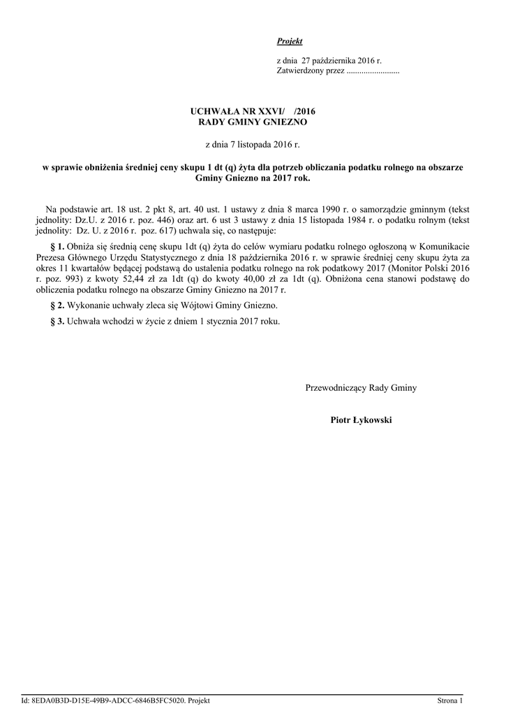 Projekt z dnia 27 października 2016 r. Zatwierdzony przez ......................... UCHWAŁA NR XXVI/ /2016 RADY GMINY GNIEZNO z dnia 7 listopada 2016 r. w sprawie obniżenia średniej ceny skupu 1 dt (q) żyta dla potrzeb obliczania podatku rolnego na obszarze Gminy Gniezno na 2017 rok. Na podstawie art. 18 ust. 2 pkt 8, art. 40 ust. 1 ustawy z dnia 8 marca 1990 r. o samorządzie gminnym (tekst jednolity: Dz.U. z 2016 r. poz. 446) oraz art. 6 ust 3 ustawy z dnia 15 listopada 1984 r. o podatku rolnym (tekst jednolity: Dz. U. z 2016 r. poz. 617) uchwala się, co następuje: § 1. Obniża się średnią cenę skupu 1dt (q) żyta do celów wymiaru podatku rolnego ogłoszoną w Komunikacie Prezesa Głównego Urzędu Statystycznego z dnia 18 października 2016 r. w sprawie średniej ceny skupu żyta za okres 11 kwartałów będącej podstawą do ustalenia podatku rolnego na rok podatkowy 2017 (Monitor Polski 2016 r. poz. 993) z kwoty 52,44 zł za 1dt (q) do kwoty 40,00 zł za 1dt (q). Obniżona cena stanowi podstawę do obliczenia podatku rolnego na obszarze Gminy Gniezno na 2017 r. § 2. Wykonanie uchwały zleca się Wójtowi Gminy Gniezno. § 3. Uchwała wchodzi w życie z dniem 1 stycznia 2017 roku. Przewodniczący Rady Gminy Piotr Łykowski Id: 8EDA0B3D-D15E-49B9-ADCC-6846B5FC5020. Projekt Strona 1 UZASADNIENIE Podatek rolny zgodnie z art. 6 ust. 1 ustawy z dnia 15 listopada 1984 roku o podatku rolnym (tekst jednolity: Dz. U. z 2016 r. poz. 617) wynosi równowartość pieniężną: - 2,5 q żyta od 1 ha przeliczeniowego dla gruntów gospodarstw rolnych, - 5 q żyta od 1 ha fizycznego dla gruntów nie wchodzących w skład gospodarstw rolnych, obliczoną wg średniej ceny skupu żyta za 11 kwartałów poprzedzających kwartał poprzedzający rok podatkowy. Średnia cena skupu żyta ogłoszona przez Prezesa Głównego Urzędu Statystycznego wynosząca 52,44 zł za 1 dt (q) (M.P. z 2016 r., poz. 993) jest podstawą do ustalenia podatku rolnego na 2017 r.. Rada Gminy Gniezno korzystając z delegacji zawartej w art. 6 ust. 3 ustawy z dnia 15 listopada 1984 roku o podatku rolnym postanowiła obniżyć średnią cenę skupu żyta przyjętą jako podstawę obliczenia podatku rolnego na 2017 r. na terenie Gminy Gniezno z kwoty 52,44 zł do kwoty 40,00zł za 1dt (q) żyta. Powyższe jest konsekwencją z jednej strony potrzeb budżetu Gminy, a z drugiej uwzględnienia złej sytuacji ekonomiczno - finansowej rolnictwa w skali makro jak i mikro. W powyższym stanie rzeczy podjęcie niniejszej uchwały jest w pełni uzasadnione. Id: 8EDA0B3D-D15E-49B9-ADCC-6846B5FC5020. Projekt Strona 1