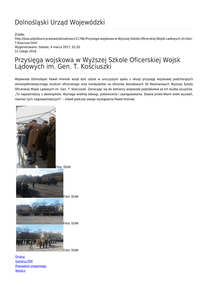 Dolnośląski Urząd Wojewódzki Źródło: http://duw.pl/pl/biuro-prasowe/aktualnosci/11766,Przysiega-wojskowa-w-Wyzszej-Szkole-Oficerskiej-Wojsk-Ladowych-im-GenT-Kosciusz.html Wygenerowano: Sobota, 4 marca 2017, 01:20 12 lutego 2016 Przysięga wojskowa w Wyższej Szkole Oficerskiej Wojsk Lądowych im. Gen. T. Kościuszki Wojewoda Dolnośląski Paweł Hreniak wziął dziś udział w uroczystym apelu z okazji przysięgi wojskowej podchorążych ośmioipółmiesięcznego studium oficerskiego oraz kandydatów na oficerów Narodowych Sił Rezerwowych Wyższej Szkoły Oficerskiej Wojsk Lądowych im. Gen. T. Kościuszki. Zwracając się do żołnierzy wojewoda podziękował za ich służbę ojczyźnie. „To najważniejszy z obowiązków. Wymaga wielkiej odwagi, poświecenia i zaangażowania. Stawia przed Wami wiele wyzwań, również tych najpoważniejszych” – mówił podczas swego wystąpienia Paweł Hreniak. Foto: DUW Foto: DUW Foto: DUW Foto: DUW Drukuj Generuj PDF Powiadom znajomego Wstecz liczba wejść: 789