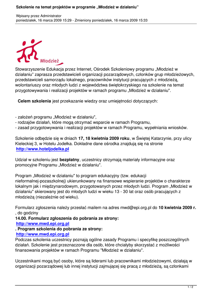 Szkolenie na temat projektów w programie „Młodzież w działaniu” Wpisany przez Administrator poniedziałek, 16 marca 2009 15:29 - Zmieniony poniedziałek, 16 marca 2009 15:33 Stowarzyszenie Edukacja przez Internet, Ośrodek Szkoleniowy programu „Młodzież w działaniu” zaprasza przedstawicieli organizacji pozarządowych, członków grup młodzieżowych, przedstawicieli samorządu lokalnego, pracowników instytucji pracujących z młodzieżą, wolontariuszy oraz młodych ludzi z województwa świętokrzyskiego na szkolenie na temat przygotowywania i realizacji projektów w ramach programu „Młodzież w działaniu". Celem szkolenia jest przekazanie wiedzy oraz umiejętności dotyczących: - założeń programu „Młodzież w działaniu", - rodzajów działań, które mogą otrzymać wsparcie w ramach Programu, - zasad przygotowywania i realizacji projektów w ramach Programu, wypełniania wniosków. Szkolenie odbędzie się w dniach 17, 18 kwietnia 2009 roku, w Świętej Katarzynie, przy ulicy Kieleckiej 3, w Hotelu Jodełka. Dokładne dane ośrodka znajdują się na stronie http://www.hoteljodelka.pl Udział w szkoleniu jest bezpłatny, uczestnicy otrzymają materiały informacyjne oraz promocyjne Programu „Młodzież w działaniu". Program „Młodzież w działaniu" to program edukacyjny (tzw. edukacji nieformalnej-pozaszkolnej) ukierunkowany na finansowe wspieranie projektów o charakterze lokalnym jak i międzynarodowym, przygotowanych przez młodych ludzi. Program „Młodzież w działaniu" skierowany jest do młodych ludzi w wieku 13 - 30 lat oraz osób pracujących z młodzieżą (niezależnie od wieku). Formularz zgłoszenia należy przesłać mailem na adres [email protected] do 10 kwietnia 2009 r. , do godziny 14.00. Formularz zgłoszenia do pobrania ze strony: http://www.mwd.epi.org.pl . Program szkolenia do pobrania ze strony: http://www.mwd.epi.org.pl Podczas szkolenia uczestnicy poznają ogólne zasady Programu i specyfikę poszczególnych działań. Szkolenie jest przeznaczone dla osób, które chciałyby skorzystać z możliwości finansowania projektów w ramach Programu "Młodzież w działaniu". Uczestnikami mogą być osoby, które są liderami lub pracownikami młodzieżowymi, działają w organizacji pozarządowej lub innej instytucji zajmującej się pracą z młodzieżą, są członkami 1/2 Szkolenie na temat projektów w programie „Młodzież w działaniu” Wpisany przez Administrator poniedziałek, 16 marca 2009 15:29 - Zmieniony poniedziałek, 16 marca 2009 15:33 nieformalnej grupy lub w inny sposób działają lub zamierzają działać na rzecz społeczności lokalnej. Uczestnikami szkolenia mogą być osoby od 18 roku życia. Koszty pobytu na szkoleniu (wyżywienie, zakwaterowanie, program) pokrywa Organizator. Koszty podróży pokrywają uczestnicy. O Programie "Młodzież w działaniu": „Młodzież w działaniu” ma zachęcić młodzież w wieku od 13 do 30 lat oraz osoby pracujące z młodzieżą do równoczesnego kształcenia się poza systemem edukacji formalnej (w czasie wolnym od nauki). Jest skierowany głównie do tych, dla których edukacja pozaformalna to jedyna szansa indywidualnego rozwoju oraz zdobycia wiedzy i umiejętności niezbędnych we współczesnym świecie. W Programie może uczestniczyć każdy młody człowiek bez względu na płeć, pochodzenie etniczne, status społeczny, sytuację materialną etc. Program kładzie szczególny nacisk na zwiększenie udziału w życiu społecznym młodzieży z mniejszymi szansami, czyli takiej, która ze względów społecznych, geograficznych, zdrowotnych lub ekonomicznych ma ograniczony dostęp do edukacji, informacji i kultury. Program wspiera młodzież i osoby pracujące z młodzieżą nie tylko poprzez finansowanie ich projektów, ale także poprzez udostępnianie im informacji, organizowanie szkoleń oraz tworzenie możliwości współpracy w całej Europie i poza jej granicami. Działania wspierane przez program to: Wymiany Młodzieży, Inicjatywy Młodzieżowe, Młodzież w Demokracji, Wolontariat Europejski, Młodzież w Świecie, Systemy wsparcia młodzieży, Wsparcie europejskiej współpracy w zakresie problematyki i działań młodzieżowych. Formularz zgłoszenia Program szkolenia 2/2