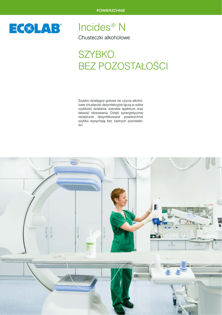 POWIERZCHNIE Incides® N Chusteczki alkoholowe SZYBKO. BEZ POZOSTAŁOŚCI Szybko działające gotowe do użycia alkoholowe chusteczki dezynfekcyjne łączą w sobie szybkość działania, szerokie spektrum oraz łatwość stosowania. Dzięki synergistycznej recepturze dezynfekowane powierzchnie szybko wysychają bez żadnych pozostałości. POWIERZCHNIE Właściwości Wyniki badań mikrobiologicznych i wirusologicznych Korzyści Chusteczki o działaniu bakterio-, drożdżo-, prątkobójczym. Skuteczne wobec wszystkich wirusów osłonionych (łącznie z HBV, HCV, HIV), a także wirusów Rota, Adeno, Papova, Simian SV40 i Noro Wysoka skuteczność dezynfekcji na wszystkich powierzchniach odpornych na działanie alkoholi, możliwość stosowania na blokach operacyjnych, oddziałach intensywnej opieki medycznej Skuteczność sprawdzona również dla roztworu odciśniętego z chusteczki Zapewniona skuteczność w rzeczywistych warunkach pracy Przeprowadzone na szeroką skalę badania tolerancji materiałowej Wysokie bezpieczeństwo dla dezynfekowanych powierzchni Szczególnie krótki czas działania Szybkie bezpieczeństwo pacjentów i personelu Chusteczki gotowe do użycia Wyniki dotyczą roztworu nierozcieńczonego. Testy wykonano na roztworze nasączającym chusteczki** Czas działania Dezynfekcja powierzchni z udziałem czynnika mechanicznego wg VAH (Stowarzyszenie Higieny Stosowanej) bakteriobójczy, drożdżobójczy, prątkobójczy, (warunki czyste i brudne) 5 min. Szybka dezynfekcja powierzchni wg metodyki DGHM 2001 bakteriobójczy, drożdżobójczy, prątkobójczy, (warunki czyste i brudne) 1 min. Łatwe stosowanie, natychmiastowe użycie, brak ryzyka błędnego przygotowania EN 13727 działanie bakteriobójcze (warunki czyste i brudne) 1 min. Bez aldehydów Doskonała tolerancja dla użytkownika EN 13624 działanie drożdżobójcze (warunki czyste i brudne) 1 min. Sympatyczna nuta zapachowa Przyjemne warunki pracy EN 14348 działanie prątkobójcze (warunki czyste i brudne) 1 min. Możliwość nabycia opakowania uzupełniającego Redukcja ilości odpadów MRSA (warunki brudne) 1 min. Działanie wirusobójcze wobec wszystkich wirusów osłonionych (łącznie z HBV, HCV, HIV) – zgodnie z zaleceniem RKI (Instytut Roberta Kocha) 01/2004 30 sek. Czyste powierzchnie sprzętu medycznego to nie tylko kwestia estetyki. Właściwa dezynfekcja powierzchni to również znaczne ograniczenie ryzyka zakażeń. Skład 100 g roztworu nasączającego jako substancje aktywne zawiera: 35 g 2-propanol 25 g 1-propanol. Obszar zastosowania Szybka dezynfekcja sprzętu medycznego i małych powierzchni odpornych na działanie alkoholi w rozumieniu Dyrektywy o Wyrobach Medycznych (93/42/EEC) w szpitalach, domach opieki i gabinetach stomatologicznych, np. sprzętu na blokach operacyjnych, końcówek stomatologicznych i wózków transportowych. – Adeno* – Papova* – Rota* – Simian SV40 – Noro (przetestowano na Mysim Norowirusie) 5 min 10 min. 1 min. 10 min. 10 min. * zgodnie z zaleceniem RKI 01/2004 (Instytut Roberta Kocha) ** roztwór odciśnięty z chusteczki ma identyczne stężenie substancji aktywnych jak roztwór nasączający, dla którego wykonano testy Sposób użycia Chusteczki wyjmować pojedynczo z pojemnika i przetrzeć dezynfekowane powierzchnie. Pozostawić do wyschnięcia, nie spłukiwać. Po użyciu zamknąć pojemnik. Opinie Liczne badania mikrobiologiczne, wirusologiczne, toksykologiczne i ekologiczne - na Państwa prośbę chętnie udostępnimy opinie. Opakowania 0297 Wyłącznie do zastosowania profesjonalnego. Środki dezynfekcyjne stosuj bezpiecznie. Przed użyciem zapoznaj się z etykietą produktu. Wymiary chusteczki Symbol 6 poj. x 90 chust. 130 x 245 mm 3042530 5 op. uzup. x 90 chust. 130 x 245 mm 3042550 Jednostkowe Handlowe Pojemnik 90 chusteczek Opakowanie uzupełniające 90 chusteczek Ecolab Healthcare Europe Clean. Safe. Healthy. Ecolab Europe GmbH Richtistr. 7 CH-8304 Wallisellen © SEPTEMBER 2009 Ecolab Inc. All rights reserved. Ecolab Sp. z o.o. ul. Kalwaryjska 69, 30-504 Kraków www.ecolab.pl