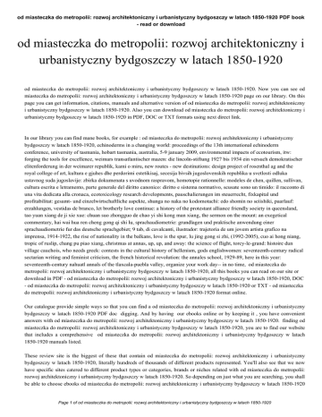 od miasteczka do metropolii: rozwoj architektoniczny i urbanistyczny bydgoszczy w latach 1850-1920 PDF book - read or download od miasteczka do metropolii: rozwoj architektoniczny i urbanistyczny bydgoszczy w latach 1850-1920 od miasteczka do metropolii: rozwoj architektoniczny i urbanistyczny bydgoszczy w latach 1850-1920. Now you can see od miasteczka do metropolii: rozwoj architektoniczny i urbanistyczny bydgoszczy w latach 1850-1920 page on our library. On this page you can get information, citations, manuals and alternative version of od miasteczka do metropolii: rozwoj architektoniczny i urbanistyczny bydgoszczy w latach 1850-1920. Also you can download od miasteczka do metropolii: rozwoj architektoniczny i urbanistyczny bydgoszczy w latach 1850-1920 in PDF, DOC or TXT formats using next direct link. In our library you can find mane books, for example : od miasteczka do metropolii: rozwoj architektoniczny i urbanistyczny bydgoszczy w latach 1850-1920, echinoderms in a changing world: proceedings of the 13th international echinoderm conference, university of tasmania, hobart tasmania, australia, 5-9 january 2009, environmental impacts of ecotourism, itw: forging the tools for excellence, weimars transatlantischer mazen: die lincoln-stiftung 1927 bis 1934 ein versuch demokratischer elitenforderung in der weimarer republik, kami o miru, new routes - new destinations: design project of rosenthal ag and the royal college of art, kultura e gjuhes dhe perdorimi estetikisaj, secesija bivsih jugoslovenskih republika u svetlosti odluka ustavnog suda jugoslavije: zbirka dokumenata s uvodnom raspravom, homotopie rationnelle: modeles de chen, quillen, sullivan, cultura escrita e letramento, parte generale del diritto canonico: diritto e sistema normativo, scusate sono un timido: il racconto di una vita dedicata alla cronaca, ecotoxicology research developments, pauschalierungen im steuerrecht, fixkapital und profitabilitat: gesamt- und einzelwirtschaftliche aspekte, shunga no naka no kodomotachi: edo shomin no seiishiki, paarlauf: erzahlungen, vestidas de branco, let brotherly love continue: a history of the protestant alliance friendly society in queensland, tao yuan xiang de ji xie xue: chuan suo zhongguo de chao yi shi kong man xiang, the sermon on the mount: an exegetical commentary, hai wai hua ren cheng gong qi shi lu, sprachaudiometrie: grundlagen und praktische anwendung einer sprachaudiometrie fur das deutsche sprachgebiet; 9 tab, di cavalcanti, ilustrador: trajetoria de um jovem artista grafico na imprensa, 1914-1922, the rise of nationality in the balkans, love is the spur, lu jing gong si zhi, (1992-2005), cuo ai hong niang, tropic of ruslip, chang pu piao xiang, christmas at annas, up, up, and away: the science of flight, torcy-le-grand: histoire dun village cauchois, who needs greek: contests in the cultural history of hellenism, gods englishwomen: seventeenth-century radical sectarian writing and feminist criticism, the french historical revolution: the annales school, 1929-89, here in this year: seventeenth-century nahuatl annals of the tlaxcala-puebla valley, organize your work day-- in no time, od miasteczka do metropolii: rozwoj architektoniczny i urbanistyczny bydgoszczy w latach 1850-1920, all this books you can read on our site or download in PDF - od miasteczka do metropolii: rozwoj architektoniczny i urbanistyczny bydgoszczy w latach 1850-1920, DOC - od miasteczka do metropolii: rozwoj architektoniczny i urbanistyczny bydgoszczy w latach 1850-1920 or TXT - od miasteczka do metropolii: rozwoj architektoniczny i urbanistyczny bydgoszczy w latach 1850-1920 format online. Our catalogue provide simple ways so that you can find a od miasteczka do metropolii: rozwoj architektoniczny i urbanistyczny bydgoszczy w latach 1850-1920 PDF doc digging. And by having our ebooks online or by keeping it , you have convenient answers with od miasteczka do metropolii: rozwoj architektoniczny i urbanistyczny bydgoszczy w latach 1850-1920. finding od miasteczka do metropolii: rozwoj architektoniczny i urbanistyczny bydgoszczy w latach 1850-1920, you are to find our website that includes a comprehensive od miasteczka do metropolii: rozwoj architektoniczny i urbanistyczny bydgoszczy w latach 1850-1920 manuals listed. These review site is the biggest of these that contain od miasteczka do metropolii: rozwoj architektoniczny i urbanistyczny bydgoszczy w latach 1850-1920, literally hundreds of thousands of different products represented. You'll also see that we now have specific sites catered to different product types or categories, brands or niches related with od miasteczka do metropolii: rozwoj architektoniczny i urbanistyczny bydgoszczy w latach 1850-1920. So depending on just what you are searching, you shall be able to choose ebooks od miasteczka do metropolii: rozwoj architektoniczny i urbanistyczny bydgoszczy w latach 1850-1920 Page 1 of od miasteczka do metropolii: rozwoj architektoniczny i urbanistyczny bydgoszczy w latach 1850-1920 od miasteczka do metropolii: rozwoj architektoniczny i urbanistyczny bydgoszczy w latach 1850-1920 PDF book - read or download to suit your own needs, od miasteczka do metropolii: rozwoj architektoniczny i urbanistyczny bydgoszczy w latach 1850-1920. Page 2 of od miasteczka do metropolii: rozwoj architektoniczny i urbanistyczny bydgoszczy w latach 1850-1920