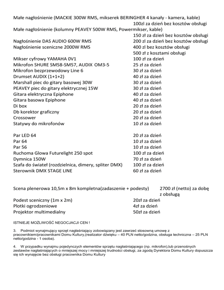 Małe nagłośnienie (MACKIE 300W RMS, mikserek BERINGHER 4 kanały - kamera, kable) 100zl za dzień bez kosztów obsługi Małe nagłośnienie (kolumny PEAVEY 500W RMS, Powermikser, kable) 150 zł za dzień bez kosztów obsługi Nagłośnienie DAS AUDIO 600W RMS 200 zl za dzień bez kosztów obsługi Nagłośnienie sceniczne 2000W RMS 400 zl bez kosztów obsługi 500 zł z kosztami obsługi Mikser cyfrowy YAMAHA 0V1 100 zł za dzień Mikrofon SHURE SM58-SM57, AUDIX OM3-5 25 zł za dzień Mikrofon bezprzewodowy Line 6 30 zł za dzień Drumset AUDIX (1+1+2) 40 zł za dzień Marshall piec do gitary basowej 30W 30 zł za dzień PEAVEY piec do gitary elektrycznej 15W 30 zł za dzień Gitara elektryczna Epiphone 40 zł za dzień Gitara basowa Epiphone 40 zł za dzień Di box 20 zł za dzień Db korektor graficzny 20 zł za dzień Crossower 20 zł za dzień Statywy do mikrofonów 10 zł za dzień Par LED 64 Par 64 Par 56 Ruchoma Glowa Futurelight 250 spot Dymnica 150W Szafa do świateł (rozdzielnica, dimery, spliter DMX) Sterownik DMX STAGE LINE 20 zł za dzień 10 zł za dzień 10 zł za dzień 100 zł za dzień 70 zł za dzień 100 zł za dzień 60 zł za dzień Scena plenerowa 10,5m x 8m kompletna(zadaszenie + podesty) Podest sceniczny (1m x 2m) Plotki ogrodzeniowe Projektor multimedialny 2700 zł (netto) za dobę z obsługą 20zł za dzień 4zł za dzień 50zł za dzień ISTNIEJE MOŻLIWOŚĆ NEGOCJACJI CEN ! 3. Podmiot wynajmujący sprzęt nagłaśniający zobowiązany jest zawrzeć stosowną umowę z pracownikiem/pracownikami Domu Kultury,(realizator dźwięku – 40 PLN netto/godzina, obsługa techniczna – 25 PLN netto/godzina - 1 osoba). 4. W przypadku wynajmu pojedynczych elementów sprzętu nagłaśniającego (np. mikrofon),lub przenośnych zestawów nagłaśniających o mniejszej mocy i mniejszej trudności obsługi, za zgodą Dyrektora Domu Kultury dopuszcza się ich wynajęcie bez obsługi pracownika Domu Kultury