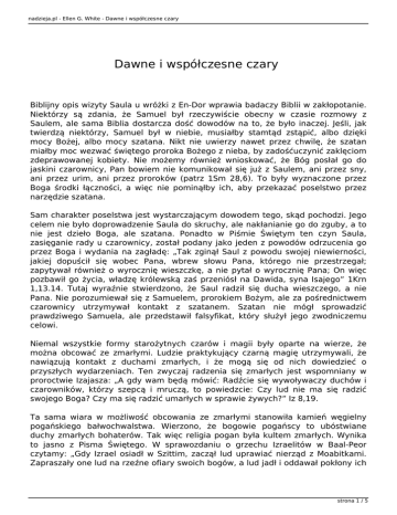 nadzieja.pl - Ellen G. White - Dawne i współczesne czary Dawne i współczesne czary Biblijny opis wizyty Saula u wróżki z En-Dor wprawia badaczy Biblii w zakłopotanie. Niektórzy są zdania, że Samuel był rzeczywiście obecny w czasie rozmowy z Saulem, ale sama Biblia dostarcza dość dowodów na to, że było inaczej. Jeśli, jak twierdzą niektórzy, Samuel był w niebie, musiałby stamtąd zstąpić, albo dzięki mocy Bożej, albo mocy szatana. Nikt nie uwierzy nawet przez chwilę, że szatan miałby moc wezwać świętego proroka Bożego z nieba, by zadośćuczynić zaklęciom zdeprawowanej kobiety. Nie możemy również wnioskować, że Bóg posłał go do jaskini czarownicy, Pan bowiem nie komunikował się już z Saulem, ani przez sny, ani przez urim, ani przez proroków (patrz 1Sm 28,6). To były wyznaczone przez Boga środki łączności, a więc nie pominąłby ich, aby przekazać poselstwo przez narzędzie szatana. Sam charakter poselstwa jest wystarczającym dowodem tego, skąd pochodzi. Jego celem nie było doprowadzenie Saula do skruchy, ale nakłanianie go do zguby, a to nie jest dzieło Boga, ale szatana. Ponadto w Piśmie Świętym ten czyn Saula, zasięganie rady u czarownicy, został podany jako jeden z powodów odrzucenia go przez Boga i wydania na zagładę: „Tak zginął Saul z powodu swojej niewierności, jakiej dopuścił się wobec Pana, wbrew słowu Pana, którego nie przestrzegał; zapytywał również o wyrocznię wieszczkę, a nie pytał o wyrocznię Pana; On więc pozbawił go życia, władzę królewską zaś przeniósł na Dawida, syna Isajego” 1Krn 1,13.14. Tutaj wyraźnie stwierdzono, że Saul radził się ducha wieszczego, a nie Pana. Nie porozumiewał się z Samuelem, prorokiem Bożym, ale za pośrednictwem czarownicy utrzymywał kontakt z szatanem. Szatan nie mógł sprowadzić prawdziwego Samuela, ale przedstawił falsyfikat, który służył jego zwodniczemu celowi. Niemal wszystkie formy starożytnych czarów i magii były oparte na wierze, że można obcować ze zmarłymi. Ludzie praktykujący czarną magię utrzymywali, że nawiązują kontakt z duchami zmarłych, i że mogą się od nich dowiedzieć o przyszłych wydarzeniach. Ten zwyczaj radzenia się zmarłych jest wspomniany w proroctwie Izajasza: „A gdy wam będą mówić: Radźcie się wywoływaczy duchów i czarowników, którzy szepcą i mruczą, to powiedzcie: Czy lud nie ma się radzić swojego Boga? Czy ma się radzić umarłych w sprawie żywych?” Iz 8,19. Ta sama wiara w możliwość obcowania ze zmarłymi stanowiła kamień węgielny pogańskiego bałwochwalstwa. Wierzono, że bogowie pogańscy to ubóstwiane duchy zmarłych bohaterów. Tak więc religia pogan była kultem zmarłych. Wynika to jasno z Pisma Świętego. W sprawozdaniu o grzechu Izraelitów w Baal-Peor czytamy: „Gdy Izrael osiadł w Szittim, zaczął lud uprawiać nierząd z Moabitkami. Zapraszały one lud na rzeźne ofiary swoich bogów, a lud jadł i oddawał pokłony ich strona 1 / 5 nadzieja.pl - Ellen G. White - Dawne i współczesne czary bogom. Izrael sprzęgnął się z Baalem Peor” Lb 25,1-3. Psalmista wyjaśnia, jakiego rodzaju bogom składano te ofiary. Mówiąc o tym samym odstępstwie Izraelitów, powiada: „Przyłączyli się do Baal-Peora i jedli z ofiar składanych umarłym” Ps 16,28. Ubóstwianie zmarłych zajmowało poczesne miejsce niemal w każdym pogańskim systemie wierzeń, podobnie jak domniemana łączność ze zmarłymi. Wierzono, że bogowie oznajmiają swoją wolę ludziom, a także, pytani o radę udzielają jej. Taki właśnie charakter miały słynne greckie i rzymskie wyrocznie. Wiara w łączność ze zmarłymi wciąż jest podtrzymywana, nawet w rzekomo chrześcijańskich krajach. Praktyka komunikowania się z istotami, utrzymującymi, że są duchami zmarłych, rozprzestrzeniła się pod nazwą spirytyzmu. Jest ona obliczona na pozyskanie sympatii tych, którzy złożyli do grobu swoich ukochanych. Czasem duchowe istoty ukazują się ludziom w postaci ich zmarłych przyjaciół, opowiadają o wydarzeniach związanych z ich życiem i wykonują różne czynności tak jak wtedy, gdy jeszcze żyli. W ten sposób doprowadzają do tego, że ludzie wierzą, iż ich zmarli przyjaciele są aniołami, unoszącymi się nad nimi i porozumiewającymi się z nimi. Tych, których się uważa za duchy zmarłych, traktuje się z pewną bałwochwalczą czcią, a dla wielu ich słowo ma większą wagę niż słowo Boże. Jest jednak wielu takich, którzy uważają spirytyzm za zwyczajną szarlatanerię. Objawienia, którymi spirytyzm uzasadnia swój nadprzyrodzony charakter, przypisują oszustwu, jakiego się dopuszczają media. Choć prawdą jest, że często rezultaty oszukańczych praktyk brano za prawdziwe nadprzyrodzone objawienia, istnieją też wyraźne dowody działania nadnaturalnej mocy. Wielu z tych, którzy odrzucają spirytyzm jako wytwór ludzkiej zręczności i przebiegłości, w zetknięciu się z objawieniami, których nie będą w stanie wyjaśnić, będzie skłonnych uznać je za prawdziwe. Zarówno współczesny spirytyzm, jak i różne formy starożytnego czarnoksięstwa i kultu bożków — których główną zasadą jest łączność ze zmarłymi — są oparte na pierwszym kłamstwie, którym szatan zwiódł Ewę w Edenie: „Na pewno nie umrzecie, lecz Bóg wie, że gdy tylko zjecie z niego, (...) będziecie jak Bóg” Rdz 3,4.5. Praktyki, oparte na tym samym kłamstwie i powielające je, wywodzą się od ojca kłamstwa. Hebrajczykom wyraźnie zakazano angażować się w jakikolwiek sposób w to, co stwarza pozory łączności ze zmarłymi. Bóg skutecznie zamknął te drzwi, gdy powiedział: „Umarli nic nie wiedzą (...) i nigdy już nie mają udziału w niczym z tego, co się dzieje pod słońcem” Koh 9,5.6. „Gdy opuszcza go dech, wraca do prochu swego; w tymże dniu giną wszystkie zamysły jego” Ps 146,4. Pan oświadczył też Izraelowi: „K