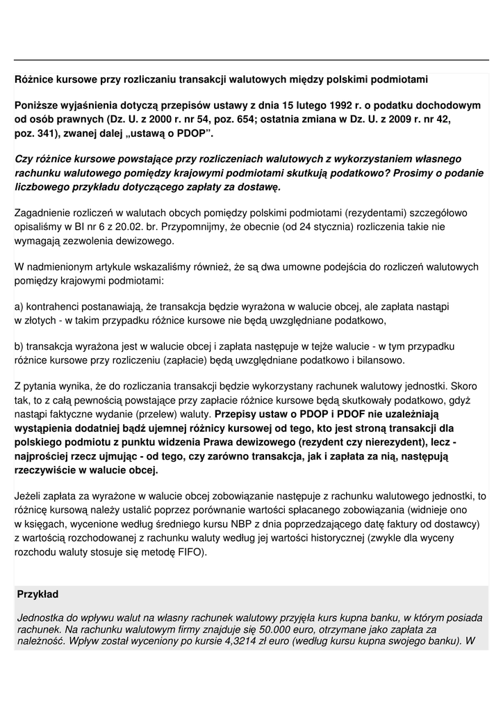 Różnice kursowe przy rozliczaniu transakcji walutowych między polskimi podmiotami Poniższe wyjaśnienia dotyczą przepisów ustawy z dnia 15 lutego 1992 r. o podatku dochodowym od osób prawnych (Dz. U. z 2000 r. nr 54, poz. 654; ostatnia zmiana w Dz. U. z 2009 r. nr 42, poz. 341), zwanej dalej „ustawą o PDOP”. Czy różnice kursowe powstające przy rozliczeniach walutowych z wykorzystaniem własnego rachunku walutowego pomiędzy krajowymi podmiotami skutkują podatkowo? Prosimy o podanie liczbowego przykładu dotyczącego zapłaty za dostawę. Zagadnienie rozliczeń w walutach obcych pomiędzy polskimi podmiotami (rezydentami) szczegółowo opisaliśmy w BI nr 6 z 20.02. br. Przypomnijmy, że obecnie (od 24 stycznia) rozliczenia takie nie wymagają zezwolenia dewizowego. W nadmienionym artykule wskazaliśmy również, że są dwa umowne podejścia do rozliczeń walutowych pomiędzy krajowymi podmiotami: a) kontrahenci postanawiają, że transakcja będzie wyrażona w walucie obcej, ale zapłata nastąpi w złotych - w takim przypadku różnice kursowe nie będą uwzględniane podatkowo, b) transakcja wyrażona jest w walucie obcej i zapłata następuje w tejże walucie - w tym przypadku różnice kursowe przy rozliczeniu (zapłacie) będą uwzględniane podatkowo i bilansowo. Z pytania wynika, że do rozliczania transakcji będzie wykorzystany rachunek walutowy jednostki. Skoro tak, to z całą pewnością powstające przy zapłacie różnice kursowe będą skutkowały podatkowo, gdyż nastąpi faktyczne wydanie (przelew) waluty. Przepisy ustaw o PDOP i PDOF nie uzależniają wystąpienia dodatniej bądź ujemnej różnicy kursowej od tego, kto jest stroną transakcji dla polskiego podmiotu z punktu widzenia Prawa dewizowego (rezydent czy nierezydent), lecz najprościej rzecz ujmując - od tego, czy zarówno transakcja, jak i zapłata za nią, następują rzeczywiście w walucie obcej. Jeżeli zapłata za wyrażone w walucie obcej zobowiązanie następuje z rachunku walutowego jednostki, to różnicę kursową należy ustalić poprzez porównanie wartości spłacanego zobowiązania (widnieje ono w księgach, wycenione według średniego kursu NBP z dnia poprzedzającego datę faktury od dostawcy) z wartością rozchodowanej z rachunku waluty według jej wartości historycznej (zwykle dla wyceny rozchodu waluty stosuje się metodę FIFO). Przykład Jednostka do wpływu walut na własny rachunek walutowy przyjęła kurs kupna banku, w którym posiada rachunek. Na rachunku walutowym firmy znajduje się 50.000 euro, otrzymane jako zapłata za należność. Wpływ został wyceniony po kursie 4,3214 zł euro (według kursu kupna swojego banku). W dniu 14 lutego jednostka zakupiła od polskiej firmy towar o wartości brutto 22.000 euro - zobowiązanie wycenione według średniego kursu NBP z 13 lutego 2009 r., tj. 4,6393 zł/euro - jego wartość zatem to 102.064,60 zł, w tym VAT 18.405,09 zł (VAT przeliczony już na fakturze od dostawcy). Zapłata za towar następuje w dniu 23 lutego br. - w tym celu z rachunku walutowego zostaje rozchodowana kwota 22.000 euro, wyceniona według takiego kursu, po jakim wpłynęła w przeszłości na tenże rachunek, tj. po 4,3214 zł/euro. Dekretacja: 1. Faktura za zakup towarów: a) Wn konto 30 „Rozliczenie zakupu” - kwota 83.659,52 zł - wartość netto, - Wn konto 22-1 „VAT naliczony” - kwota 18.405,09 zł - VAT z faktury, - Ma konto 22 „Zobowiązania z tytułu dostaw i usług” - kwota 102.064,60 zł (22.000 euro); b) Wn konto 33 „Towary” - kwota 83.659,52 zł, - Ma konto 30 „Rozliczenie zakupu” - kwota 83.659,52 zł. 2. Zapłata za dostawę z rachunku walutowego: - Ma konto 13 „Rachunek bankowy - dewizowy” - kwota 95.070,80 zł (22.000 euro x 4,3214 zł/euro), - Wn konto 22 „Zobowiązania z tytułu dostaw i usług” - kwota 102.064,60 zł (22.000 euro x 4,6393 zł/euro), - Ma konto 75-0 „Przychody finansowe” (w analityce: Zrealizowane różnice kursowe - kwota 6.993,80 zł). Księgowania: