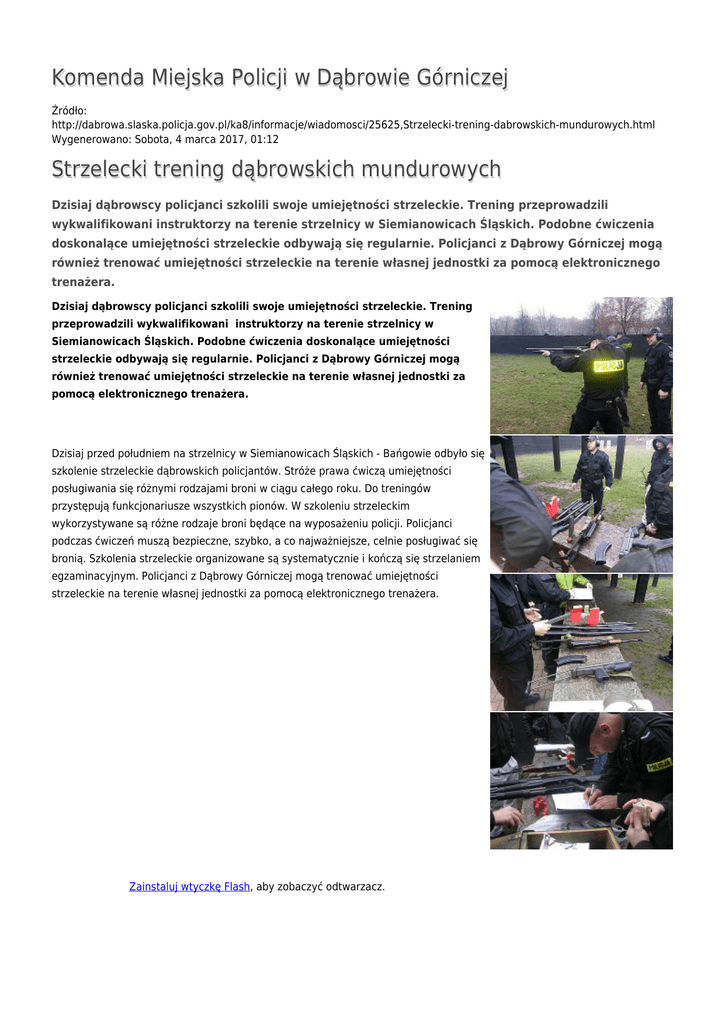 Komenda Miejska Policji w Dąbrowie Górniczej Źródło: http://dabrowa.slaska.policja.gov.pl/ka8/informacje/wiadomosci/25625,Strzelecki-trening-dabrowskich-mundurowych.html Wygenerowano: Sobota, 4 marca 2017, 01:12 Strzelecki trening dąbrowskich mundurowych Dzisiaj dąbrowscy policjanci szkolili swoje umiejętności strzeleckie. Trening przeprowadzili wykwalifikowani instruktorzy na terenie strzelnicy w Siemianowicach Śląskich. Podobne ćwiczenia doskonalące umiejętności strzeleckie odbywają się regularnie. Policjanci z Dąbrowy Górniczej mogą również trenować umiejętności strzeleckie na terenie własnej jednostki za pomocą elektronicznego trenażera. Dzisiaj dąbrowscy policjanci szkolili swoje umiejętności strzeleckie. Trening przeprowadzili wykwalifikowani instruktorzy na terenie strzelnicy w Siemianowicach Śląskich. Podobne ćwiczenia doskonalące umiejętności strzeleckie odbywają się regularnie. Policjanci z Dąbrowy Górniczej mogą również trenować umiejętności strzeleckie na terenie własnej jednostki za pomocą elektronicznego trenażera. Dzisiaj przed południem na strzelnicy w Siemianowicach Śląskich - Bańgowie odbyło się szkolenie strzeleckie dąbrowskich policjantów. Stróże prawa ćwiczą umiejętności posługiwania się różnymi rodzajami broni w ciągu całego roku. Do treningów przystępują funkcjonariusze wszystkich pionów. W szkoleniu strzeleckim wykorzystywane są różne rodzaje broni będące na wyposażeniu policji. Policjanci podczas ćwiczeń muszą bezpieczne, szybko, a co najważniejsze, celnie posługiwać się bronią. Szkolenia strzeleckie organizowane są systematycznie i kończą się strzelaniem egzaminacyjnym. Policjanci z Dąbrowy Górniczej mogą trenować umiejętności strzeleckie na terenie własnej jednostki za pomocą elektronicznego trenażera. Zainstaluj wtyczkę Flash, aby zobaczyć odtwarzacz. pobierz film - 8.44 MB Ocena: 0/5 (0) Tweetnij