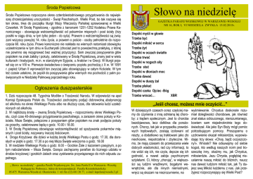 Środa Popielcowa Środa Popielcowa rozpoczyna okres czterdziestodniowego przygotowania do największej chrześcijańskiej uroczystości - Świąt Paschalnych. Wielki Post, bo tak nazywa się ten okres, trwa do początku liturgii Mszy Wieczerzy Pańskiej sprawowanej w Wielki Czwartek. W Środę Popielcową - zgodnie z kanonami 1251-1252 Kodeksu Prawa Kanonicznego - obowiązuje wstrzemięźliwość od pokarmów mięsnych i post ścisły (trzy posiłki w ciągu dnia, w tym tylko jeden - do syta). Prawem o wstrzemięźliwości są związani wszyscy powyżej 14. roku życia, a prawem o poście - osoby pełnoletnie do rozpoczęcia 60. roku życia. Prawo kanoniczne nie nakłada na wiernych natomiast obowiązku uczestniczenia w tym dniu w Eucharystii (chociaż jest to powszechną praktyką, z której nie powinno się rezygnować bez ważnej przyczyny). Sam zwyczaj posypywania głów popiołem na znak żałoby i pokuty, celebrowany w Środę Popielcową, znany jest w wielu kulturach i tradycjach, m.in. w starożytnym Egipcie, u Arabów i w Grecji. W liturgii pojawił się on w VIII w. Pierwsze świadectwa o święceniu popiołu pochodzą z X w. W 1091 r. papież Urban II wprowadził ten zwyczaj jako obowiązujący w całym Kościele. W tym też czasie ustalono, że popiół do posypywania głów wiernych ma pochodzić z palm poświęconych w Niedzielę Palmową poprzedniego roku. Ogłoszenia duszpasterskie 1. Dziś rozpoczęcie 48. Tygodnia Modlitw o Trzeźwość Narodu. W odpowiedzi na apel Komisji Episkopatu Polski ds. Trzeźwości zechciejmy podjąć dobrowolną abstynencję od alkoholu na okres Wielkiego Postu albo na dłuższy czas, dla ratowania ludzi uzależnionych od alkoholu. 2. W najbliższą środę – zwaną Środą Popielcową – rozpoczniemy okres Wielkiego Postu, czyli czas 40-dniowego przygotowania paschalnego, a zarazem okres pokuty w Kościele. Msze Święte, połączone z posypaniem głów popiołem na znak podjęcia pokuty za grzechy, celebrowane będą o godz. 10.00 i 18.00. 3. W Środę Popielcową obowiązuje wstrzemięźliwość od spożywania pokarmów mięsnych i post ścisły, nazywany inaczej ilościowym. 4. Droga Krzyżowa: dla dzieci w każdą środę Wielkiego Postu o godz. 17.30, dla dorosłych w piątki o godz. 17.30 a po niej Msza Święta wieczorna o godz. 18.00 5. W niedziele Wielkiego Postu o godz. 8.00 – Gorzkie Żale z kazaniem pasyjnym, a po tym nabożeństwie – Msza Święta. Gorąco zachęcamy parafian do licznego udziału w drodze krzyżowej i gorzkich żalach oraz zyskiwania przywiązanego do nich odpustu zupełnego. „ Słowo na niedzielę” - gazetka Parafii Wojskowej pw. Św. Jana Pawła II w Warszawie -Wesołej. Redaguje ks. Proboszcz. Adres do korespondencji: Parafia Rzymskokatolicka 05-075 Warszawa-Wesoła ul. Okuniewska 1 tel./fax (22) 681 20 77, e-mail: kapelan@wesoła.3.pl Słowo na niedzielę GAZETKA PARAFII WOJSKOWEJ W WARSZAWIE-WESOŁEJ NR 16, ROK I, VI NIEDZIELA ZWYKŁA 15.02.2015r. Dopóki myśli w głowie Trzeba być Dopóki miłość w sercu Trzeba żyć Dopóki w oczach światło Trzeba trwać Dopóki w nogach siły Trzeba stać Dopóki w dłoniach moc Trzeba dawać Dopóki w duszy żal Trzeba płakać Dopóki czeka Ojciec -Bóg Trzeba wracać… XBR „Jeśli chcesz, możesz mnie oczyścić...” W dzisiejszych czasach coraz częściej mamy do czynienia z inną odmianą tej choroby: z trądem społecznym. Jest to choroba bezobjawowa, lecz dotkliwa dla porażonych. Chorzy, tak jak w przypadku prawdziwych trędowatych, zostają izolowani od reszty, a dodatkowo są traktowani jako zło niechciane, niepotrzebne i zbyteczne. Mimo, że mają czasami do przekazania wiele dobrych wiadomości, rad czy informacji, to nie widzi się ich, nie czyta, depcze się ich godność, a nawet zabija psychicznymi sztyletami. Ci, którzy „chorują”, w większości są ludźmi wrażliwymi, bogatymi wewnętrznie, ale dla innych niemodnymi, wręcz są skazani na niezrozumienie, na wyśmiewanie. Chrystus doskonale rozumiał dolegliwości chorobowe, jak również znał status odrzuconego, nierozumianego, bowiem sam niejednokrotnie tego doświadczał. Ale jako Syn Boży mógł pomóc potrzebującym pomocy. Proszącemu o uzdrowienie okazał miłosierdzie, wypowiadając trzy słowa: «Chcę, bądź oczyszczony!». Wnioski? Nie odsuwajmy od siebie kogoś, kto według naszych norm jest troszeczkę inny, okażmy mu, jak Chrystus, miłosierdzie. Jezu Chryste, pogłębiaj nieustannie naszą miłość do bliźnich, naucz nas dawać ludziom miłość tak, jak Ty dajesz swą Miłość każdemu z nas. Jak przeżyjesz rozpoczynający się Wielki Post? Liturgia Słowa na VI Niedzielę Zwykłą B I Czytanie Kpł 13, 1-2. 45-46 II Czytanie 1 Kor 10,31-11,1 Czytanie z Księgi Kapłańskiej Tak powiedział Pan do Mojżesza i Aarona: „Jeżeli u kogoś na skórze ciała pojawi się nabrzmienie albo wysypka, albo biała plama, która na skórze jego ciała jest oznaką trądu, to przyprowadzą go do kapłana Aarona albo do jednego z jego synów kapłanów. Trędowaty, który podlega tej chorobie, będzie miał rozerwane szaty, włosy w nieładzie, brodę zasłoniętą i będzie wołać: „Nieczysty, nieczysty!”. Przez cały czas trwania tej choroby będzie nieczysty. Będzie mieszkał w odosobnieniu. Jego mieszkanie będzie poza obozem”. Oto słowo Boże Czytanie z Pierwszego listu świętego Pawła Apostoła do Koryntian Bracia: Czy jecie, czy pijecie, czy cokolwiek innego czynicie, wszystko na chwałę Bożą czyńcie. Nie bądźcie zgorszeniem ani dla Żydów, ani dla Greków, ani dla Kościoła Bożego, podobnie jak ja, który się staram przypodobać wszystkim, nie szukając własnej korzyści, lecz dobra wielu, aby byli zbawieni. Bądźcie naśladowcami moimi, tak jak ja jestem naśladowcą Chrystusa. Oto słowo Boże. Ewangelia wg św. Marka 1,40-45 Słowa Ewangelii według świętego Marka Pewnego dnia przyszedł do Jezusa trędowaty i upadając na kolana,