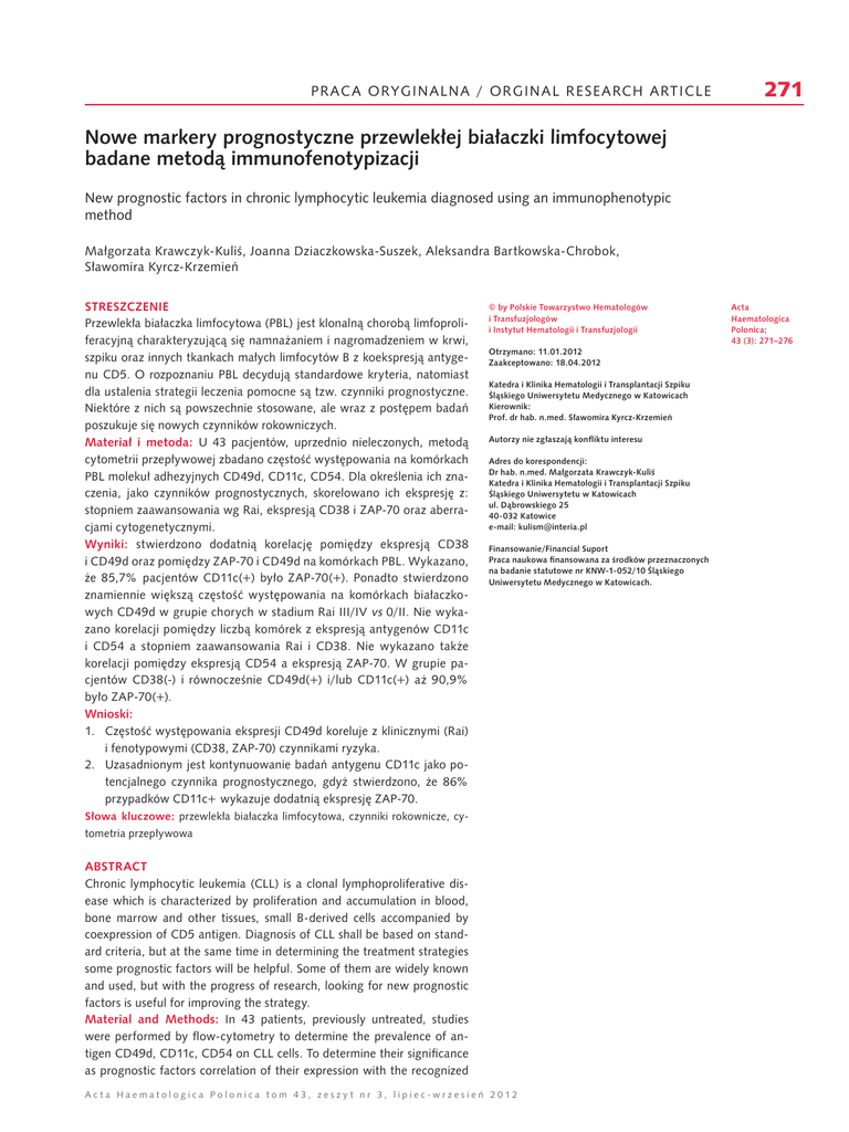 Praca ORYGINALNA / Orginal research article 271 Nowe markery prognostyczne przewlekłej białaczki limfocytowej badane metodą immunofenotypizacji New prognostic factors in chronic lymphocytic leukemia diagnosed using an immunophenotypic method Małgorzata Krawczyk-Kuliś, Joanna Dziaczkowska-Suszek, Aleksandra Bartkowska-Chrobok, Sławomira Kyrcz-Krzemień Streszczenie Przewlekła białaczka limfocytowa (PBL) jest klonalną chorobą limfoproliferacyjną charakteryzującą się namnażaniem i nagromadzeniem w krwi, szpiku oraz innych tkankach małych limfocytów B z koekspresją antygenu CD5. O rozpoznaniu PBL decydują standardowe kryteria, natomiast dla ustalenia strategii leczenia pomocne są tzw. czynniki prognostyczne. Niektóre z nich są powszechnie stosowane, ale wraz z postępem badań poszukuje się nowych czynników rokowniczych. Materiał i metoda: U 43 pacjentów, uprzednio nieleczonych, metodą cytometrii przepływowej zbadano częstość występowania na komórkach PBL molekuł adhezyjnych CD49d, CD11c, CD54. Dla określenia ich znaczenia, jako czynników prognostycznych, skorelowano ich ekspresję z: stopniem zaawansowania wg Rai, ekspresją CD38 i ZAP-70 oraz aberracjami cytogenetycznymi. Wyniki: stwierdzono dodatnią korelację pomiędzy ekspresją CD38 i CD49d oraz pomiędzy ZAP-70 i CD49d na komórkach PBL. Wykazano, że 85,7% pacjentów CD11c(+) było ZAP-70(+). Ponadto stwierdzono znamiennie większą częstość występowania na komórkach białaczkowych CD49d w grupie chorych w stadium Rai III/IV vs 0/II. Nie wykazano korelacji pomiędzy liczbą komórek z ekspresją antygenów CD11c i CD54 a stopniem zaawansowania Rai i CD38. Nie wykazano także korelacji pomiędzy ekspresją CD54 a ekspresją ZAP-70. W grupie pacjentów CD38(-) i równocześnie CD49d(+) i/lub CD11c(+) aż 90,9% było ZAP-70(+). Wnioski: 1. Częstość występowania ekspresji CD49d koreluje z klinicznymi (Rai) i fenotypowymi (CD38, ZAP-70) czynnikami ryzyka. 2. Uzasadnionym jest kontynuowanie badań antygenu CD11c jako potencjalnego czynnika prognostycznego, gdyż stwierdzono, że 86% przypadków CD11c+ wykazuje dodatnią ekspresję ZAP-70. © by Polskie Towarzystwo Hematologów i Transfuzjologów i Instytut Hematologii i Transfuzjologii Otrzymano: 11.01.2012 Zaakceptowano: 18.04.2012 Katedra i Klinika Hematologii i Transplantacji Szpiku Śląskiego Uniwersytetu Medycznego w Katowicach Kierownik: Prof. dr hab. n.med. Sławomira Kyrcz-Krzemień Autorzy nie zgłaszają konfliktu interesu Adres do korespondencji: Dr hab. n.med. Małgorzata Krawczyk-Kuliś Katedra i Klinika Hematologii i Transplantacji Szpiku Śląskiego Uniwersytetu w Katowicach ul. Dąbrowskiego 25 40-032 Katowice e-mail: [email protected] Finansowanie/Financial Suport Praca naukowa finansowana za środków przeznaczonych na badanie statutowe nr KNW-1-052/10 Śląskiego Uniwersytetu Medycznego w Katowicach. Słowa kluczowe: przewlekła białaczka limfocytowa, czynniki rokownicze, cytometria przepływowa ABSTRACT Chronic lymphocytic leukemia (CLL) is a clonal lymphoproliferative disease which is characterized by proliferation and accumulation in blood, bone marrow and other tissues, small B-derived cells accompanied by coexpression of CD5 antigen. Diagnosis of CLL shall be based on standard criteria, but at the same time in determining the treatment strategies some prognostic factors will be helpful. Some of them are widely known and used, but with the progress of research, looking for new prognostic factors is useful for improving the strategy. Material and Methods: In 43 patients, previously untreated, studies were performed by flow-cytometry to determine the prevalence of antigen CD49d, CD11c, CD54 on CLL cells. To determine their significance as prognostic factors correlation of their expression with the recognized Ac t a H aemato l og ic a Po l o nic a to m 43, ze s z y t nr 3, l ipie c-wr ze s ie ń 2012 Acta Haematologica Polonica; 43 (3): 271–276 272 Praca ORYGINALNA / Orginal research article standard prognostic factors, such as Rai stage, expression of CD38 and ZAP-70 as well as the presence of cytogenetic changes were done. Results: In our studies, a positive correlation between the expression of CD38 and CD49d, and ZAP-70 and CD49d on CLL cells were found. It was shown that among patients with CD11c + up 85.7% there were ZAP-70 positive. In addition, a significantly higher incidence of leukemic cells CD49d+ antigen was present in patients in Rai stage III / IV vs. 0/ II. There were no correlations between the number of cells expressing the antigens CD 11c and CD54 and the degree of advancement of Rai and expression of CD38. We also showed no correlation between the expression of CD54 and the expression of ZAP-70 either. In the group of patients CD38 (−), alternatively CD49d (+) and / or CD11c (+) up to 90.9% there were ZAP-70 (+). Conclusions: 1. Frequency of the incidence of the expression of CD49d correlates with clinical (Rai stage system) and/or risk factors determined by immunophenotype methods (CD38, ZAP-70). 2. There is a rationale to continue CD11c antigen estimation as a potential prognostic factor based on our results that 86% of CD11c+ cases presented ZAP-70 positivity. Key words: Chronic lymphocytic leukemia, Prognostic factors, Flow cytometry Wstęp Przewlekła białaczka limfocytowa (PBL) jest klonalną chorobą limfoproliferacyjną, która cechuje się proliferacją i nagromadzeniem małych, dojrzałych morfologicznie, ale niesprawnych czynnościowo limfocytów B we krwi obwodowej, szpiku kostnym, węzłach chłonnych, śledzionie i wątrobie. Chorzy z PBL stanowią heterogenną grupę kliniczną, różniącą się dynamiką przebiegu choroby, czasem przeżycia i odpowiedzią na leczenie. Poszukiwanie nowych czynników rokowniczych w PBL umożliwiających ulepszenie strategii leczenia, optymalne monitorowanie kliniczne, a także wypracowanie nowych strategii terapeutycznych jest obecnie przedmiotem wie