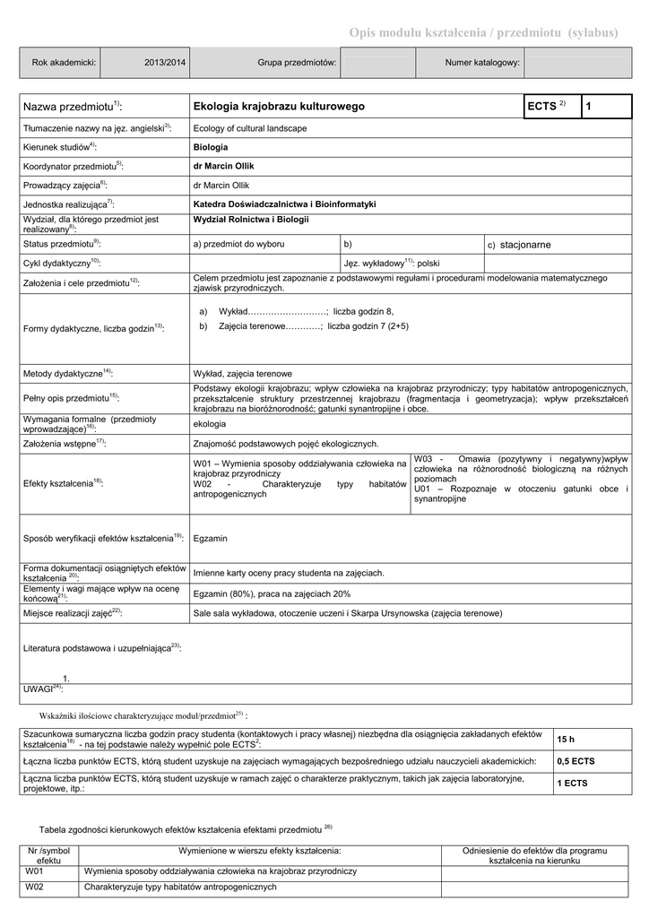 Opis modułu kształcenia / przedmiotu (sylabus) Rok akademicki: 2013/2014 Grupa przedmiotów: Numer katalogowy: Nazwa przedmiotu1): Ekologia krajobrazu kulturowego Tłumaczenie nazwy na jęz. angielski3): Ecology of cultural landscape 4) ECTS 2) 1 Biologia Kierunek studiów : 5) Koordynator przedmiotu : dr Marcin Ollik Prowadzący zajęcia6): dr Marcin Ollik 7) Jednostka realizująca : Katedra Doświadczalnictwa i Bioinformatyki Wydział, dla którego przedmiot jest realizowany8): Wydział Rolnictwa i Biologii Status przedmiotu9): a) przedmiot do wyboru Cykl dydaktyczny10): b) c) stacjonarne Jęz. wykładowy11): polski Celem przedmiotu jest zapoznanie z podstawowymi regułami i procedurami modelowania matematycznego zjawisk przyrodniczych. Założenia i cele przedmiotu12): 13) Formy dydaktyczne, liczba godzin : a) Wykład………………………; liczba godzin 8, b) Zajęcia terenowe…………; liczba godzin 7 (2+5) Metody dydaktyczne14): Wykład, zajęcia terenowe Pełny opis przedmiotu15): Podstawy ekologii krajobrazu; wpływ człowieka na krajobraz przyrodniczy; typy habitatów antropogenicznych, przekształcenie struktury przestrzennej krajobrazu (fragmentacja i geometryzacja); wpływ przekształceń krajobrazu na bioróżnorodność; gatunki synantropijne i obce. Wymagania formalne (przedmioty wprowadzające)16): ekologia 17) Założenia wstępne : Znajomość podstawowych pojęć ekologicznych. Efekty kształcenia18): W03 Omawia (pozytywny i negatywny)wpływ W01 – Wymienia sposoby oddziaływania człowieka na człowieka na różnorodność biologiczną na różnych krajobraz przyrodniczy poziomach W02 Charakteryzuje typy habitatów U01 – Rozpoznaje w otoczeniu gatunki obce i antropogenicznych synantropijne Sposób weryfikacji efektów kształcenia19): Egzamin Forma dokumentacji osiągniętych efektów Imienne karty oceny pracy studenta na zajęciach. kształcenia 20): Elementy i wagi mające wpływ na ocenę Egzamin (80%), praca na zajęciach 20% końcową21): Miejsce realizacji zajęć22): Sale sala wykładowa, otoczenie uczeni i Skarpa Ursynowska (zajęcia terenowe) Literatura podstawowa i uzupełniająca23): 1. UWAGI24): Wskaźniki ilościowe charakteryzujące moduł/przedmiot25) : Szacunkowa sumaryczna liczba godzin pracy studenta (kontaktowych i pracy własnej) niezbędna dla osiągnięcia zakładanych efektów kształcenia18) - na tej podstawie należy wypełnić pole ECTS2: 15 h Łączna liczba punktów ECTS, którą student uzyskuje na zajęciach wymagających bezpośredniego udziału nauczycieli akademickich: 0,5 ECTS Łączna liczba punktów ECTS, którą student uzyskuje w ramach zajęć o charakterze praktycznym, takich jak zajęcia laboratoryjne, projektowe, itp.: 1 ECTS Tabela zgodności kierunkowych efektów kształcenia efektami przedmiotu 26) Nr /symbol efektu W01 Wymienione w wierszu efekty kształcenia: Wymienia sposoby oddziaływania człowieka na krajobraz przyrodniczy W02 Charakteryzuje typy habitatów antropogenicznych Odniesienie do efektów dla programu kształcenia na kierunku U03 W01 Omawia (pozytywny i negatywny)wpływ człowieka na różnorodność biologiczną na różnych poziomach Rozpoznaje w otoczeniu gatunki obce i synantropijne