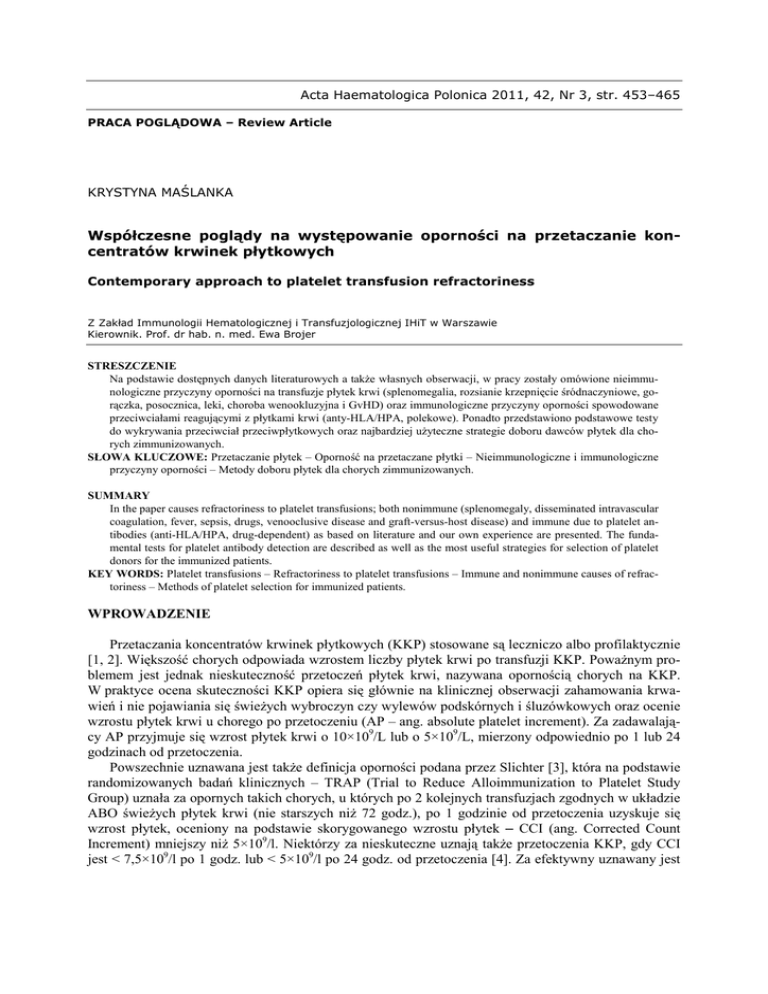 Acta Haematologica Polonica 2011, 42, Nr 3, str. 453–465 PRACA POGLĄDOWA – Review Article KRYSTYNA MAŚLANKA Współczesne poglądy na występowanie oporności na przetaczanie koncentratów krwinek płytkowych Contemporary approach to platelet transfusion refractoriness Z Zakład Immunologii Hematologicznej i Transfuzjologicznej IHiT w Warszawie Kierownik. Prof. dr hab. n. med. Ewa Brojer STRESZCZENIE Na podstawie dostępnych danych literaturowych a takŜe własnych obserwacji, w pracy zostały omówione nieimmunologiczne przyczyny oporności na transfuzje płytek krwi (splenomegalia, rozsianie krzepnięcie śródnaczyniowe, gorączka, posocznica, leki, choroba wenookluzyjna i GvHD) oraz immunologiczne przyczyny oporności spowodowane przeciwciałami reagującymi z płytkami krwi (anty-HLA/HPA, polekowe). Ponadto przedstawiono podstawowe testy do wykrywania przeciwciał przeciwpłytkowych oraz najbardziej uŜyteczne strategie doboru dawców płytek dla chorych zimmunizowanych. SŁOWA KLUCZOWE: Przetaczanie płytek – Oporność na przetaczane płytki – Nieimmunologiczne i immunologiczne przyczyny oporności – Metody doboru płytek dla chorych zimmunizowanych. SUMMARY In the paper causes refractoriness to platelet transfusions; both nonimmune (splenomegaly, disseminated intravascular coagulation, fever, sepsis, drugs, venooclusive disease and graft-versus-host disease) and immune due to platelet antibodies (anti-HLA/HPA, drug-dependent) as based on literature and our own experience are presented. The fundamental tests for platelet antibody detection are described as well as the most useful strategies for selection of platelet donors for the immunized patients. KEY WORDS: Platelet transfusions – Refractoriness to platelet transfusions – Immune and nonimmune causes of refractoriness – Methods of platelet selection for immunized patients. WPROWADZENIE Przetaczania koncentratów krwinek płytkowych (KKP) stosowane są leczniczo albo profilaktycznie [1, 2]. Większość chorych odpowiada wzrostem liczby płytek krwi po transfuzji KKP. PowaŜnym problemem jest jednak nieskuteczność przetoczeń płytek krwi, nazywana opornością chorych na KKP. W praktyce ocena skuteczności KKP opiera się głównie na klinicznej obserwacji zahamowania krwawień i nie pojawiania się świeŜych wybroczyn czy wylewów podskórnych i śluzówkowych oraz ocenie wzrostu płytek krwi u chorego po przetoczeniu (AP – ang. absolute platelet increment). Za zadawalający AP przyjmuje się wzrost płytek krwi o 10×109/L lub o 5×109/L, mierzony odpowiednio po 1 lub 24 godzinach od przetoczenia. Powszechnie uznawana jest takŜe definicja oporności podana przez Slichter [3], która na podstawie randomizowanych badań klinicznych – TRAP (Trial to Reduce Alloimmunization to Platelet Study Group) uznała za opornych takich chorych, u których po 2 kolejnych transfuzjach zgodnych w układzie ABO świeŜych płytek krwi (nie starszych niŜ 72 godz.), po 1 godzinie od przetoczenia uzyskuje się wzrost płytek, oceniony na podstawie skorygowanego wzrostu płytek – CCI (ang. Corrected Count Increment) mniejszy niŜ 5×109/l. Niektórzy za nieskuteczne uznają takŜe przetoczenia KKP, gdy CCI jest < 7,5×109/l po 1 godz. lub < 5×109/l po 24 godz. od przetoczenia [4]. Za efektywny uznawany jest K. MAŚLANKA 454 CCI wyŜszy od 10×109/l. Do takiej oceny skuteczności transfuzji potrzebna jest znajomość nie tylko liczby płytek u chorego przed i po przetoczeniu, ale takŜe liczba płytek w KKP oraz powierzchnia ciała chorego. W Tabeli 1 przedstawiono róŜne metody obliczania wzrostu płytek krwi po przetoczeniu KKP. Tabela 1. Metody obliczania wzrostu płytek krwi po przetoczeniu krwinek płytkowych Table 1. Methods used in the calculation of platelet increment after platelet transfusion Nazwa obliczenia Absolutny wzrost płytek (absolute platelet increment -AP) Procentowy wzrost płytek krwi (percent platelet recovery –PPR) Wzór obliczenia Liczba płytek po transfuzji - liczba płytek przed transfuzją Liczba płytek po transfuzji(1011) – liczba płytek przed transfuzją (1011) × waga ciała (kg) × 0,075* -------------------------------------------------------------------------------------------- × 100% Liczba przetoczonych płytek krwi (1011) Skorygowany wskaźnik Liczba płytek po transfuzji (1011) – liczba płytek przed transfuzja (1011) wzrostu płytek krwi --------------------------------------------------------------------------------------- × pow. ciała (m2) (corrected count increLiczba przetoczonych płytek krwi (1011) ment – CCI). *objętość krwi, przyjmując 75 ml/kg tj.0.075 l/kg Przyczyny oporności na przetaczanie koncentraty krwinek płytkowych U wielokrotnych biorców krwinek płytkowych oporność na przetaczane KKP moŜe być spowodowana czynnikami nieimmunologicznymi (np. hypersplenizmem, rozsianym krzepnięciem śródnaczyniowym czy infekcją bakteryjną) lub/i immunologicznymi (np. alloprzeciwciałami anty-HLA lub allo/autoprzeciwciałami przeciwpłytkowymi). Około 2/3 przypadków oporności jest spowodowana przyczynami nieimmunologicznymi. Przypadki immunologicznej oporności naleŜą do mniejszości i zwykle wspólistnieją z czynnikami nieimmunologicznymi. Według niektórych autorów niskie wartości CCI po 10 minutach do 1 godziny od przetoczenia mogą świadczyć o immunologicznych przyczynach niszczenia płytek, a CCI prawidłowe po 1 godzinie i obniŜone dopiero po 24 godzinach moŜe być spowodowane czynnikami nieimmunologicznymi [1, 5]. Za oporność na transfuzje KKP moŜe być takŜe odpowiedzialny brak zgodność płytek w antygenach układu ABO między dawcą i biorcą. Nie bez znaczenia jest wiek przetaczanego KKP [6]. Napromieniowanie płytek krwi nie wpływa na efekt transfuzji [7]. Czynniki nieimmunologiczne i imunologiczne odpowiedzialne za oporność, zostały przedstawione w Tabeli 2 i będą opisane poniŜej. Tabela 2. Czynniki odpowiedzialne za