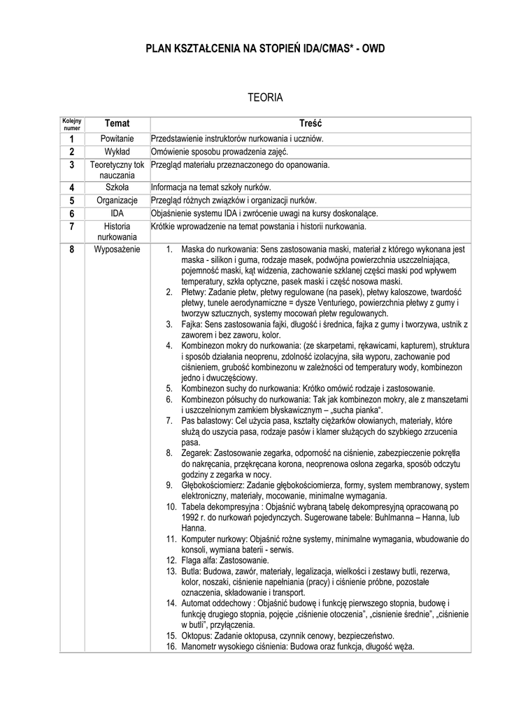 PLAN KSZTAŁCENIA NA STOPIEŃ IDA/CMAS* - OWD TEORIA Kolejny numer Temat 1 2 3 Powitanie Wykład Teoretyczny tok nauczania Szkoła Organizacje IDA Historia nurkowania Wyposażenie 4 5 6 7 8 Treść Przedstawienie instruktorów nurkowania i uczniów. Omówienie sposobu prowadzenia zajęć. Przegląd materiału przeznaczonego do opanowania. Informacja na temat szkoły nurków. Przegląd różnych związków i organizacji nurków. Objaśnienie systemu IDA i zwrócenie uwagi na kursy doskonalące. Krótkie wprowadzenie na temat powstania i historii nurkowania. 1. Maska do nurkowania: Sens zastosowania maski, materiał z którego wykonana jest maska - silikon i guma, rodzaje masek, podwójna powierzchnia uszczelniająca, pojemność maski, kąt widzenia, zachowanie szklanej części maski pod wpływem temperatury, szkła optyczne, pasek maski i część nosowa maski. 2. Płetwy: Zadanie płetw, płetwy regulowane (na pasek), płetwy kaloszowe, twardość płetwy, tunele aerodynamiczne = dysze Venturiego, powierzchnia płetwy z gumy i tworzyw sztucznych, systemy mocowań płetw regulowanych. 3. Fajka: Sens zastosowania fajki, długość i średnica, fajka z gumy i tworzywa, ustnik z zaworem i bez zaworu, kolor. 4. Kombinezon mokry do nurkowania: (ze skarpetami, rękawicami, kapturem), struktura i sposób działania neoprenu, zdolność izolacyjna, siła wyporu, zachowanie pod ciśnieniem, grubość kombinezonu w zależności od temperatury wody, kombinezon jedno i dwuczęściowy. 5. Kombinezon suchy do nurkowania: Krótko omówić rodzaje i zastosowanie. 6. Kombinezon półsuchy do nurkowania: Tak jak kombinezon mokry, ale z manszetami i uszczelnionym zamkiem błyskawicznym – „sucha pianka“. 7. Pas balastowy: Cel użycia pasa, kształty ciężarków ołowianych, materiały, które służą do uszycia pasa, rodzaje pasów i klamer służących do szybkiego zrzucenia pasa. 8. Zegarek: Zastosowanie zegarka, odporność na ciśnienie, zabezpieczenie pokrętła do nakręcania, przękręcana korona, neoprenowa osłona zegarka, sposób odczytu godziny z zegarka w nocy. 9. Głębokościomierz: Zadanie głębokościomierza, formy, system membranowy, system elektroniczny, materiały, mocowanie, minimalne wymagania. 10. Tabela dekompresyjna : Objaśnić wybraną tabelę dekompresyjną opracowaną po 1992 r. do nurkowań pojedynczych. Sugerowane tabele: Buhlmanna – Hanna, lub Hanna. 11. Komputer nurkowy: Objaśnić rożne systemy, minimalne wymagania, wbudowanie do konsoli, wymiana baterii - serwis. 12. Flaga alfa: Zastosowanie. 13. Butla: Budowa, zawór, materiały, legalizacja, wielkości i zestawy butli, rezerwa, kolor, noszaki, ciśnienie napełniania (pracy) i ciśnienie próbne, pozostałe oznaczenia, składowanie i transport. 14. Automat oddechowy : Objaśnić budowę i funkcję pierwszego stopnia, budowę i funkcję drugiego stopnia, pojęcie „ciśnienie otoczenia”, „cisnienie średnie”, „ciśnienie w butli”, przyłączenia. 15. Oktopus: Zadanie oktopusa, czynnik cenowy, bezpieczeństwo. 16. Manometr wysokiego ciśnienia: Budowa oraz funkcja, długość węża. 17. Urządzenia ratowniczo-wypornościowe: Budowa i funkcja, konstrukcje jedno- i dwupowłokowe, kamizelki, „śliniaki“, minimalne wymagania, mocowanie butli i innych elementów sprzętu na jackecie, dodatkowe urządzenia napełniające powietrzem. 18. Kompas: Rodzaje, budowa i funkcja, (wskazania na dodatkowy kurs IDA). 19. Latarka nurkwa: zastosowanie, kształty i wielkości, zasilanie akumulatorowe i bateryjne, lampa zastępcza, (wskazania na kurs IDA nurkowania w nocy.) 20. Linki bezpieczeństwa: Cel i zastosowanie, długość i materiał. 9 10 11 12 13 14 15 16 Obsługa i zasady Konserwacja , czyszczenie, pielęgnacja i obchodzenie się z wyposażeniem. Wskazania na obchodzenia się potrzebę przeprowadzenia konserwacji niektórych przedmiotów wyposażenia u ze sprzętem wyspecjalizowanych dystrybutorów . powietrznym Zasady Podać ogólne zasady bezpiecznego zachowania się na wodzie i po wodą podczas bezpieczeństwa nurkowania i po jego zakończeniu. Planowanie Wskazanie kierownika grupy, warunki środowiska, dobór sprzętu, plan nurkowania, i organizacja przygotowania do sytuacji awaryjnych. Ochrona Zachowanie po przybyciu nad wodę, po wejściu i opuszczeniu wody, tarowanie podczas środowiska nurkowania, respektowanie świata roślin i zwierząt. Czynności Objaśnienie czynności ratowniczych, zasad kierowania w sytuacjach awaryjnych i czynności ratownicze przygotowujące do takich sytuacji (droga ewakuacji, sprzęt ratowniczy - AMBU, inhalator). Partnerska Wytłumaczenie konieczności i przebiegu partnerskiej współpracy. współpraca Fizyka nurkowania 1. System jednostek SI: Wytłumaczyć podstawowe wielkości ważne dla nurkowania, podstawowe jednostki i skróty . Objaśnić pojęcia: „siła”, „ciśnienie”, „objętość”, „ilość gazu”. 2. Ciśnienie i siła: Przedstawić związek pomiędzy ciśnieniem a siłą, rozkład ciśnienia powietrza w atmosferze, rozkład ciśnienia w wodzie, ciśnienie w butli ze sprężonym powietrzem. 3. Ilość powietrza: Obliczyć ilość powietrza w butli na podstawie znajomości ciśnienia i objętości butli, wyjaśnić pojęcie „wentylacja minutowa“, ilość oddechów na minutę, pojemność płuc i przeprowadzić ćwiczenia na obliczanie zużycia powietrza oddychanego. 4. Prawo Boyle-Mariotte: Wyjaśnić związek pomiędzy ciśnieniem a objętością i temperaturą. Przeprowadzić obliczenia. 5. Prawo Archimedesa: Wytłumaczyć na podstawie przykładów, wyjaśnić równowagę hydrostatyczną (pływalność zerowa). 6. Prawo Daltona: Objaśnić skład powietrza, wykazać związek pomiędzy ciśnieniem całkowitym i ciśnieniem cząstkowym. 7. Prawo Gay-Lussac`a: Przedstawić wpływ temperatury i zachowanie się pewnej zamkniętej ilości gazu używąjac w tym celu przykładów odnoszących się do nurkowania. 8. Prawo Henry`ego: Omówić rozp