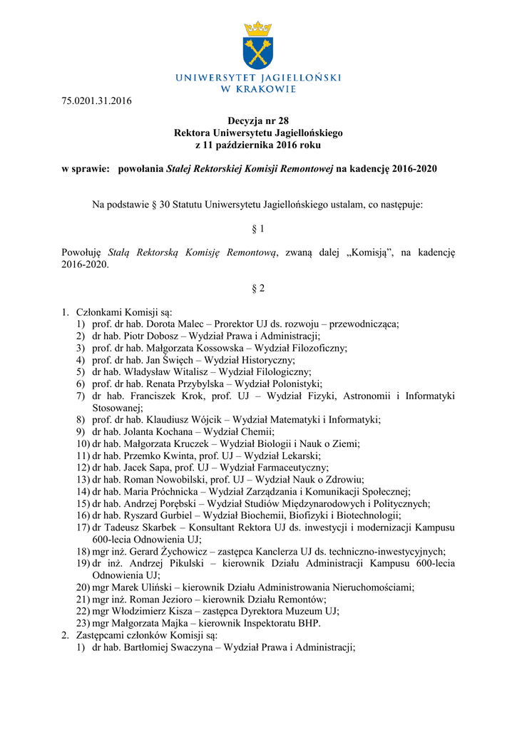 75.0201.31.2016 Decyzja nr 28 Rektora Uniwersytetu Jagiellońskiego z 11 października 2016 roku w sprawie: powołania Stałej Rektorskiej Komisji Remontowej na kadencję 2016-2020 Na podstawie § 30 Statutu Uniwersytetu Jagiellońskiego ustalam, co następuje: §1 Powołuję Stałą Rektorską Komisję Remontową, zwaną dalej „Komisją”, na kadencję 2016-2020. §2 1. Członkami Komisji są: 1) prof. dr hab. Dorota Malec – Prorektor UJ ds. rozwoju – przewodnicząca; 2) dr hab. Piotr Dobosz – Wydział Prawa i Administracji; 3) prof. dr hab. Małgorzata Kossowska – Wydział Filozoficzny; 4) prof. dr hab. Jan Święch – Wydział Historyczny; 5) dr hab. Władysław Witalisz – Wydział Filologiczny; 6) prof. dr hab. Renata Przybylska – Wydział Polonistyki; 7) dr hab. Franciszek Krok, prof. UJ – Wydział Fizyki, Astronomii i Informatyki Stosowanej; 8) prof. dr hab. Klaudiusz Wójcik – Wydział Matematyki i Informatyki; 9) dr hab. Jolanta Kochana – Wydział Chemii; 10) dr hab. Małgorzata Kruczek – Wydział Biologii i Nauk o Ziemi; 11) dr hab. Przemko Kwinta, prof. UJ – Wydział Lekarski; 12) dr hab. Jacek Sapa, prof. UJ – Wydział Farmaceutyczny; 13) dr hab. Roman Nowobilski, prof. UJ – Wydział Nauk o Zdrowiu; 14) dr hab. Maria Próchnicka – Wydział Zarządzania i Komunikacji Społecznej; 15) dr hab. Andrzej Porębski – Wydział Studiów Międzynarodowych i Politycznych; 16) dr hab. Ryszard Gurbiel – Wydział Biochemii, Biofizyki i Biotechnologii; 17) dr Tadeusz Skarbek – Konsultant Rektora UJ ds. inwestycji i modernizacji Kampusu 600-lecia Odnowienia UJ; 18) mgr inż. Gerard Żychowicz – zastępca Kanclerza UJ ds. techniczno-inwestycyjnych; 19) dr inż. Andrzej Pikulski – kierownik Działu Administracji Kampusu 600-lecia Odnowienia UJ; 20) mgr Marek Uliński – kierownik Działu Administrowania Nieruchomościami; 21) mgr inż. Roman Jezioro – kierownik Działu Remontów; 22) mgr Włodzimierz Kisza – zastępca Dyrektora Muzeum UJ; 23) mgr Małgorzata Majka – kierownik Inspektoratu BHP. 2. Zastępcami członków Komisji są: 1) dr hab. Bartłomiej Swaczyna – Wydział Prawa i Administracji; 2) dr hab. Lech Trzcionkowski – Wydział Filozoficzny; 3) dr hab. Marek Daniel Kowalski – Wydział Historyczny; 4) dr hab. Kazimierz Jurczak – Wydział Filologiczny; 5) dr hab. Krzysztof Zajas, prof. UJ – Wydział Polonistyki; 6) mgr inż. Małgorzata Makuch – Wydział Fizyki, Astronomii i Informatyki Stosowanej; 7) dr hab. Krzysztof Nowak – Wydział Matematyki i Informatyki; 8) prof. dr hab. Piotr Kuśtrowski – Wydział Chemii; 9) dr Zbigniew Tabarowski – Wydział Biologii i Nauk o Ziemi; 10) dr hab. Małgorzata Zwolińska-Wcisło, prof. UJ – Wydział Lekarski; 11) dr hab. Marcin Kołaczkowski – Wydział Farmaceutyczny; 12) dr Zbigniew Zalewski – Wydział Nauk o Zdrowiu; 13) dr hab. Andrzej Nowosad – Wydział Zarządzania i Komunikacji Społecznej; 14) dr hab. Dariusz Niedźwiedzki – Wydział Studiów Międzynarodowych i Politycznych; 15) mgr Piotr Widerski – Wydział Biochemii, Biofizyki i Biotechnologii; 16) mgr inż. Henryk Rutkowski – zastępca kierownika Działu Administracji Kampusu 600-lecia Odnowienia UJ; 17) mgr inż. Tomasz Wojtkiewicz – zastępca kierownika Działu Administrowania Nieruchomościami; 18) mgr Jolanta Pollesch – główny konserwator – Muzeum UJ; 19) mgr inż. Tomasz Wałowicz – główny specjalista ds. BHP. §3 1. Do zadań Komisji należy w szczególności: 1) dokonywanie analizy oceny wniosków remontowych składanych przez jednostki organizacyjne UJ do każdorazowego centralnego budżetu remontowego; 2) rekomendowanie Prorektorowi UJ ds. rozwoju zadań remontowych finansowanych z centralnego budżetu remontowego w ramach ustalonego prowizorium budżetowego; 3) opiniowanie propozycji wniosków składanych przez Uniwersytet Jagielloński do Społecznego Komitetu Odnowy Zabytków Krakowa o dofinansowanie zadań remontowo-konserwatorskich w zabytkowych obiektach UJ; 4) rekomendowanie innych zadań zleconych przez Rektora Uniwersytetu Jagiellońskiego i Prorektorów UJ. 2. Komisja współdziała i współpracuje z zastępcą Kanclerza UJ ds. technicznoinwestycyjnych oraz z Działem Remontów. §4 Obsługę administracyjną Komisji ds. techniczno-inwestycyjnych. zapewnia Sekretariat Zastępcy Kanclerza §5 Decyzja wchodzi w życie z dniem podpisania. Rektor Prof. dr hab. med. Wojciech Nowak UJ