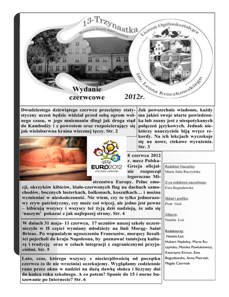 Wydanie czerwcowe 2012r. Dwudziestego dziewiątego czerwca przeciętny statystyczny uczeń będzie widział przed sobą ogrom wolnego czasu, w jego mniemaniu długi jak droga stąd do Kambodży i z powrotem oraz rozpościerający się jak wielobarwna kraina wiecznej tęczy. Str. 2 Jak powszechnie wiadomo, każdy ma jakieś swoje utarte powiedzonka lub znany jest z niespotykanych połączeń językowych. Jednak niektórzy nauczyciele biją wręcz rekordy. Na ich lekcjach wyczekuje się na nowe, ciekawe wyrażenia. Str. 3 8 czerwca 2012 r. mecz PolskaGrecja oficjalnie rozpoczął tegoroczne Mistrzostwa Europy. Pełne emocji, okrzyków kibiców, biało-czerwonych flag na dachach samochodów, bocznych lusterkach, balkonach, koszulkach… i można wymieniać w nieskończoność. Nie wiem, czy to tylko jednorazowy zryw patriotyczny, czy może coś więcej, ale jedno jest pewne – kibicują wszyscy i wszyscy też żyją dziś nadzieją, że uda się ‘naszym’ pokazać z jak najlepszej strony. Str. 4 W dniach 31 maja- 11 czerwca, 17 uczniów naszej szkoły uczestniczyło w II części wymiany młodzieży na linii Morąg- Saint Brieuc. Po wspaniałym ugoszczeniu Francuzów, morąscy licealiści pojechali do kraju Napoleona, by poznawać tamtejszą kulturę i tradycję oraz w celach integracji z zagranicznymi przyjaciółmi. Str. 5 Lato, czas, którego wszyscy z niecierpliwością od początku czerwca (o ile nie września) oczekujemy. Wyglądamy codziennie rano przez okno w nadziei na dużą dawkę słońca i liczymy dni do końca roku szkolnego. A co potem? Spanie do 15 i nocne buszowanie po Internecie? Str. 6 Redaktor Naczelny: Marta Julia Ruczyńska Z-ca redaktora naczelnego: Ewa Bogusławska Skład i grafika: Piotr Gral Zdjęcia: Natalia Łoś Redaktorzy: Natalia Łoś. Hubert Nadolny, Marta Ruczyńska, Monika Pawlukiewicz, Katarzyna Kirsun, Ewa Bogusławska, Anna Pietrzak, Magda Czerniak Wakacje !!! Dwudziestego dziewiątego czerwca przeciętny statystyczny uczeń będzie widział przed sobą ogrom wolnego czasu, w jego mniemaniu długi jak droga stąd do Kambodży i z powrotem oraz rozpościerający się jak wielobarwna kraina wiecznej tęczy. Oczywiście w głowie pojawią mu się wspaniałe plany, przy których przejażdżka na różowym jednorożcu to drobiazg, amianowicie: od jutra będę robić dwieście brzuszków dziennie, jak wrócę z wakacji to wszyscy padną z zazdrości, będę codziennie uczyć się języka francuskiego, rosyjskiego, czy hindustańskiego, podciągnę się w nauce, przeczytam lektury, na pewno nie będę mieć takich ocen jak teraz na świadectwie, zwiedzę pół świata, pojadę i tu, i tam, i siam i codziennie będę chodził na imprezy i w dodatku zrobię sto innych rzeczy, a po tych dwóch miesiącach intensywnej rozrywki wrzesień powitam w pęłni sił, energii i entuzjazmu! Tak. Oczywiście. Pierwszego dnia wakacji i człowiek budzi się w południe, bo trzeba wypocząć, rok szkolny był taaaki męczący. E tam, mam jeszcze tyle czasu. Brzuszków zrobię dziesięć, przecież nie można się przetrenować. Język obcy? Kto to widział, uczyć się w dzień po końcu roku szkolnego. Lektury? Dziesięć stron na dzień wystarczy, zdążę. Może i by człowiek gdzieś pojechał, ale oprócz szczęśliwców, mających zarezerwowany wyjazd na Majorkę czy do Tunezji, większość wojaży kończy się nad pobliskim jeziorem czy w domu krewnych. Każdego ranka człowiek budzi się w połu- STR. 2 dnie. Jak już się nieco ogarnie, to może pójdzie na dwór, a może zasiądzie przed komputerem i skończy się na przeglądaniu kwejka, tudzież Facebooka, myśląc: a oni to sobie zwiedzają, oni to sobie imprezują! A może po prostu wystarczyłoby ruszyć się z domu. Bo w końcu przyjdzie nam zorientować się pod koniec sierpnia, że wspaniałe plany skończyły się na dziesięciu brzuszkach, rozdziale lektury, z francuskiego potrafimy wymamrotać "sawa sawa", a człowiek i tak jest zmęczony, jakby co najmniej poszedł na kolanach do samej Częstochowy. I myśli: tyle było czasu, a nic nie udało mi się zrobić. I znowu będzie narzekać. Powtarzać: oby do wakacji. I tak w kółko. I w kółko. Może trzeba byłoby zacząć spełniać plany. A może przestać planować, dać za wygraną? Bo człowiek jest z natury leniwy, a z naturą ponoć nie powinno się walczyć. Marta Julia Ruczyńska GAZETKA TRZYNASTKA „Złote myśli” nauczycieli Jak powszechnie wiadomo, każdy ma jakieś swoje utarte powiedzonka lub znany jest z niespotykanych połączeń językowych. Jednak niektórzy nauczyciele biją wręcz rekordy. Na ich lekcjach wyczekuje się na nowe, ciekawe wyrażenia. A oto lista, którą udało mi się zgromadzić. Z góry dziękuję nauczycielom za współpracę! Tutaj zaszło… No tutaj jakieś misunderstanding zaszło! Kiedyś było cool, teraz jest awesome. Wszystko, co nazywamy psem, jest psem. Duszyczko, weź to zetrzyj, bo mi się słabo robi/kapcie zaraz mi spadną/nie ma mi co spadać. Widzisz i nie grzmisz! Jak mówili starożytni Anglicy: No comments! Boże, Duszyczko! To jest jakiś matrix! Czas wklęsło-wypukły! Uwaga! Wznosimy się na wyższy poziom abstrakcji! Jesteś w teatrze, zagraj to równanie! Jak mam wybór, to nie mam wyboru! Los tragedios! Ladies and Gentlemen, shut up! I siat! To jest wszycho, po prostu wszycho! Widzisz, widzisz i nie spuścisz atomówki! Będziecie siedzieć jak baszowie na moich lekcjach! Powiedzenia zebrała Katarzyna Kirsun Składamy serdeczne podziękowania pracownikom szkoły: p. Dawidowi Filipowi i p. Darii Michalik za pomoc w wydawaniu i składaniu gazetki. Redakcja GAZETKA TRZYNASTKA STR. 3 Polska żyje dziś Euro! 8 czerwca 2012 r. mecz Polska-Grecja oficjalnie rozpoczął tegoroczne Mistrzostwa Europy. Pełne emocji, okrzyków kibiców, białoczerwonych flag na dachach samochodów, bocznych lusterkach, balkonach, koszulkach… i można wymieniać w nieskończoność. Nie wiem, czy to tylko j